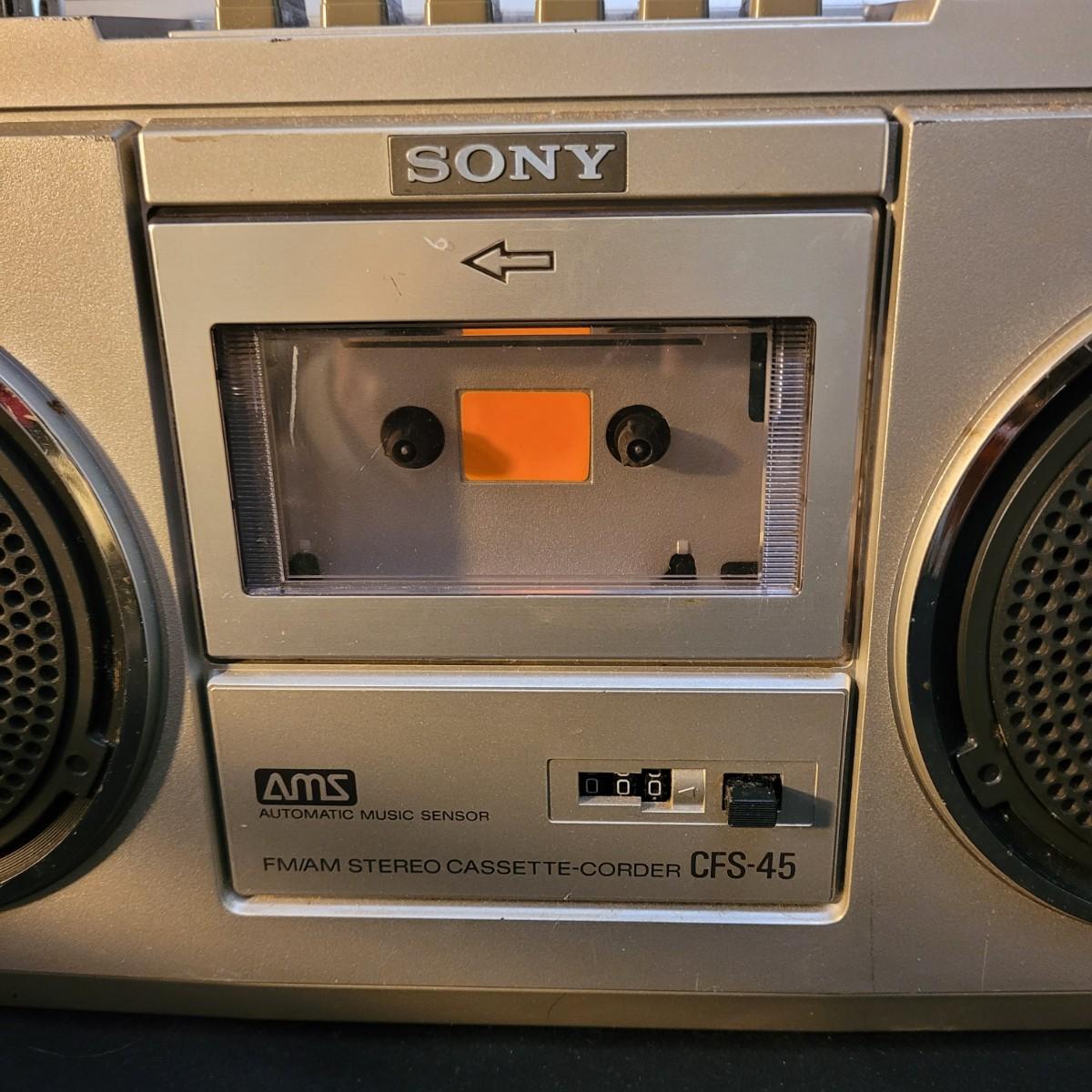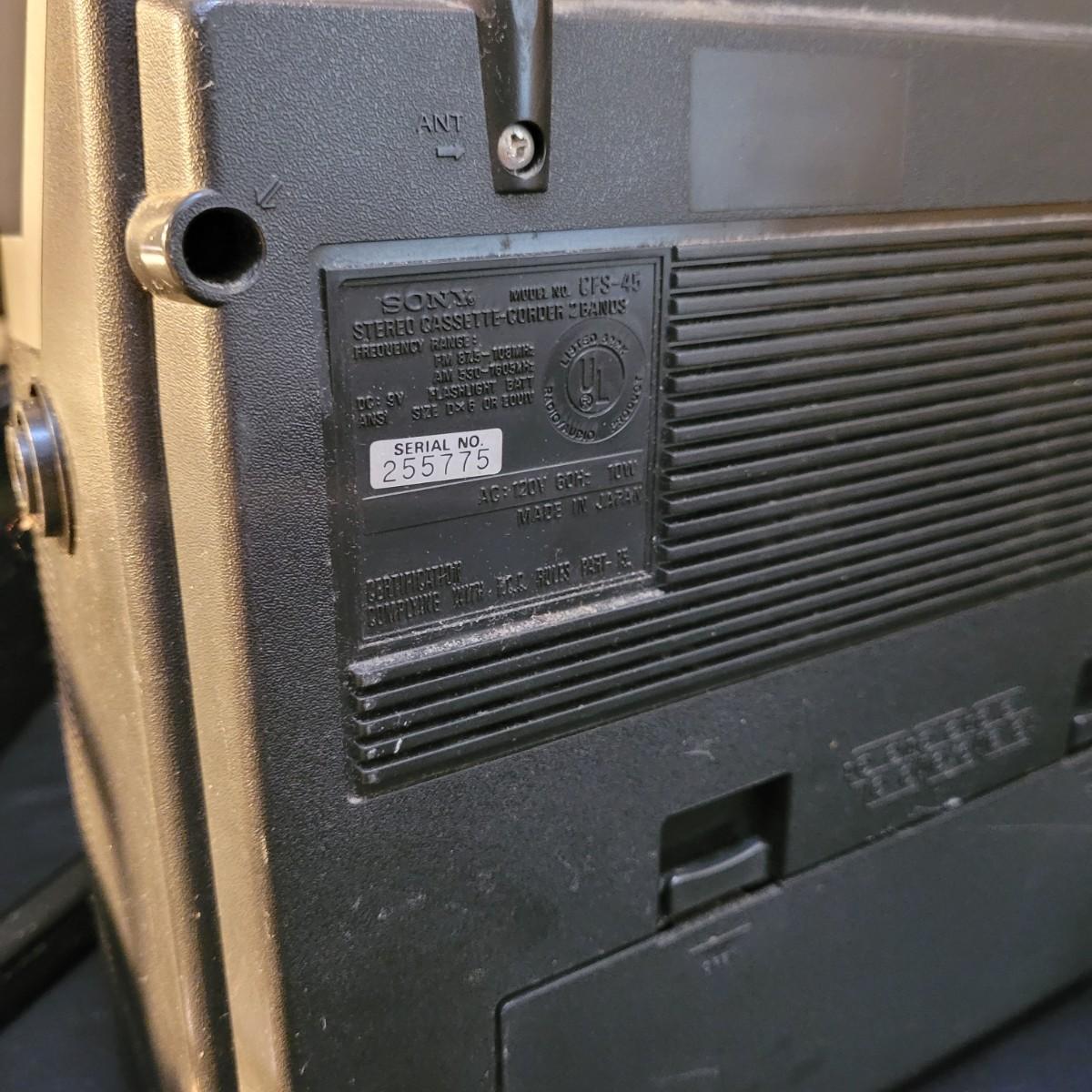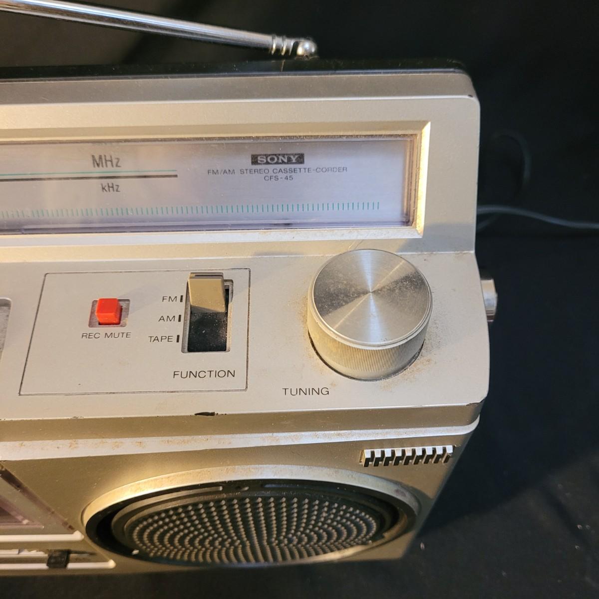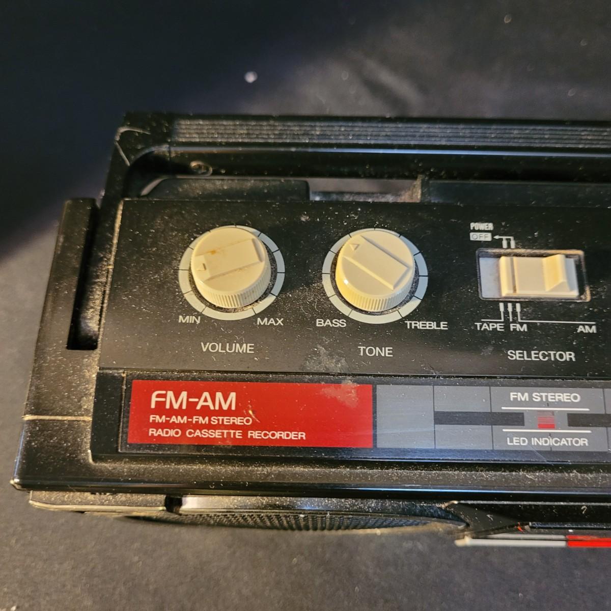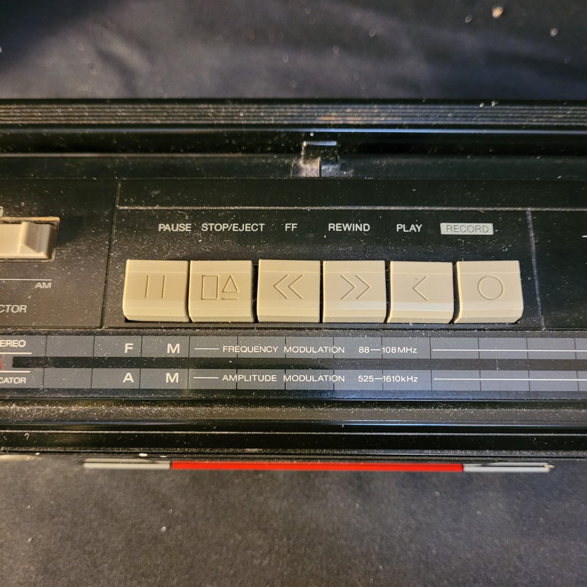 Two retro boomboxes by Sony and Panasonic. Radio played on both when powered on, but cassette players did not play when tested. Sony handle is damaged and does not stay on securely. Sony measures approximately 17” x 4.5” x 10”H, Panasonic 17” x 4” x 5”H. Some surface debris. Please see photos for details. Shipping available.