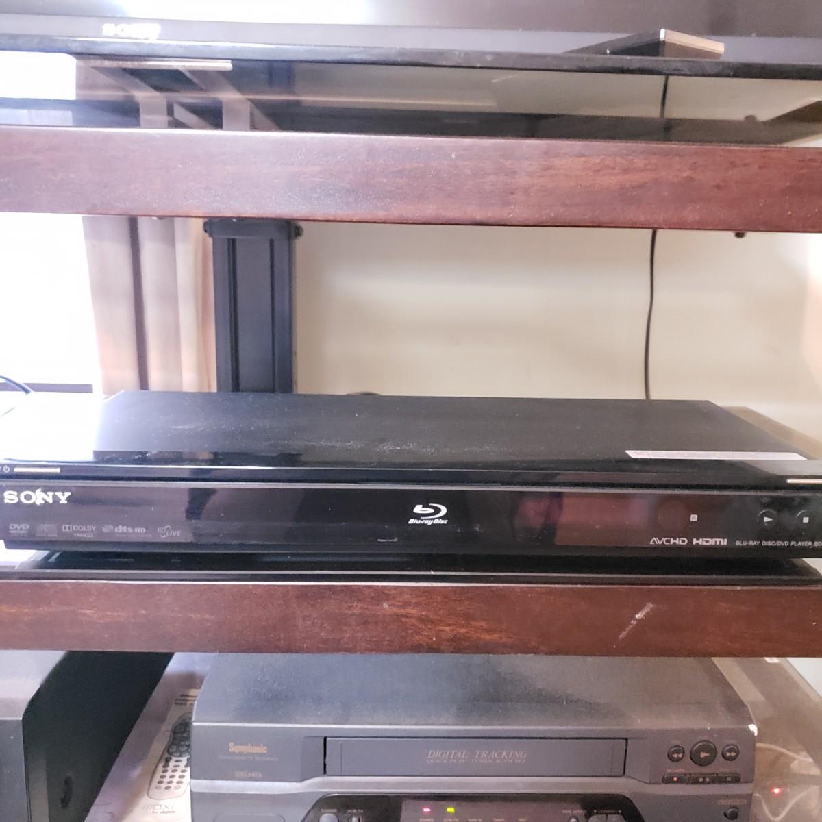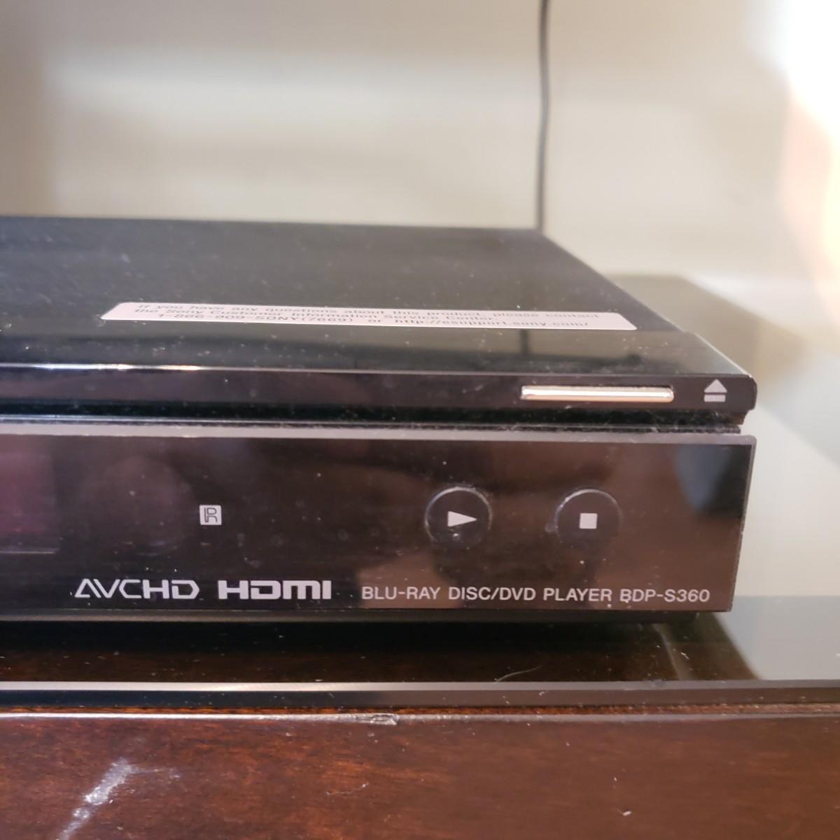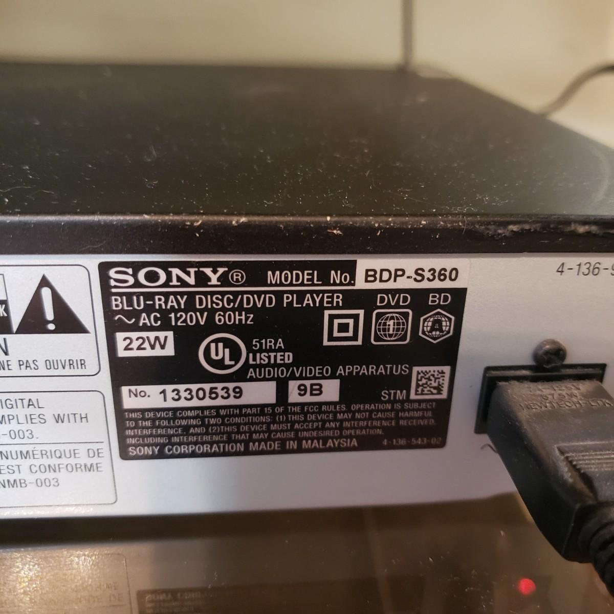 This is a Sony Blu-ray disc player with remote. The player powers on when plugged in. See pictures for model number and access panel information. This measures 17" x 8" x 2"H. This lot comes with an HDMI cord.