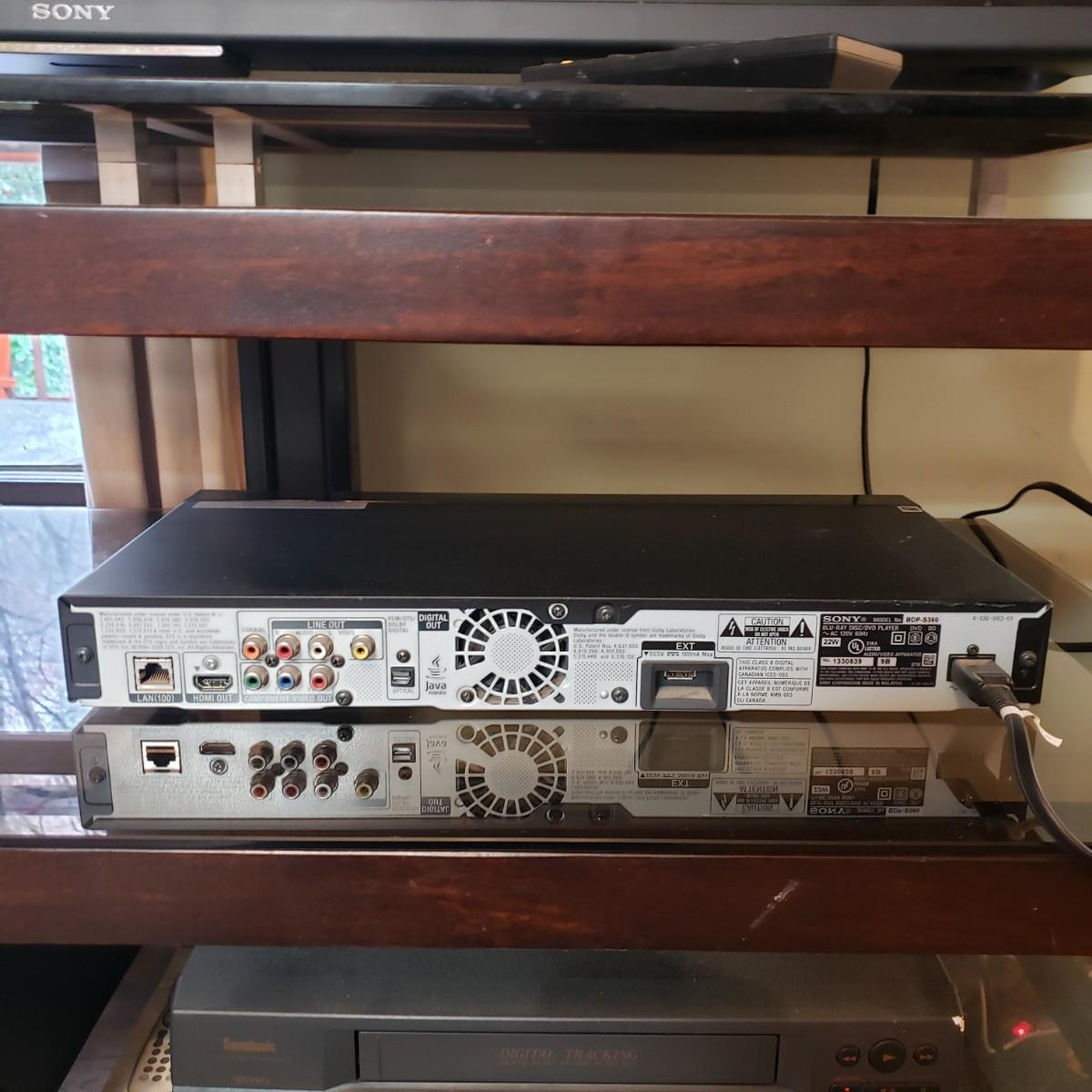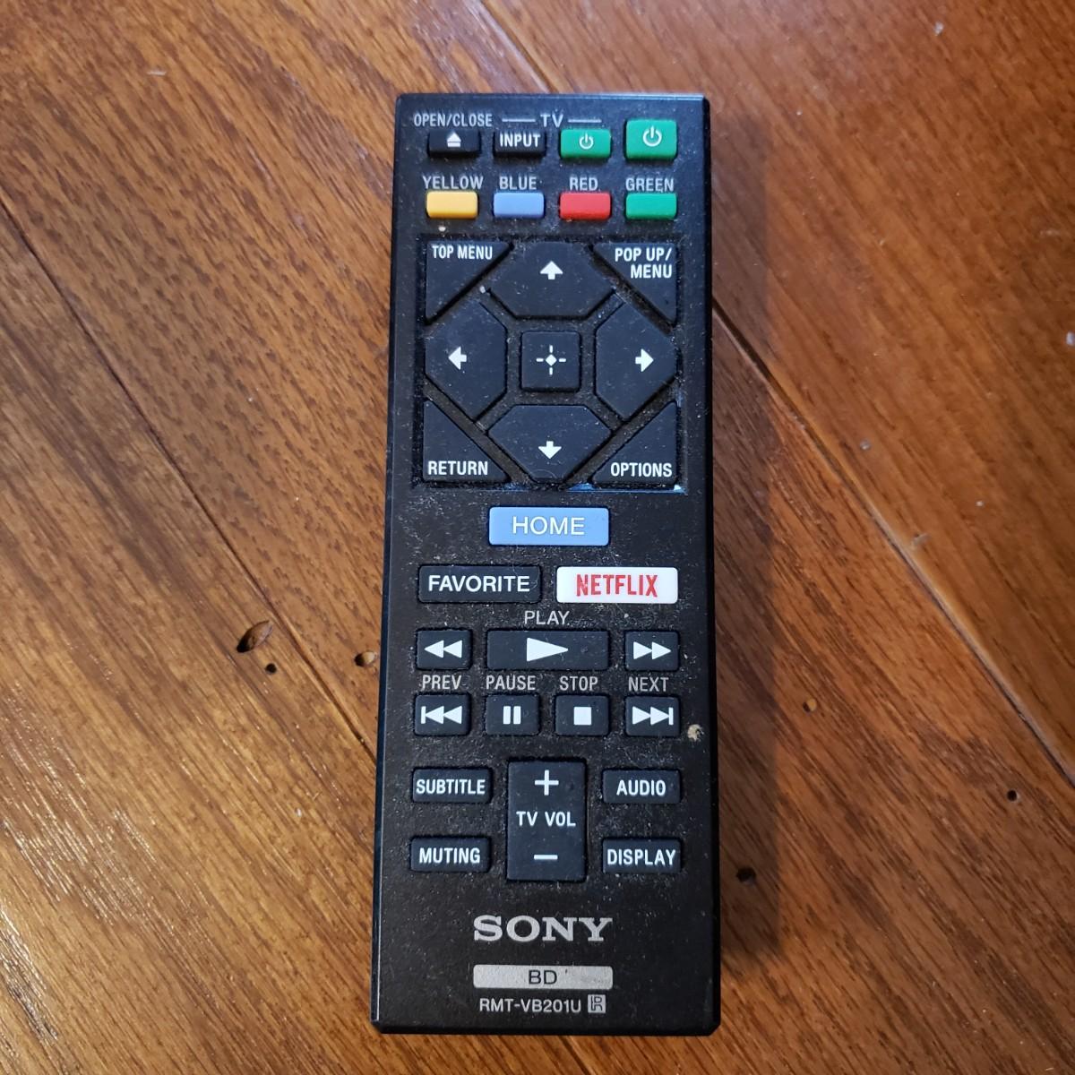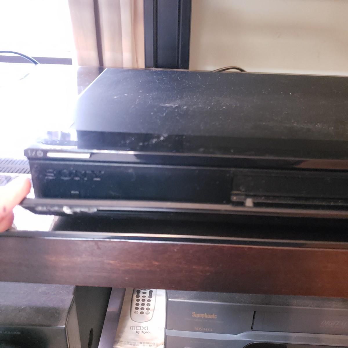 This is a Sony Blu-ray disc player with remote. The player powers on when plugged in. See pictures for model number and access panel information. This measures 17" x 8" x 2"H. This lot comes with an HDMI cord.