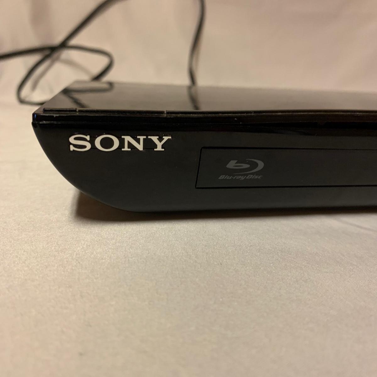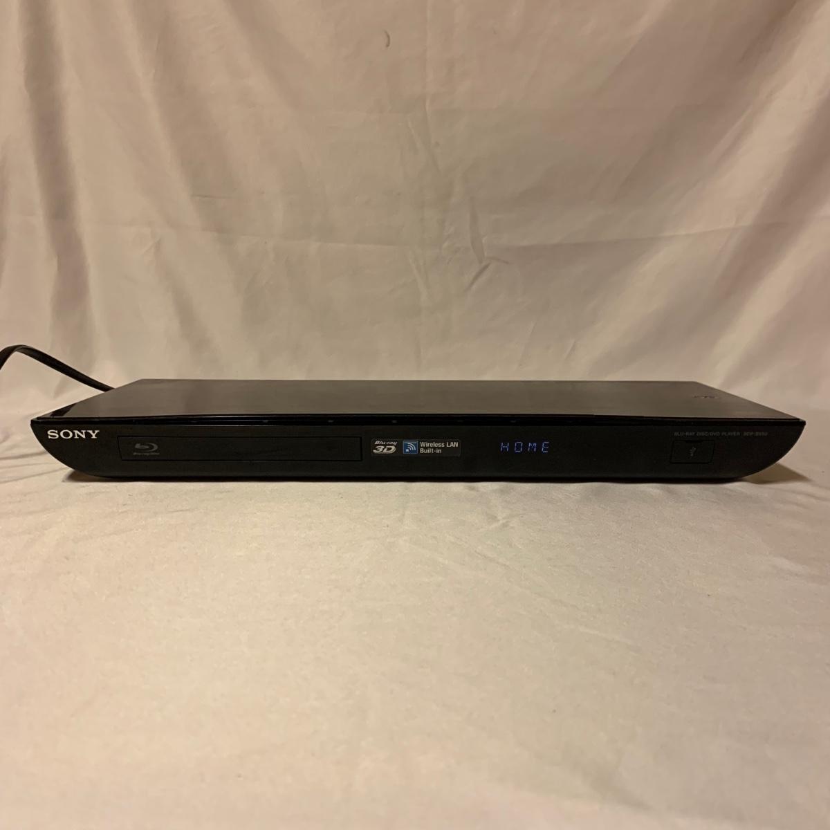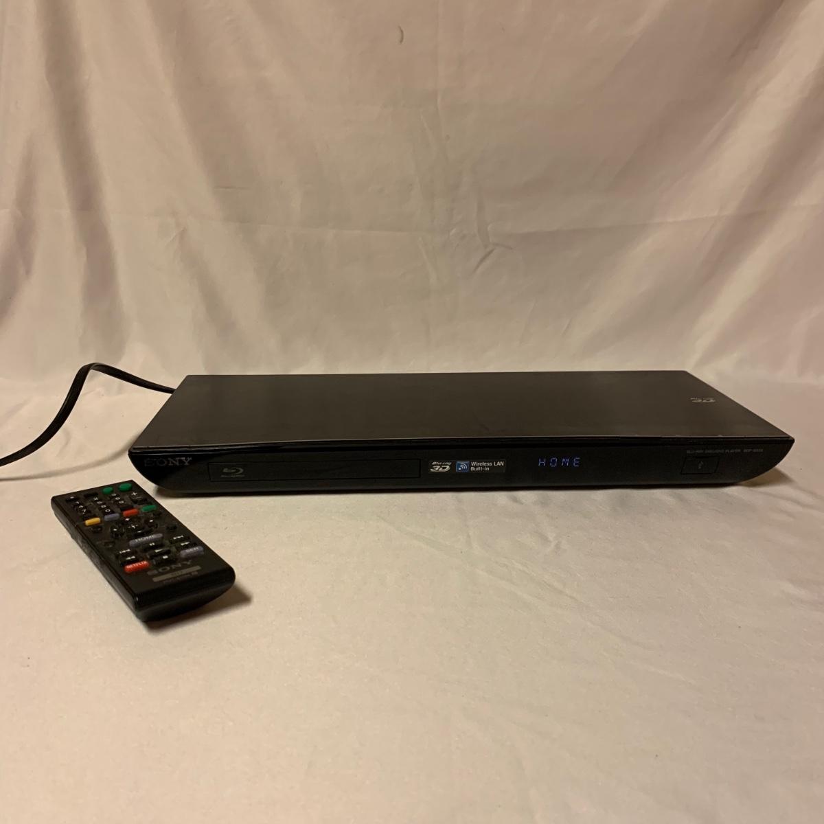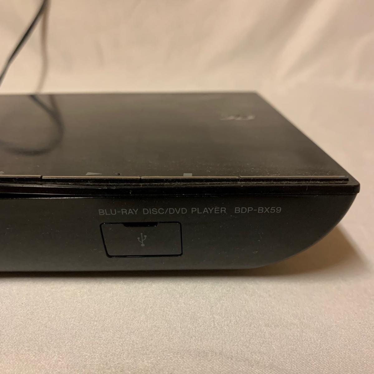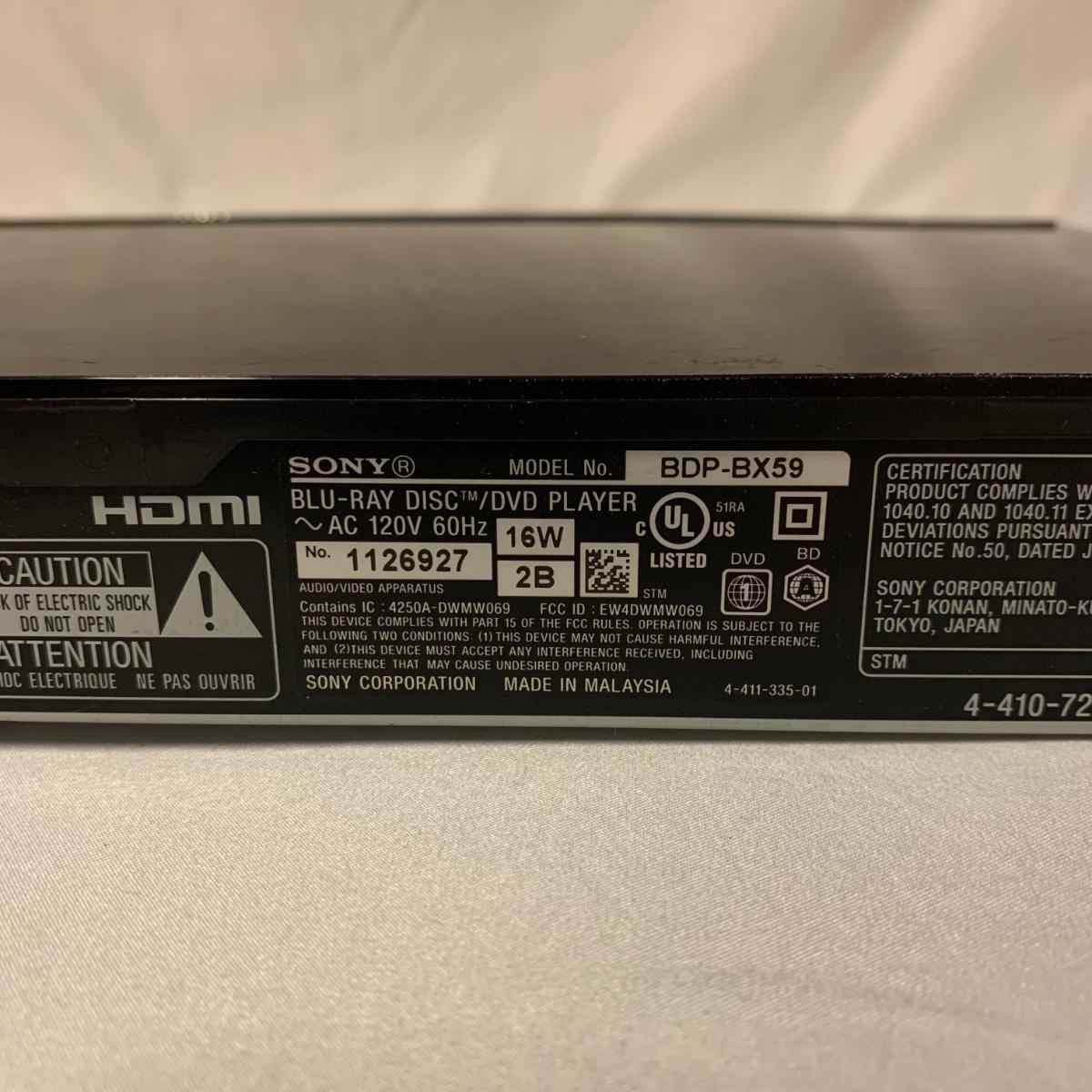 Sony Blu-Ray disc/DVD player, Model BDP-BX59. Comes with a remote. Player powered on when plugged in and remote functioned when tested. Player appears to be in good condition. Remote had tape on it, so it’s a bit sticky.