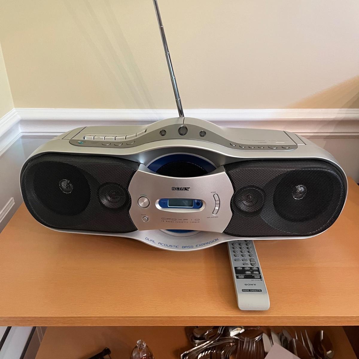 Lot includes a Sony Boombox with cassette recorder, CD player and AM/FM Radio and remote. Boombox powered on when plugged in. Boombox measures 12” x 20” x 8”H.