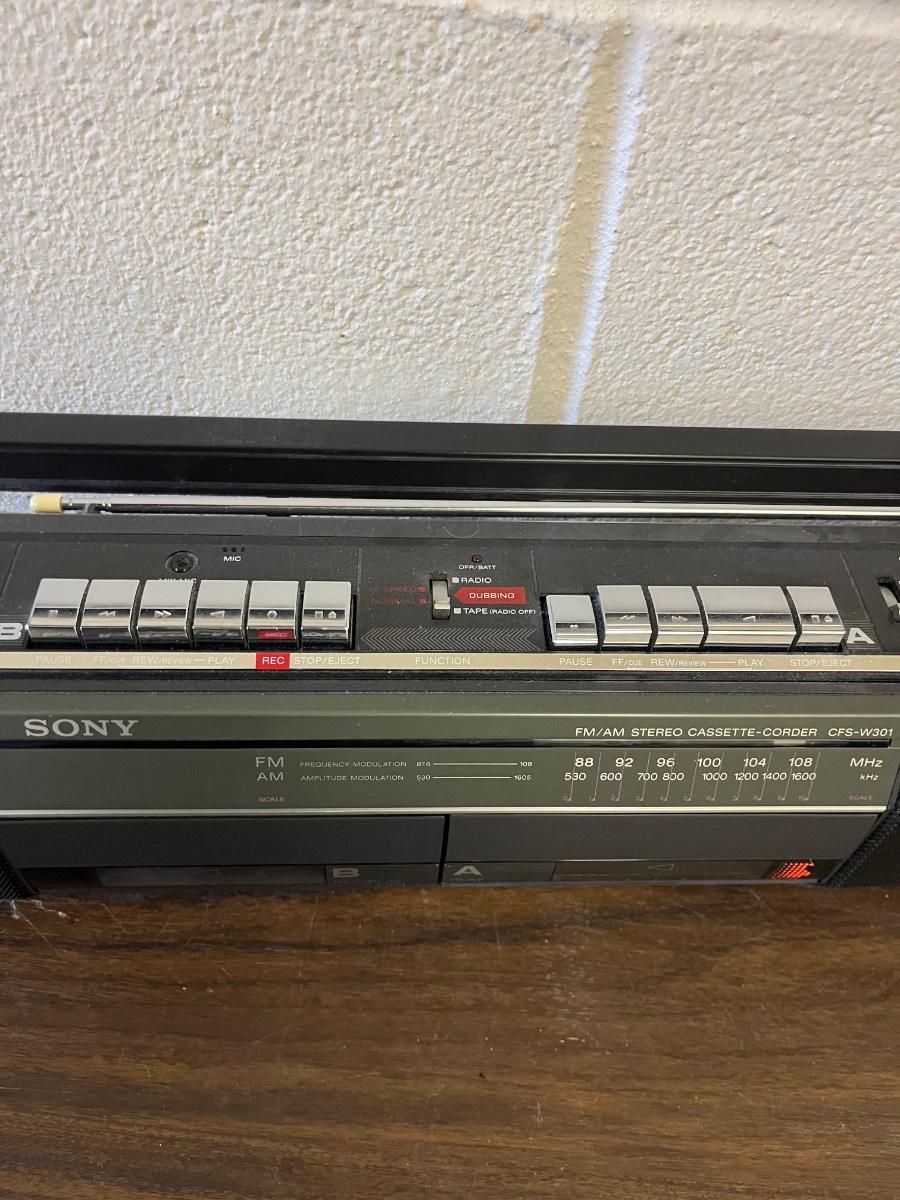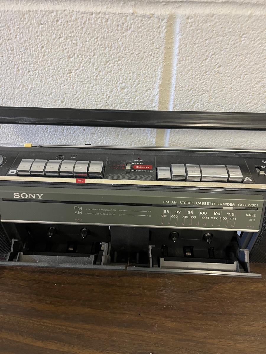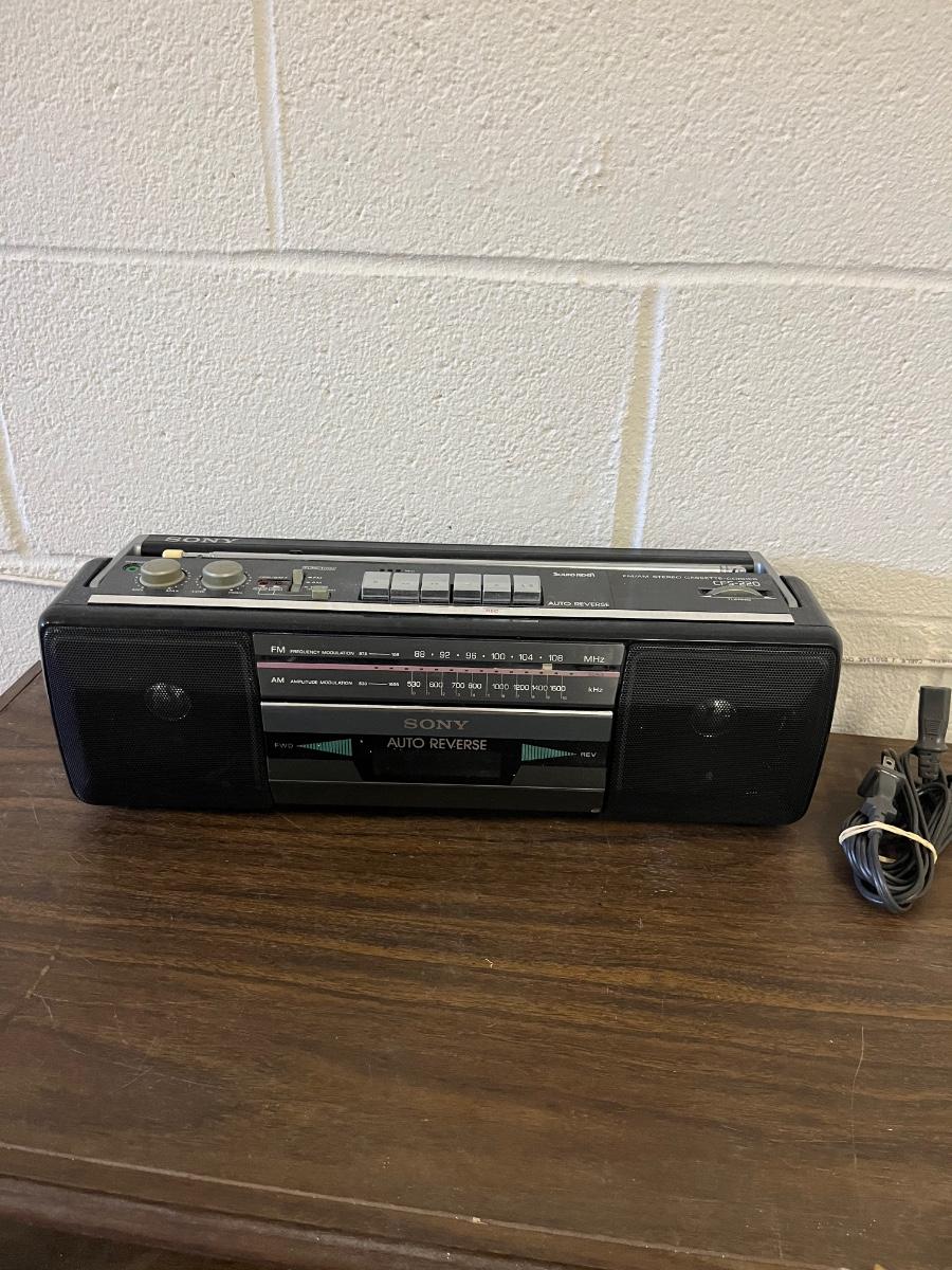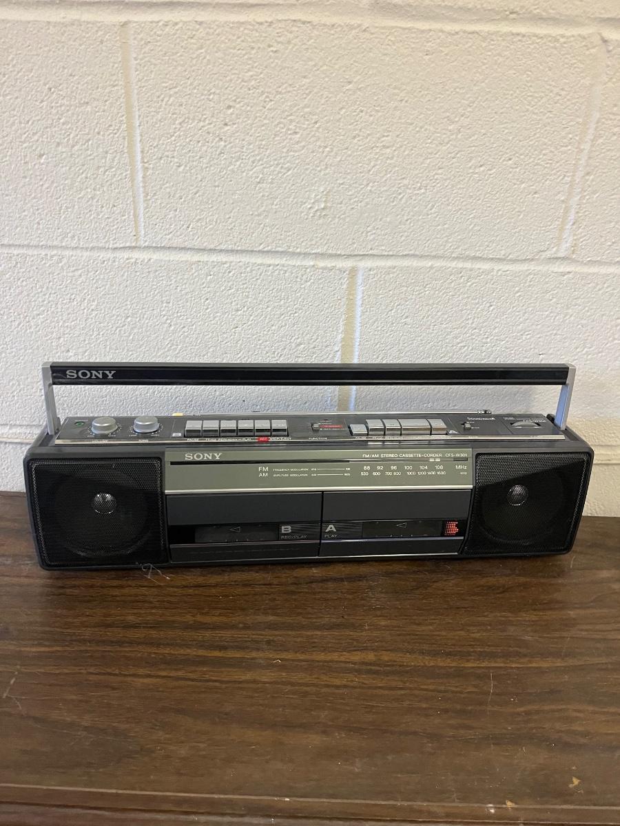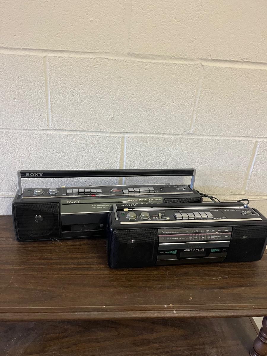 Lot includes a Sony boombox model# CFS-220 and Sony Boombox model # CFS W 301. Both radios powered on when plugged in. Largest boombox measures 20.5” x 5.5” x 8”H.