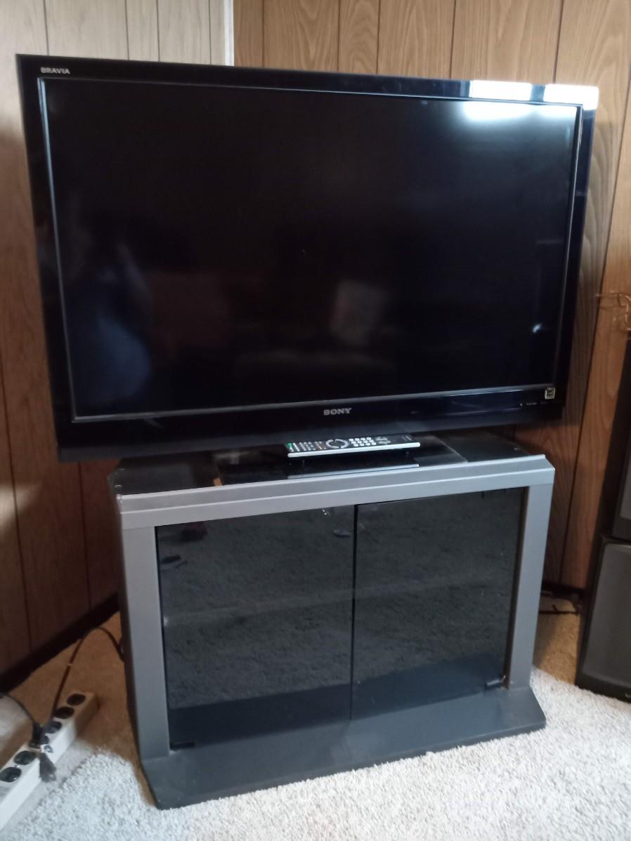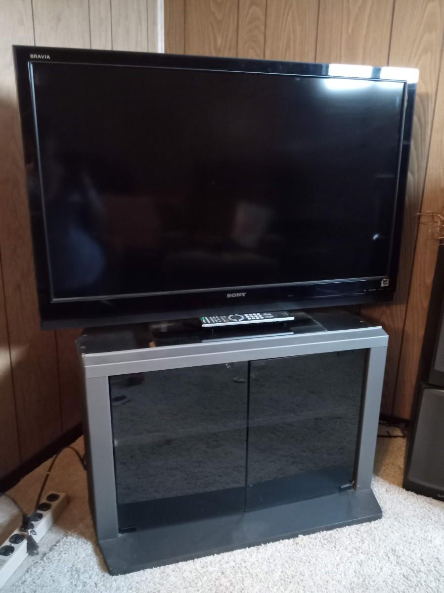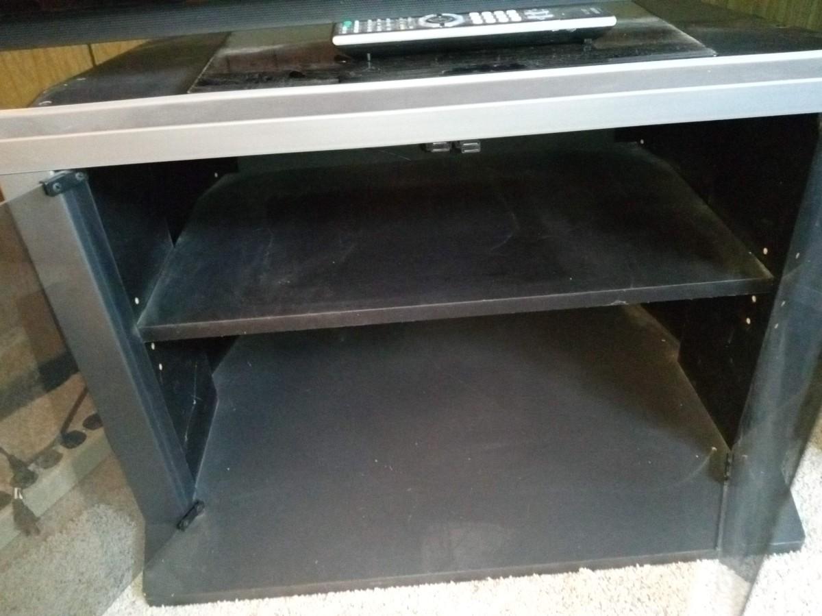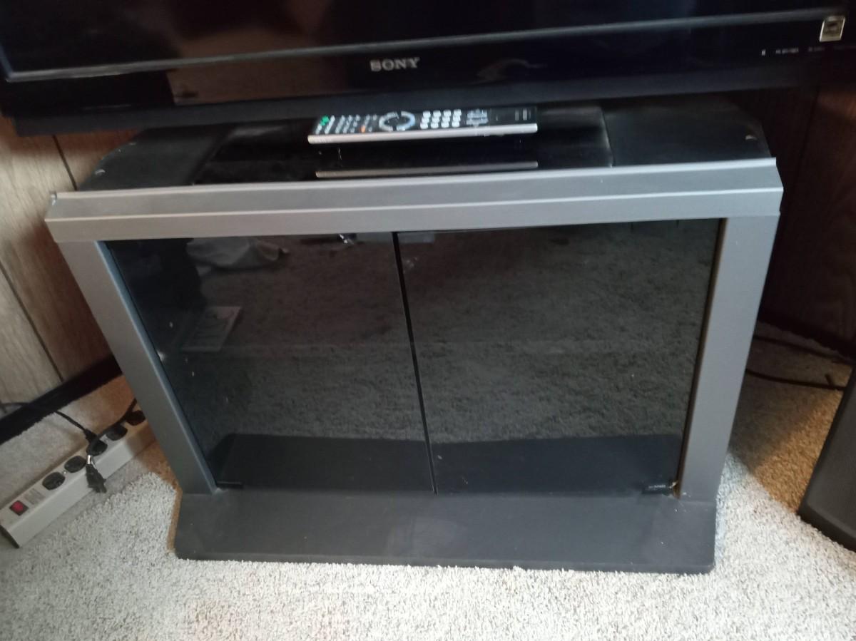 MEDIA STAND HAS GLASS DOORS AND MEASURES 32" X 20" X 19