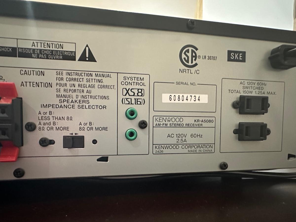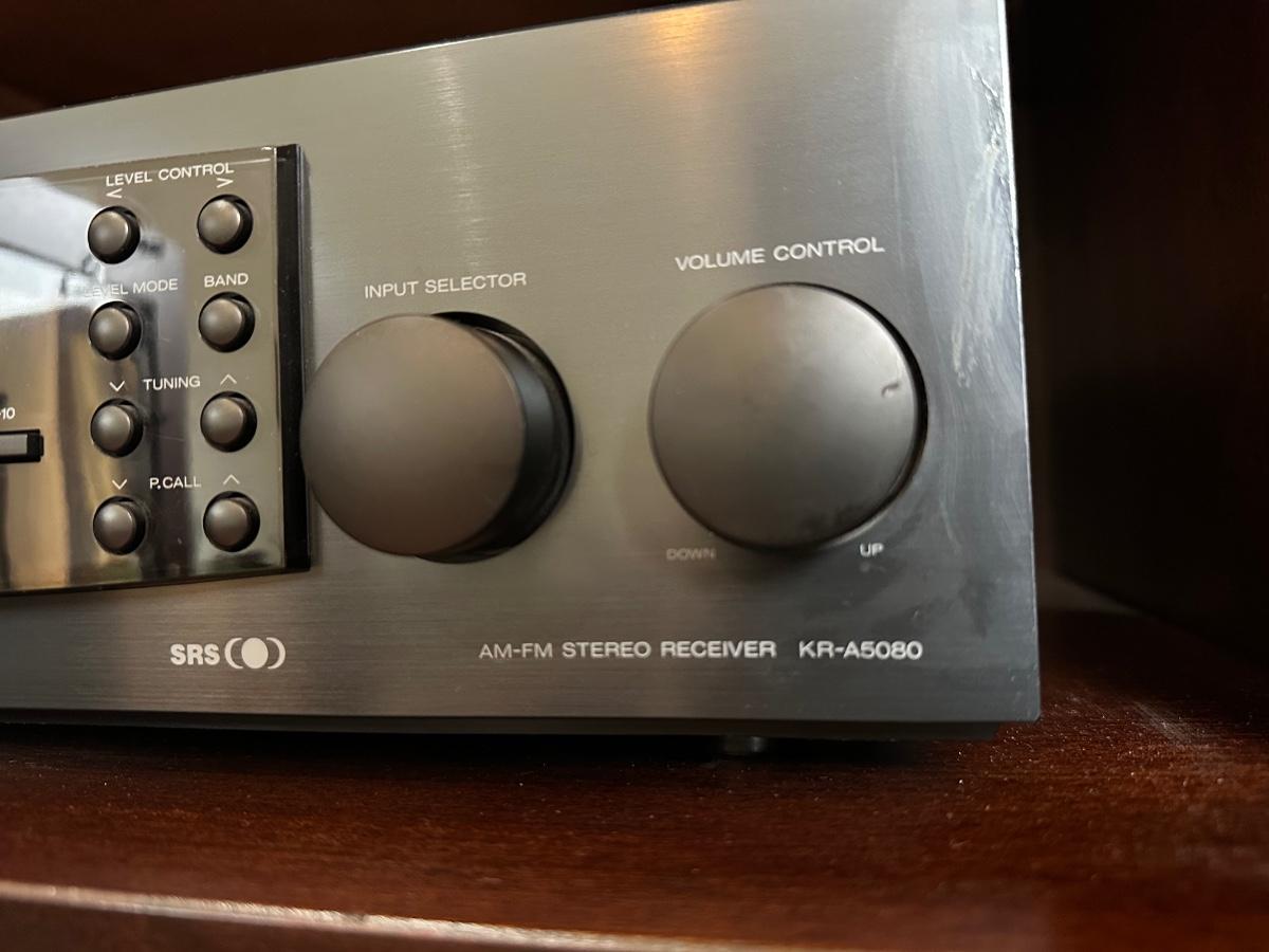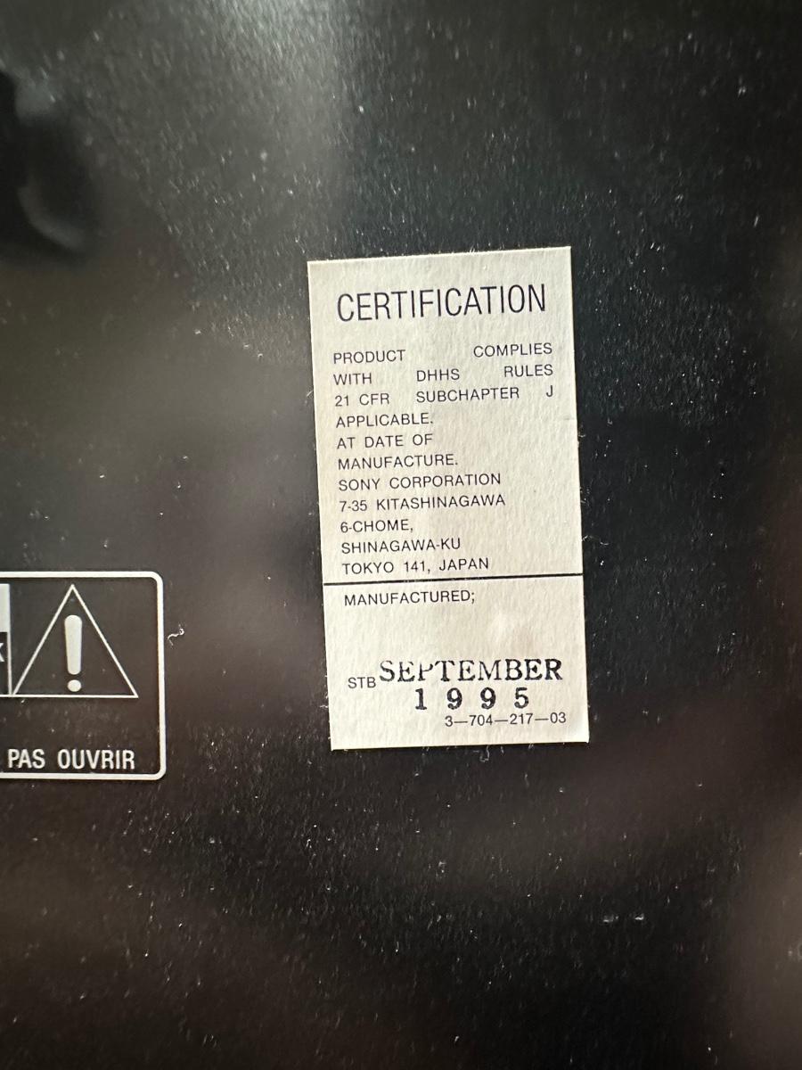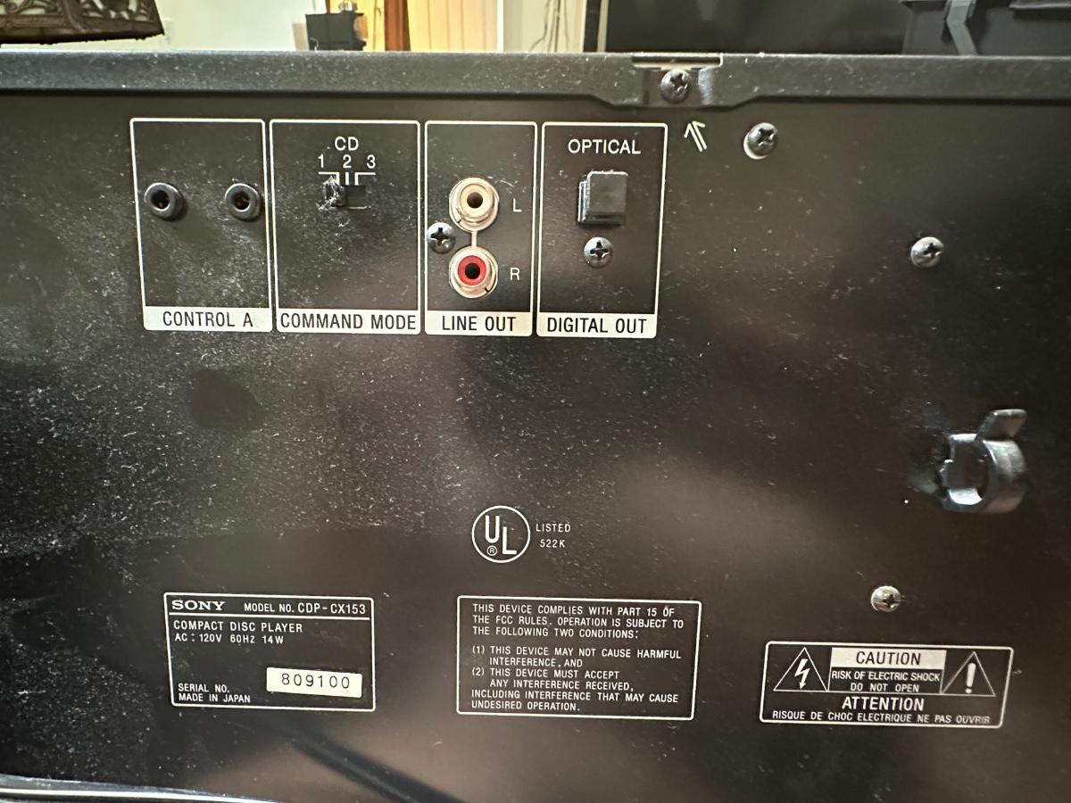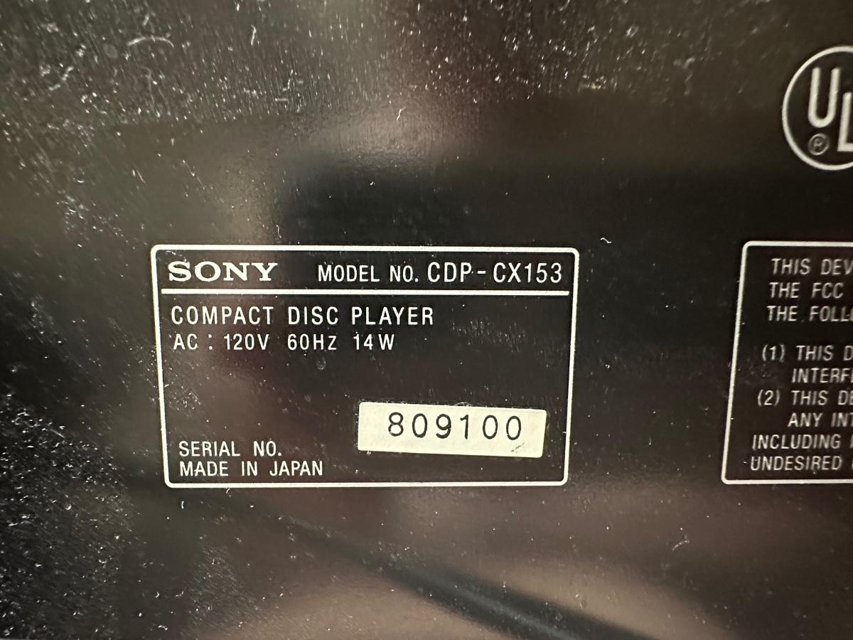 Sony CDP-CX153 100-disc compact disc player, made in Japan, manufactured September 1995. Features disc carousel, display window, and multiple playback modes. Includes Kenwood AM/FM stereo receiver (model KR-A5080) with input selector, volume control, and radio tuner.