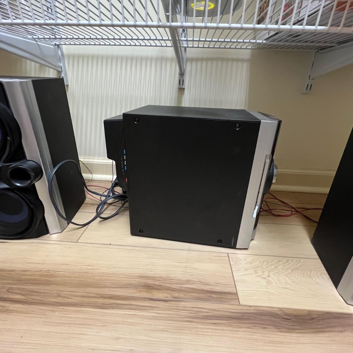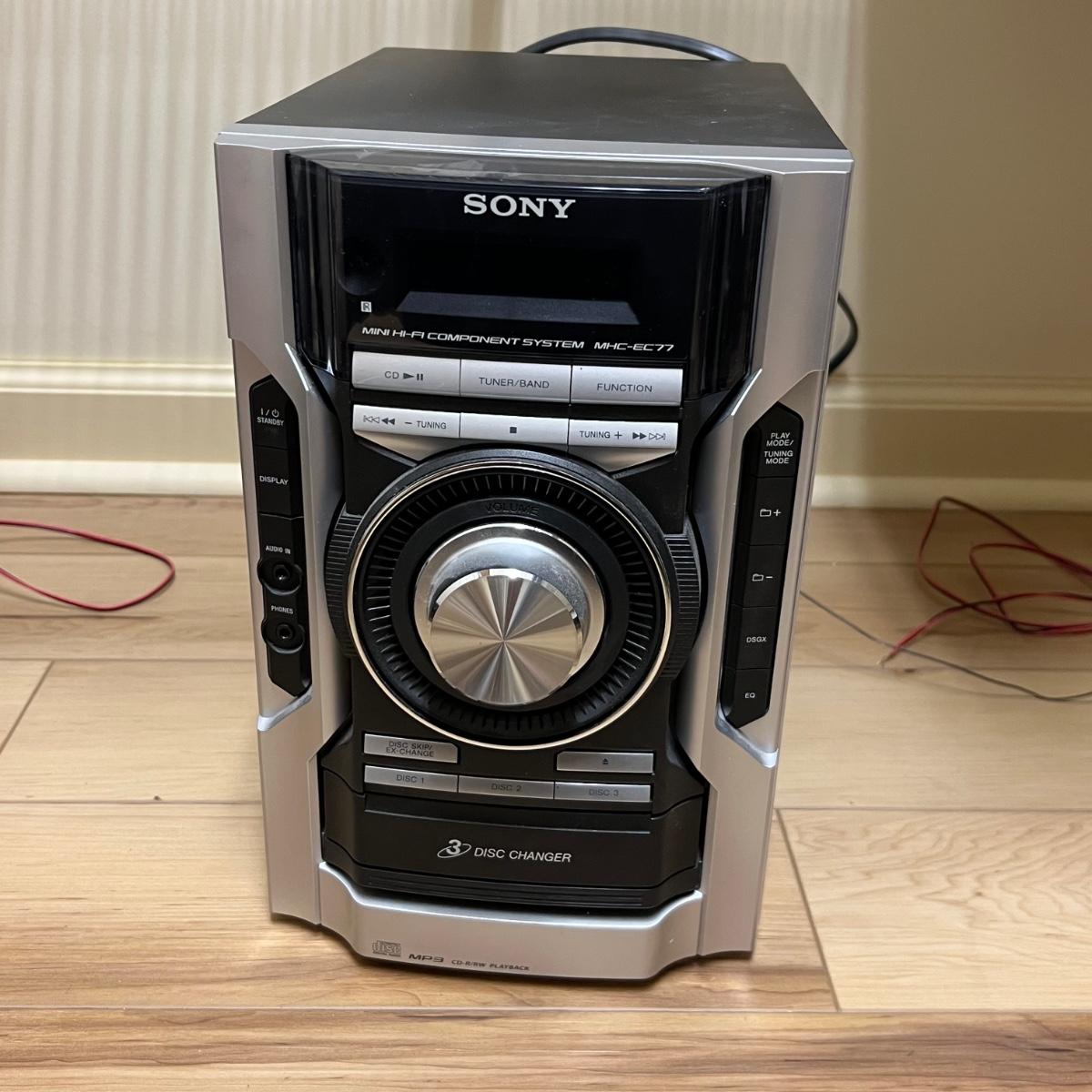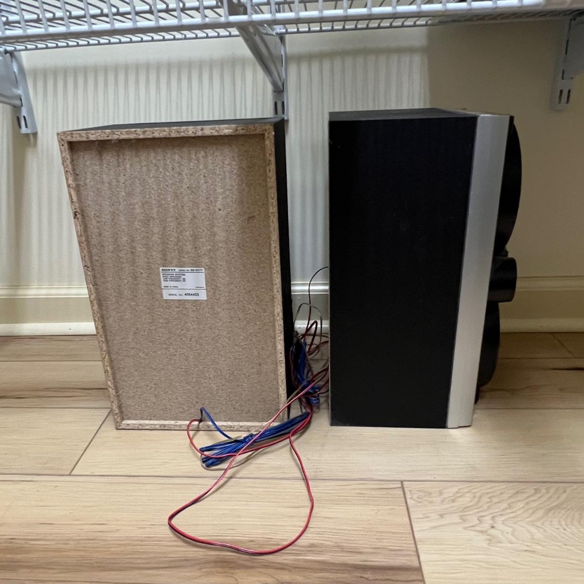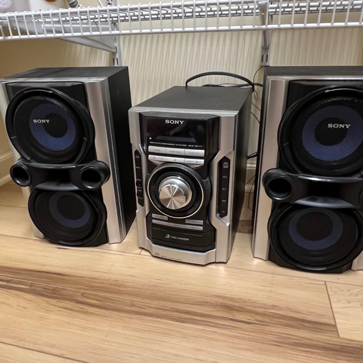 This Sony receiver powered on when plugged in but is currently not attached to the speakers so sound was not tested; These three items are model EC77. Stereo measures approximately 8" x 13" x 13"H.
