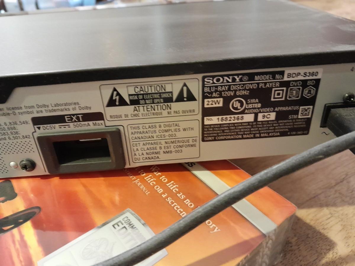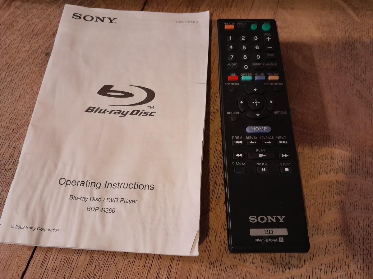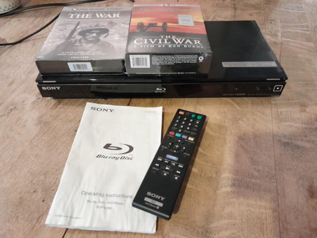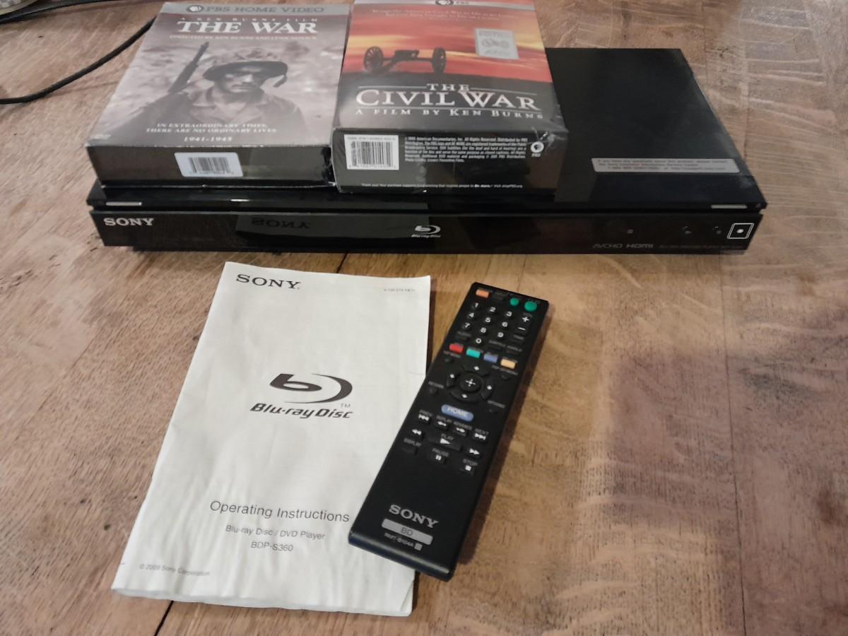 SONY DVD / BLU-RAY DISC PLAYER MODEL BDP-S360 AND REMOTE WITH WAR DOCUMENTARIES ON DVD AND INSTRUCTION BOOK.