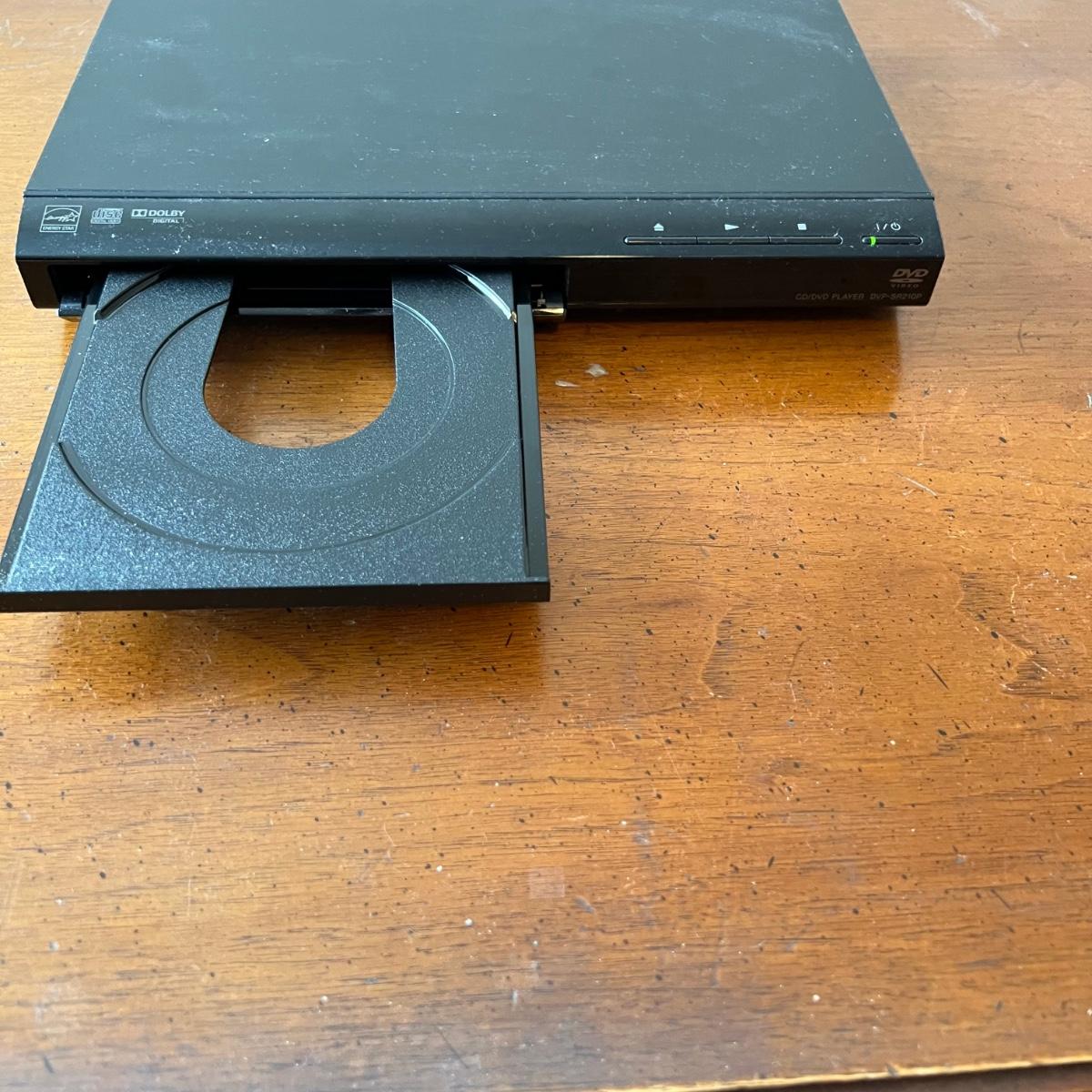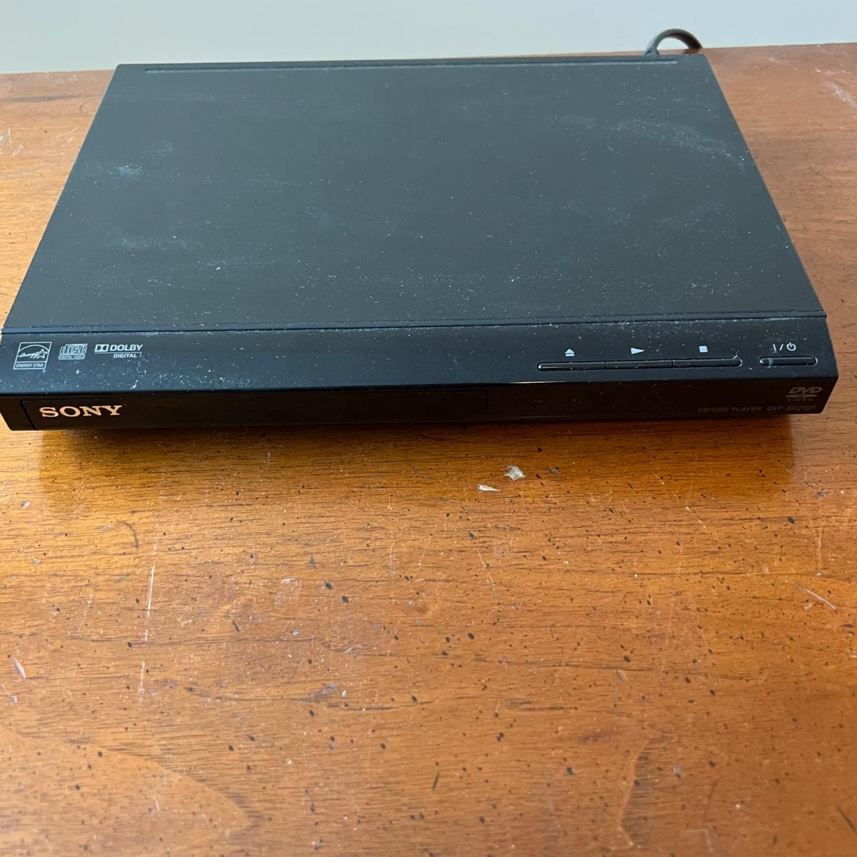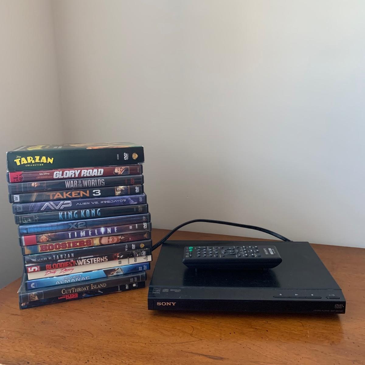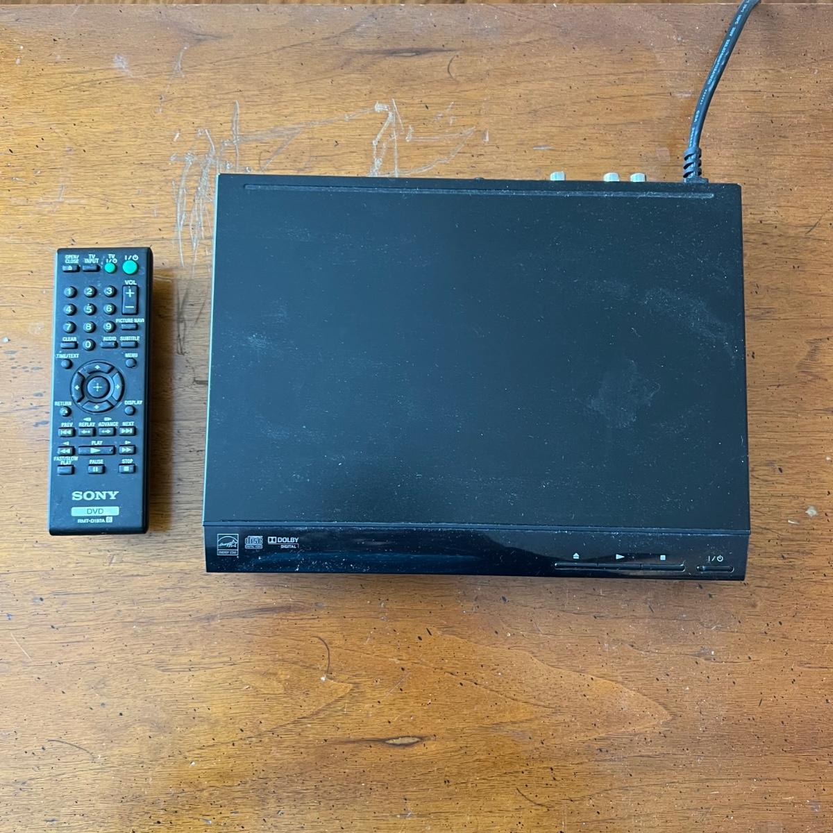Sony DVD player. Powered on and controlled by remote when plugged in. 15 DVDs included as well.