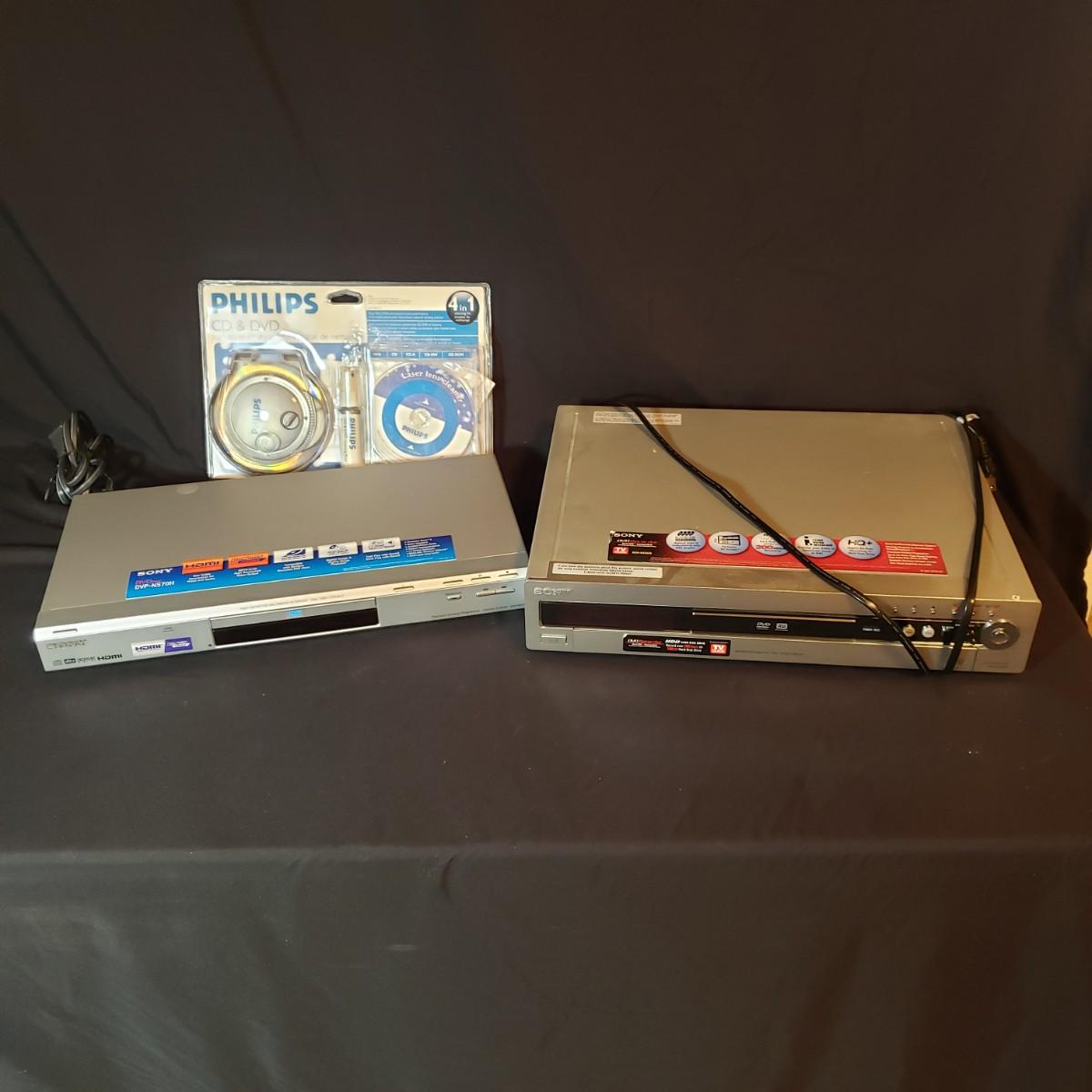 This three piece lot contains a Sony DVD recorder, a Sony DVD player and a Philips CD and DVD cleaning kit. Both machines powered on when plugged in. The cleaning kit has been opened, but does not appear to have been used. There are no remotes with these machines.