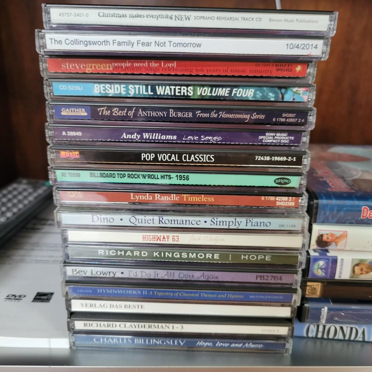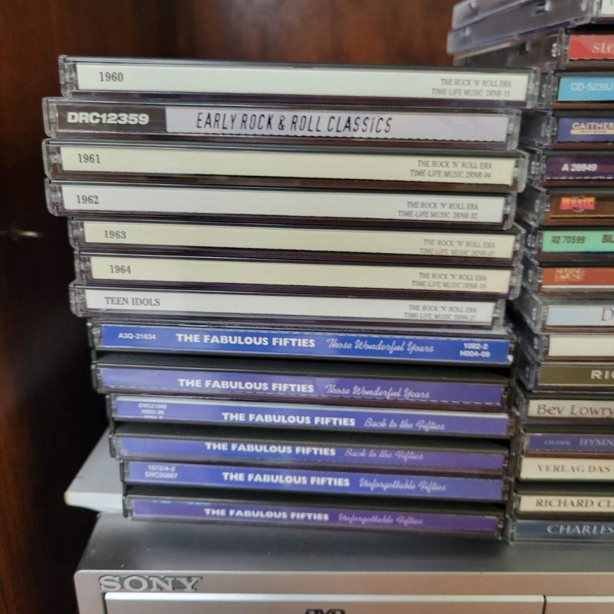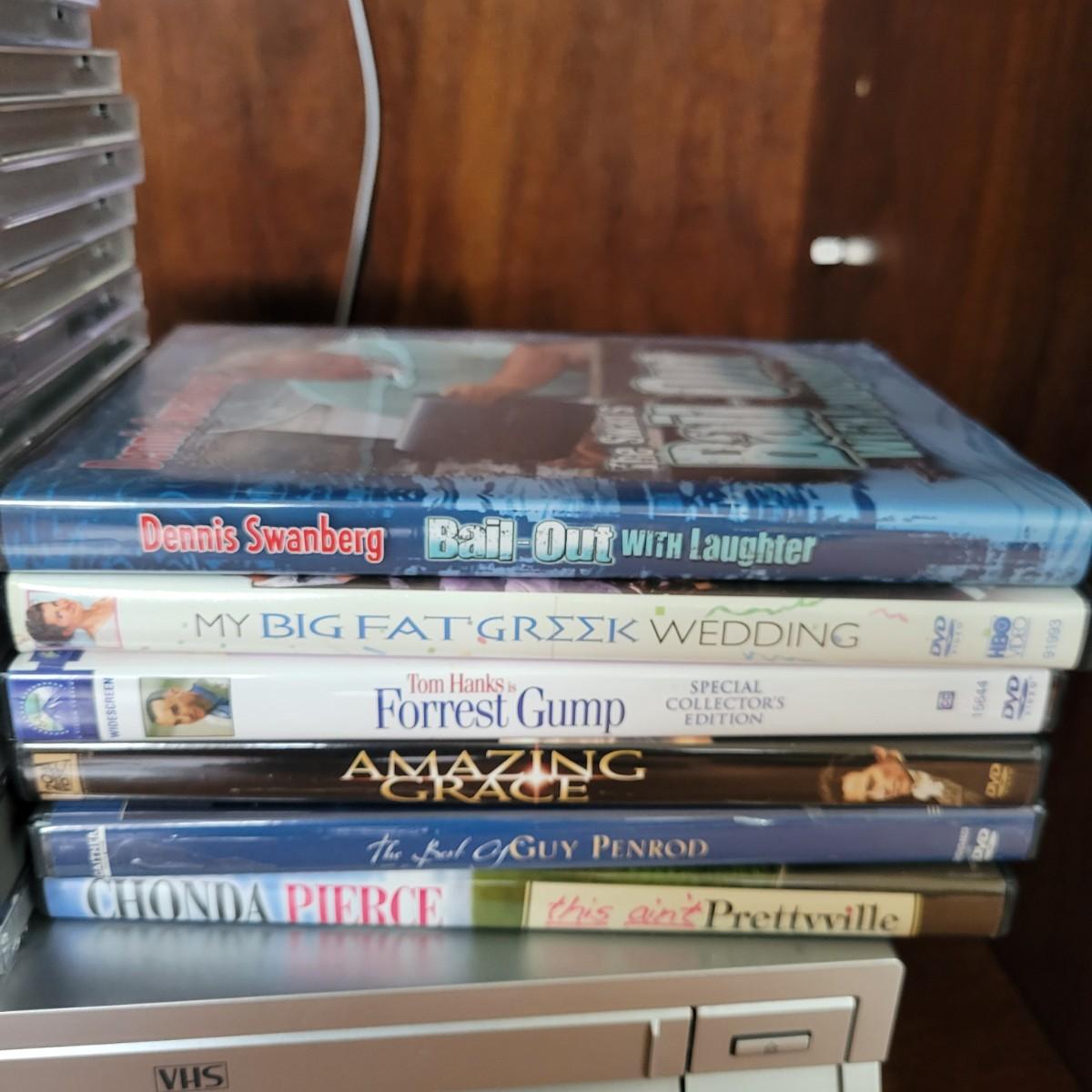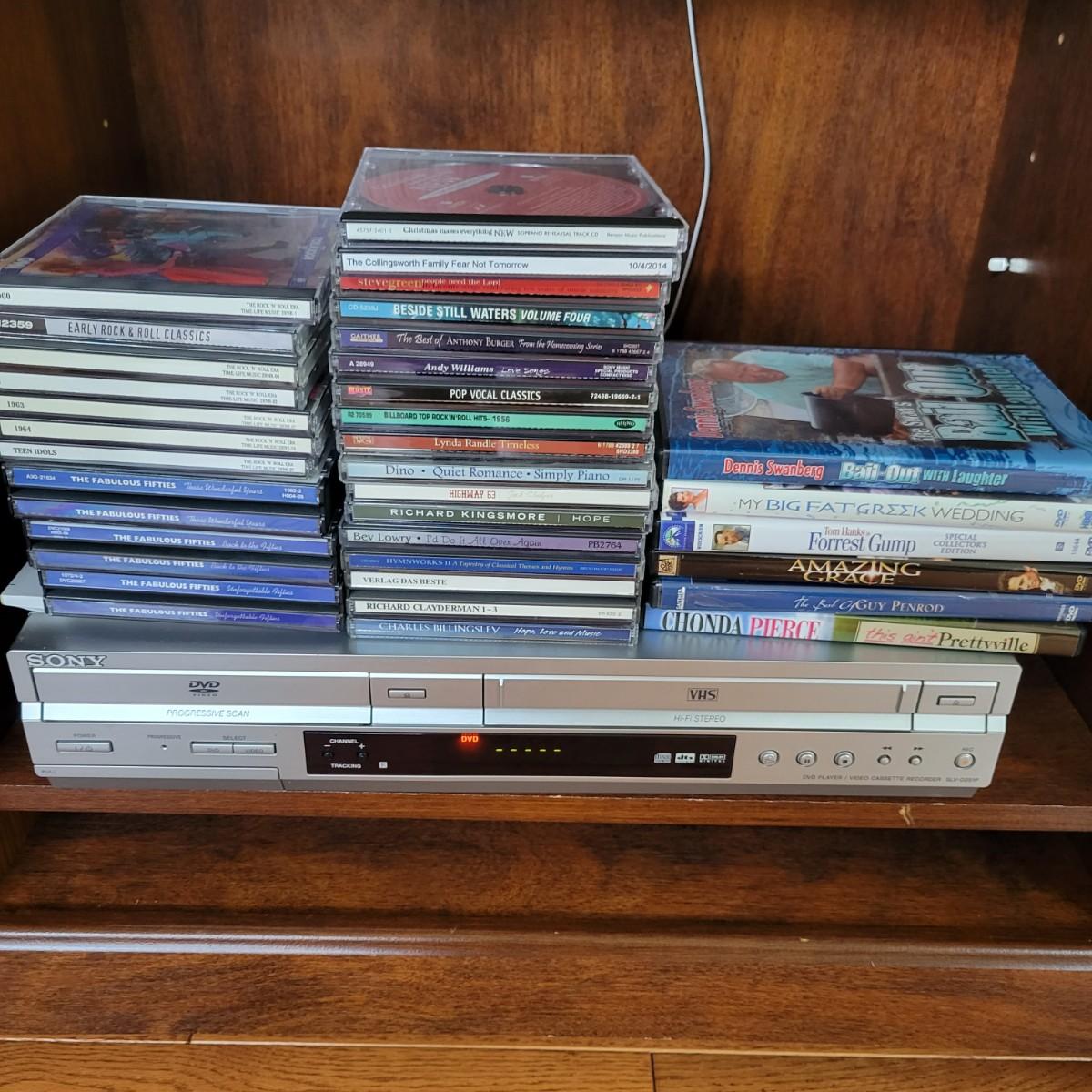 A Sony DVD/VHS player that powered on when plugged in. It includes a remote and measures approximately 17" x 11" x 3.5"H. Also included an assortment of CDs and DVDs with titles like Forrest Gump, My Big Fat Greek Wedding, Andy Williams and more. Shipping available