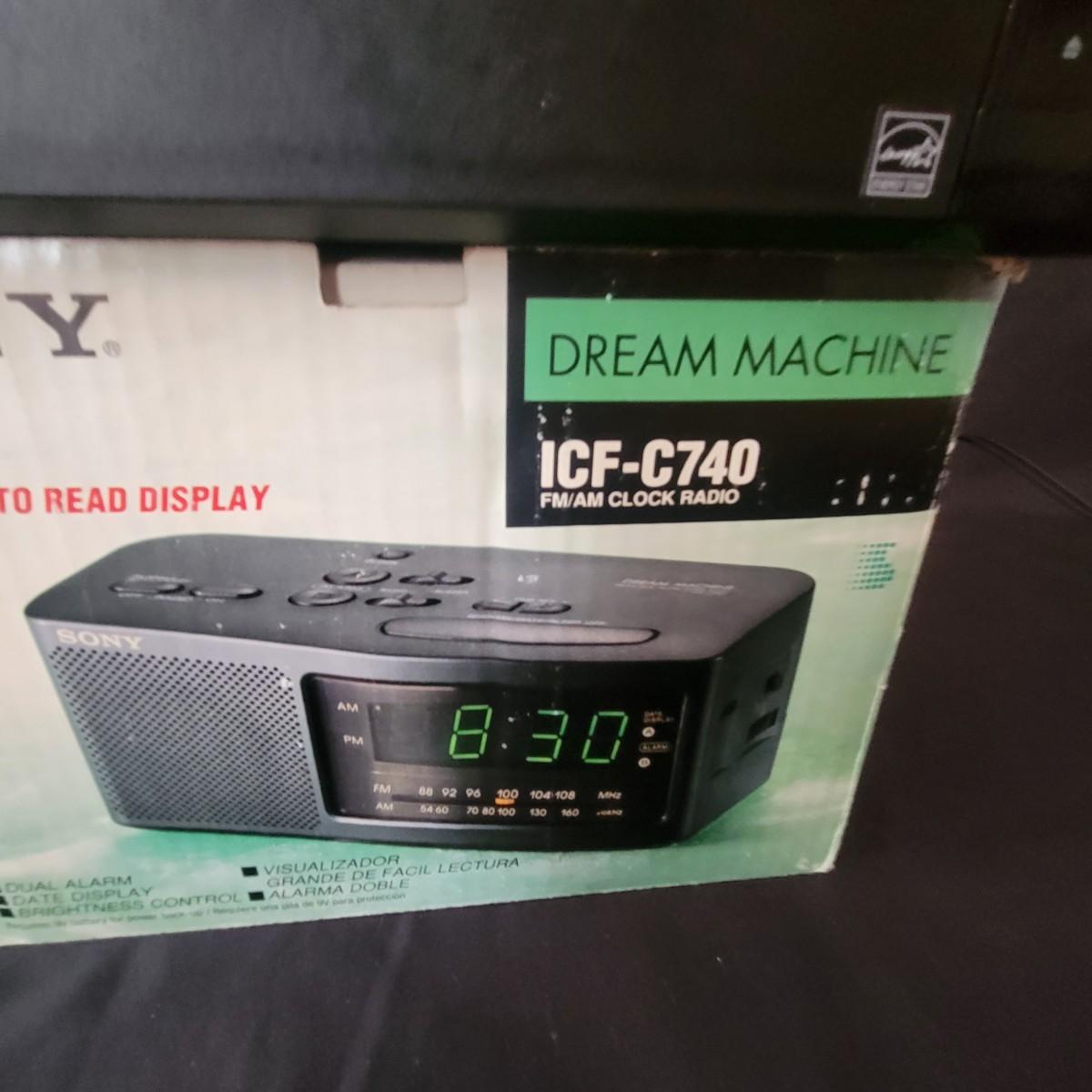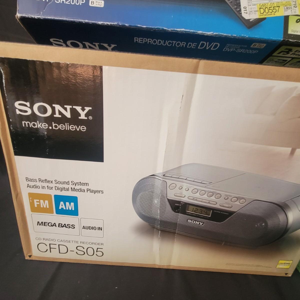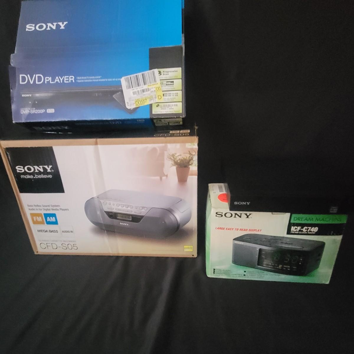 Four Sony electronic items, 3 of which are new and in their original packaging. Includes a DVD player, a CD/radio/cassette recorder, a dream machine alarm clock radio, and a used DVD player. Used item was tested and powered on. Local pickup only