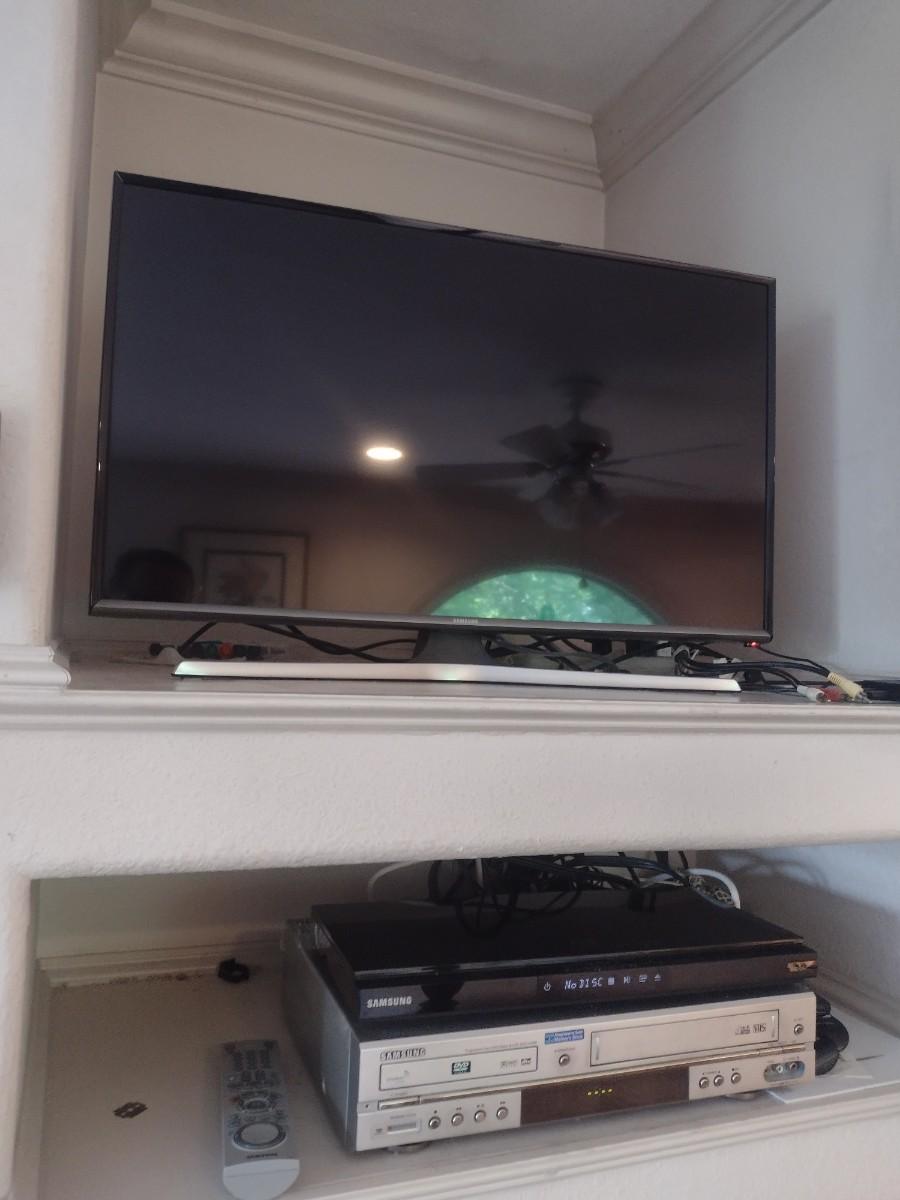 Sony Flat Screen 30" Smart TV with Samsung Blue Ray DVD and VHS Players. DVD and VHS players untested. Upstairs items