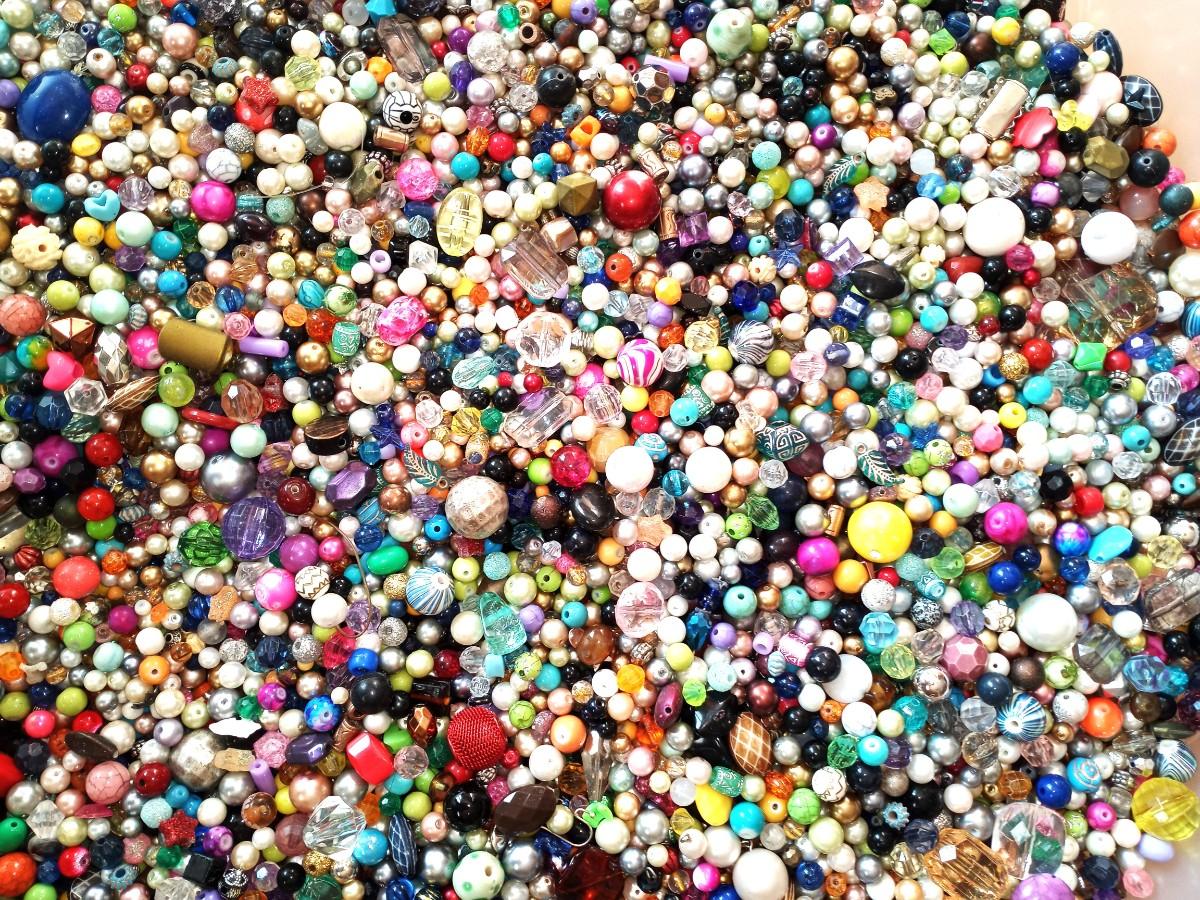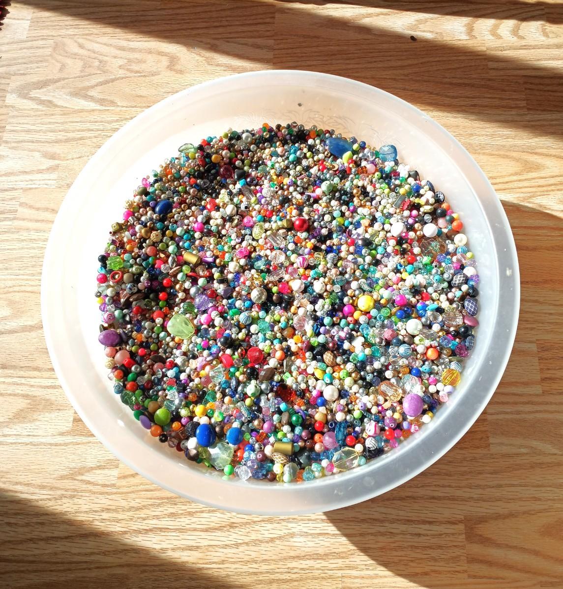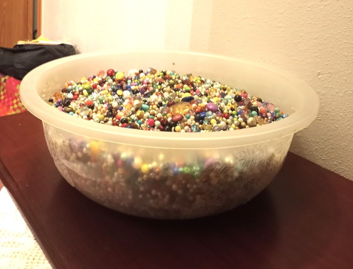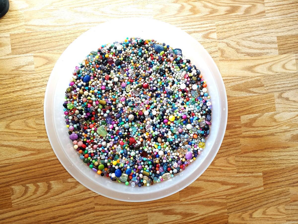 VERY LARGE QUANTITY OF BEADS. ALTHOUGH THE MAJORITY MAY BE MADE OF PLASTIC YOU WILL ALSO FIND CERAMIC-GLASS-META AND-PEARLS THE BOWL IS 18" ACROSS AND BEADS ARE APPROX. 5" DEEP. THATS ALOT OF BEADS!!