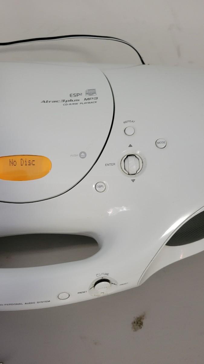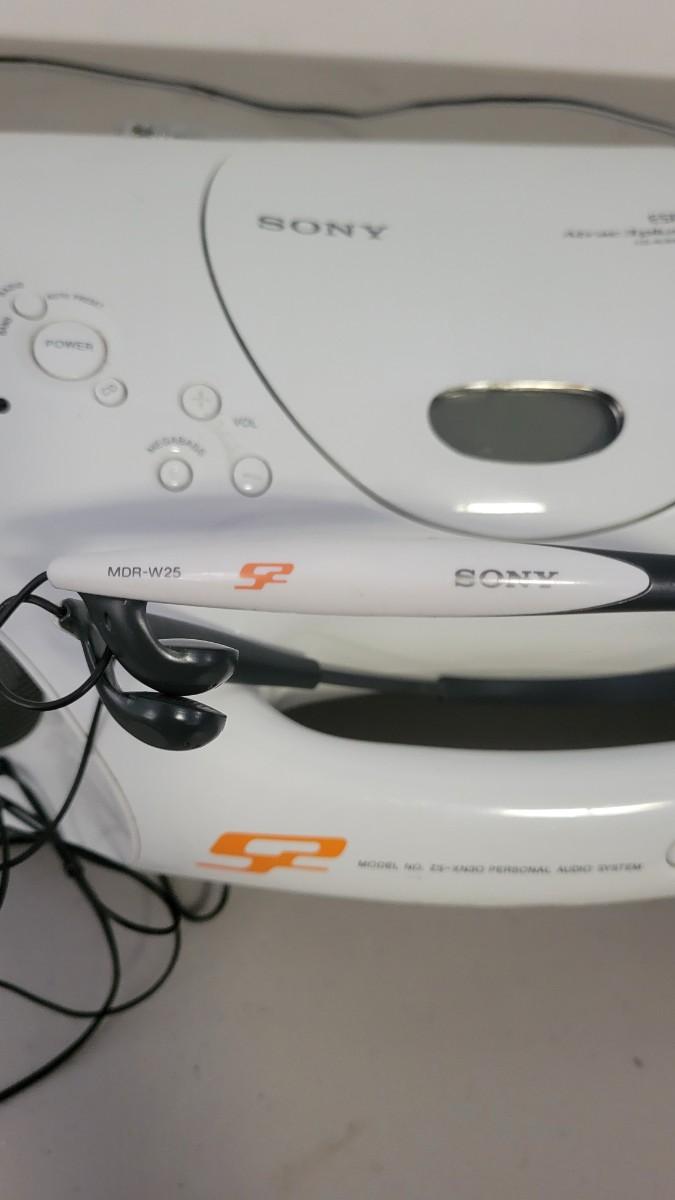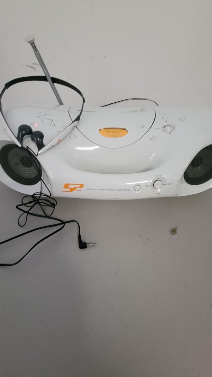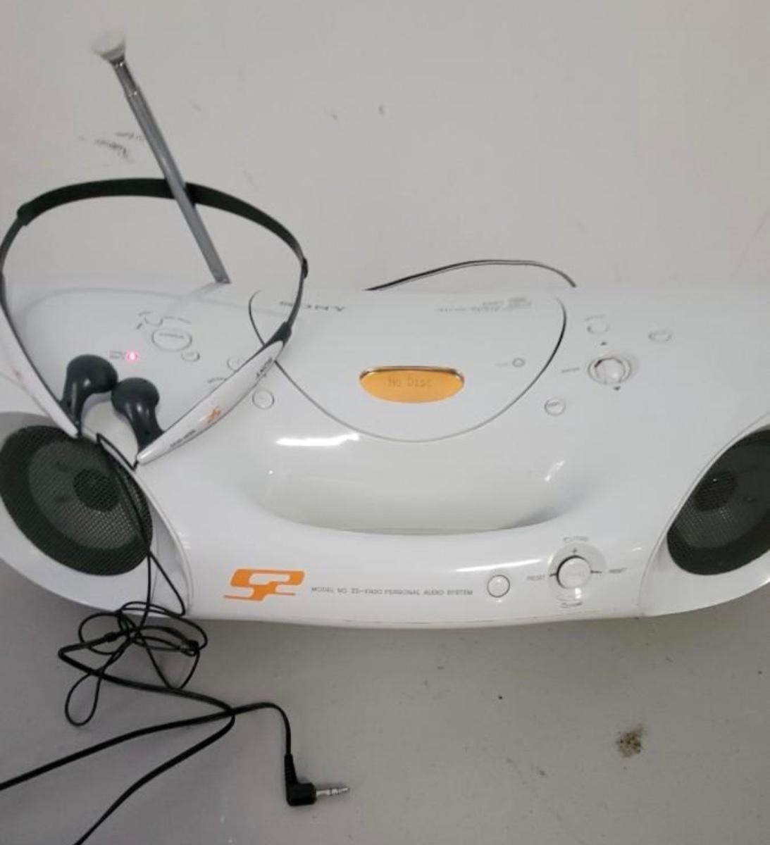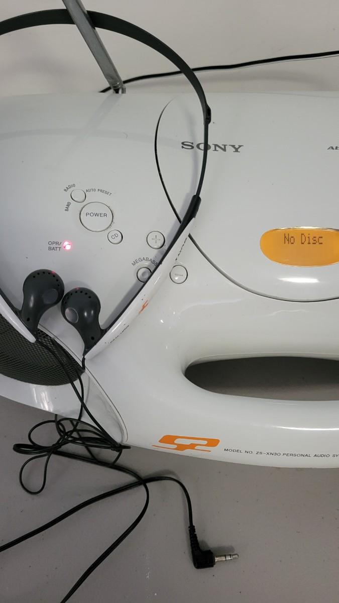 Sony portable CD player and matching headphones. Audio system has a CD player and tuner and includes a set of headphones. Unit powered on at testing. Measures approximately 20" x 11" x 6"