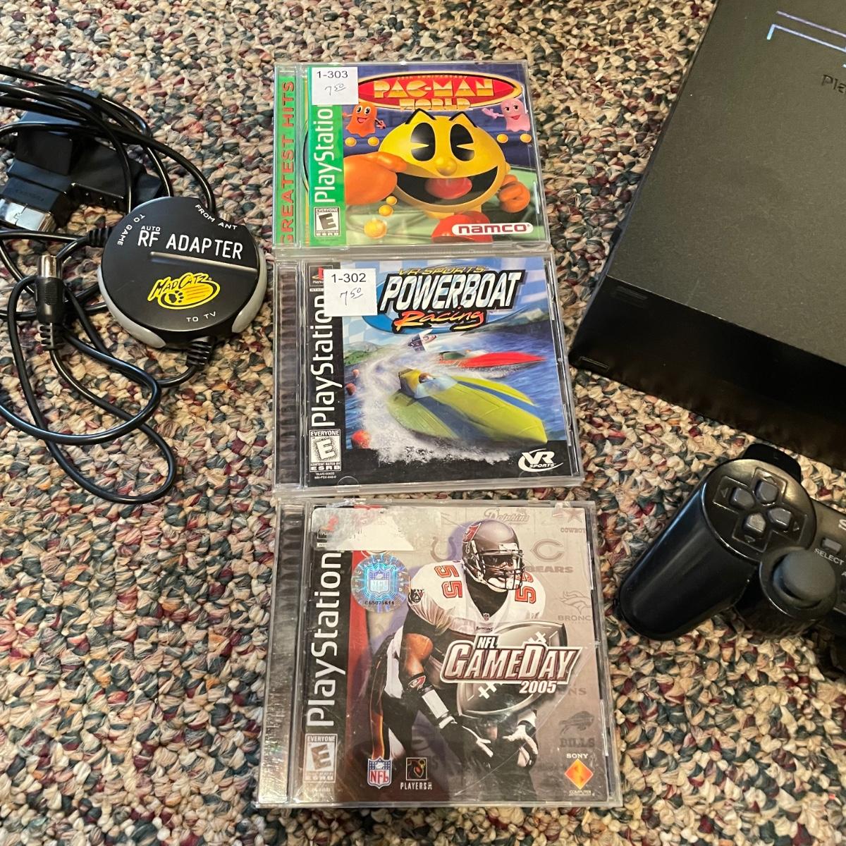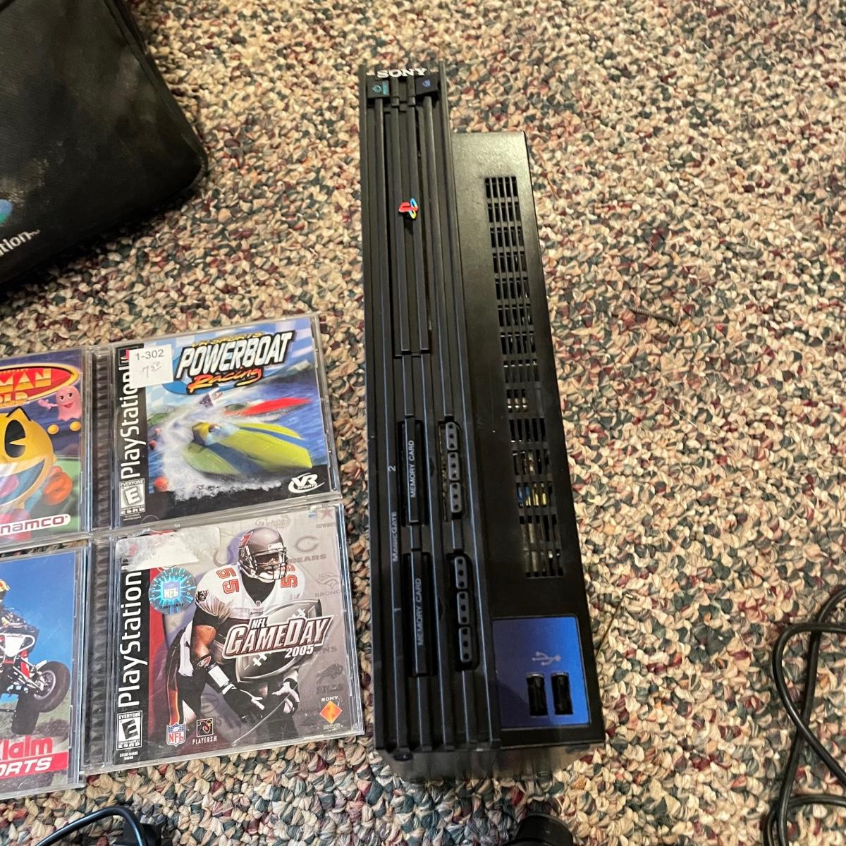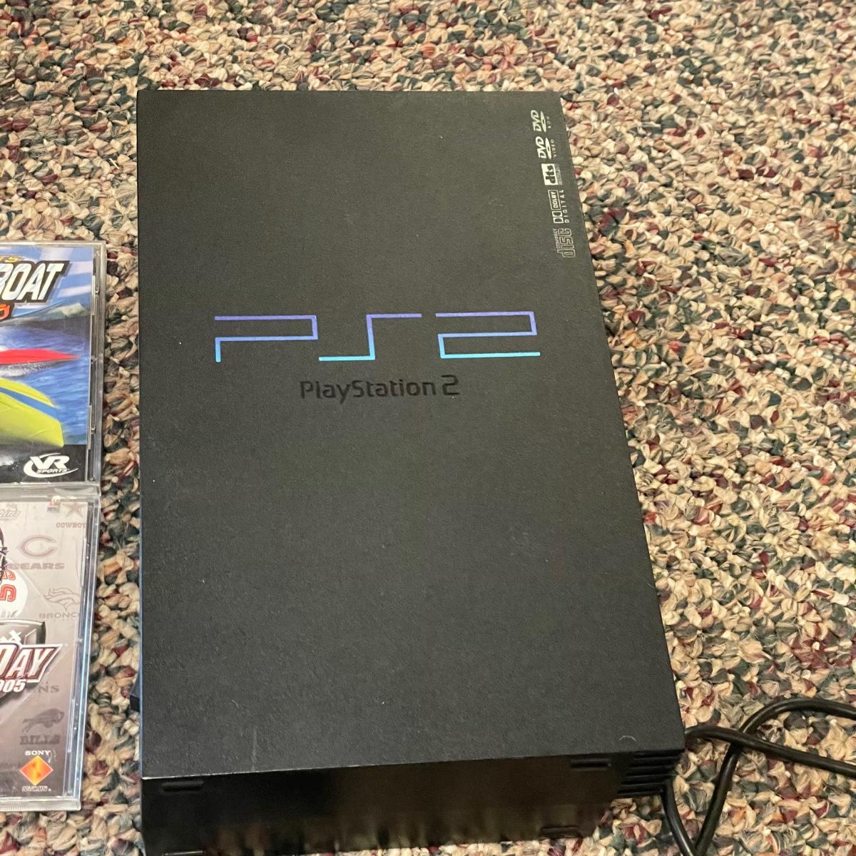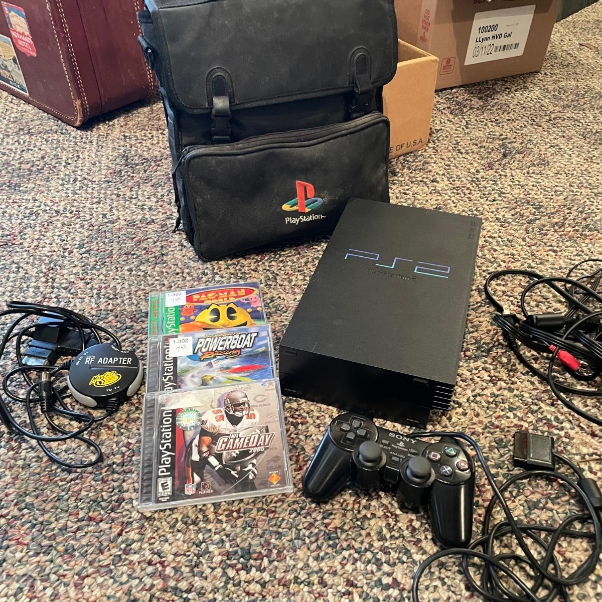 Sony PlayStation 2, turns on, but was not tested. Lot includes one controller, Mad Catz adapter and carrying case. Games included are PAC Man World, VR Powerboast Racing and NFL GameDay 2005. Carrying case is dusty. See images. Shipping available.