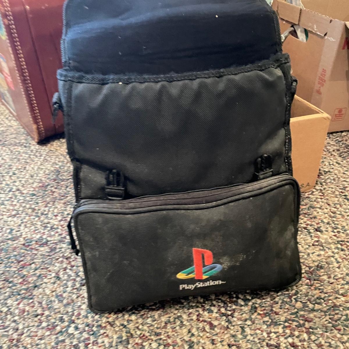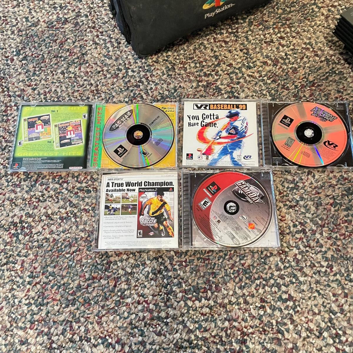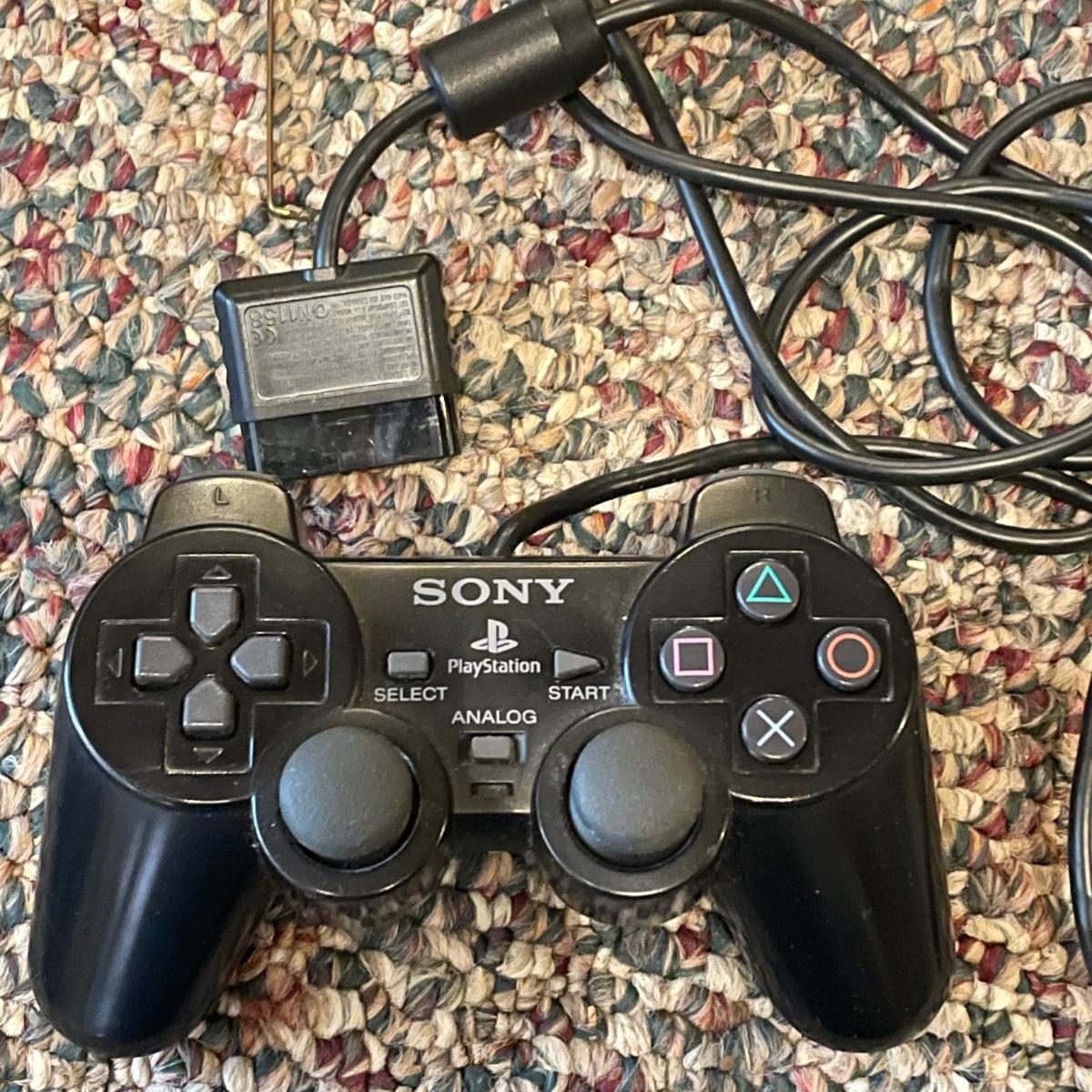Sony PlayStation 2, turns on, but was not tested. Lot includes one controller, Mad Catz adapter and carrying case. Games included are PAC Man World, VR Powerboast Racing and NFL GameDay 2005. Carrying case is dusty. See images. Shipping available.