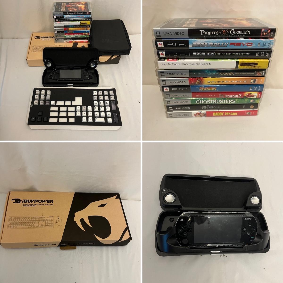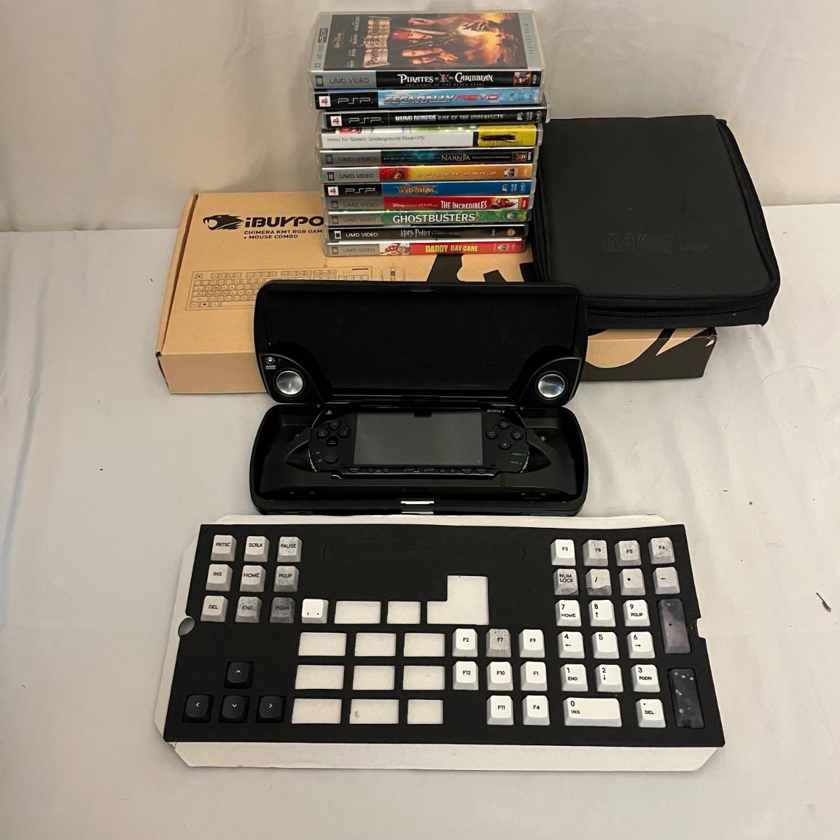 Lot includes a Sony PSP with NYKO speaker case, 11 movies, keyboard and mouse and soft case. PSP and speakers were not tested as it appears batteries are dead.