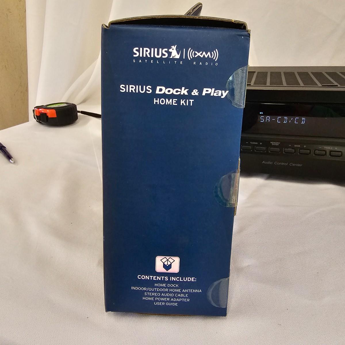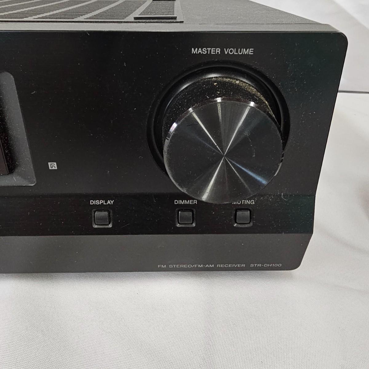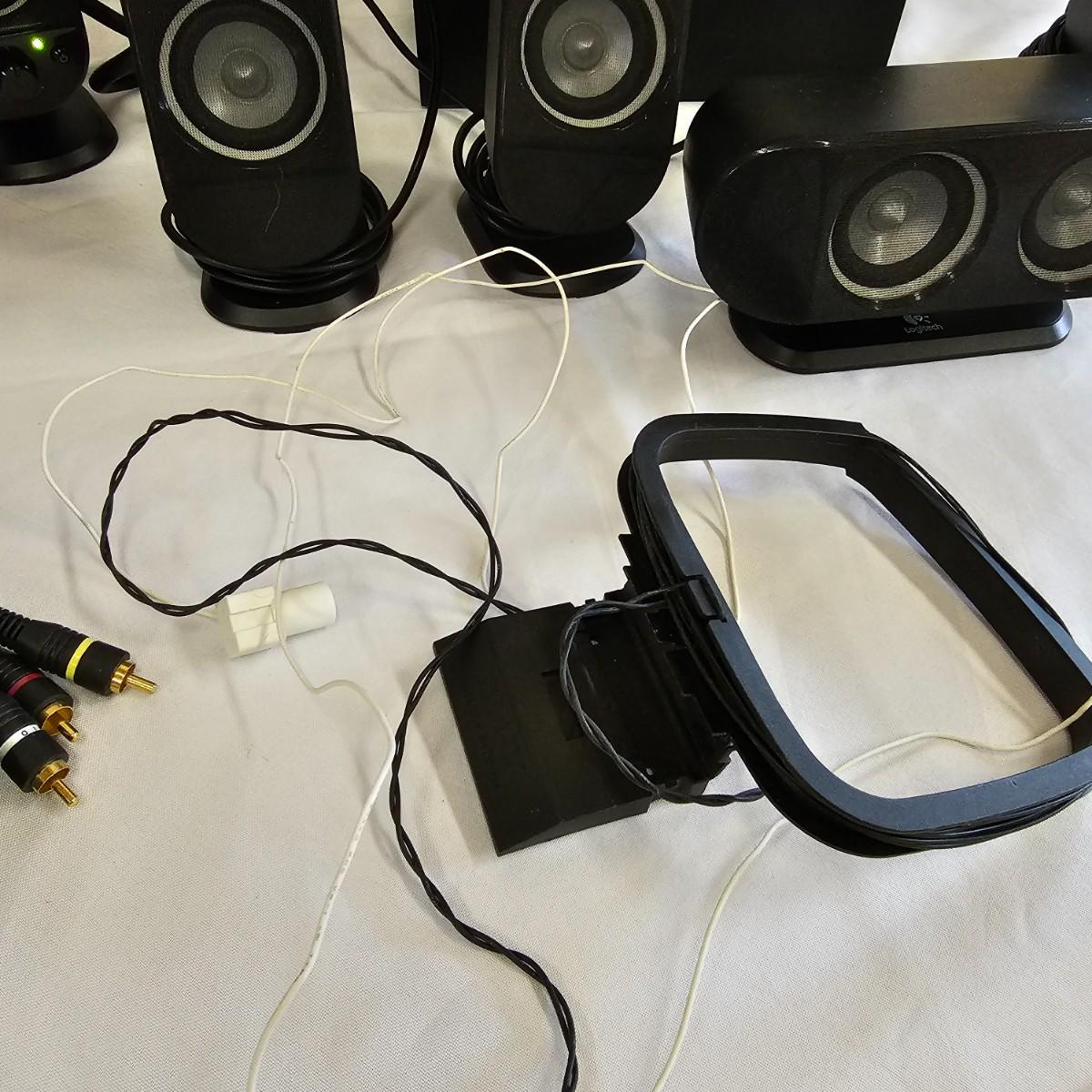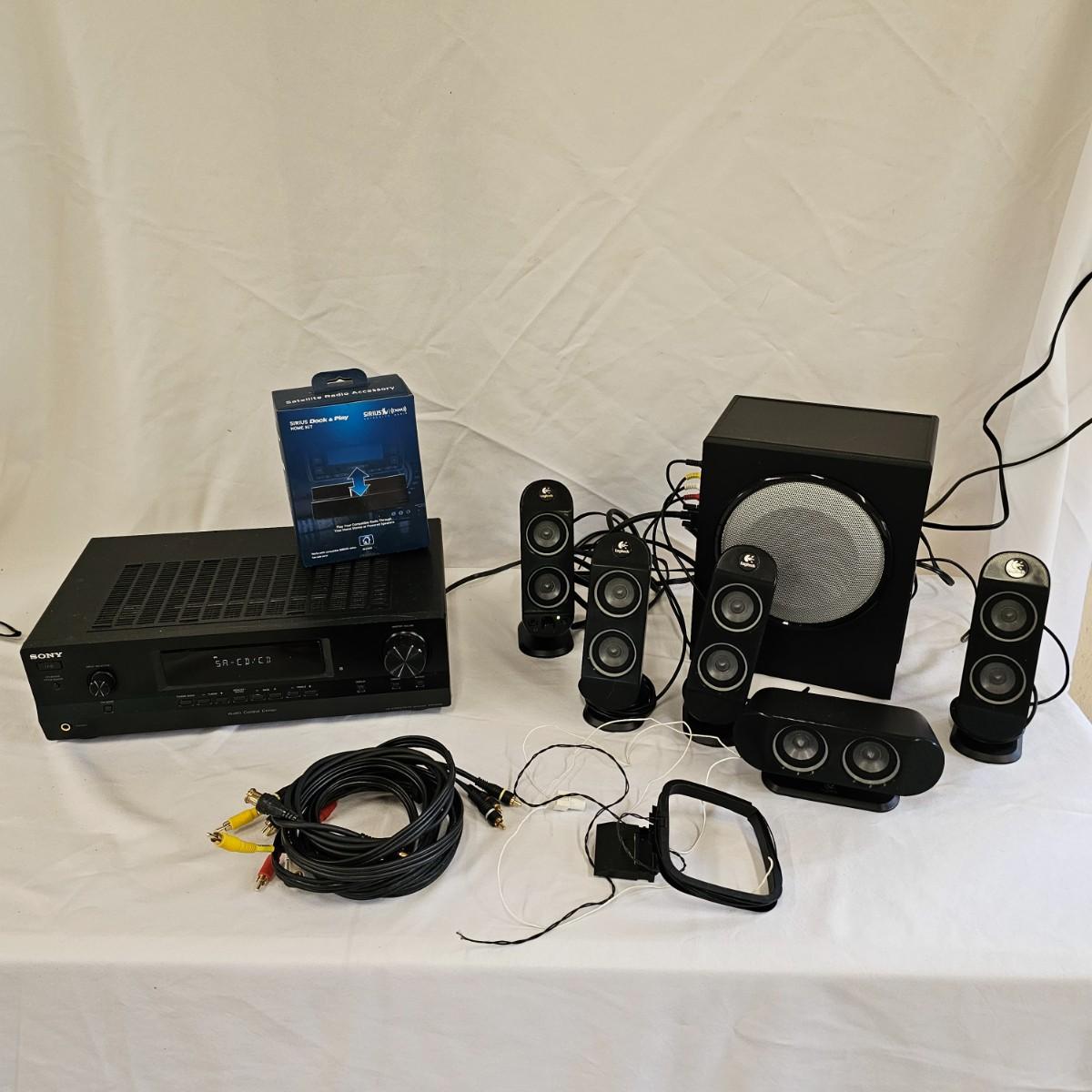 One Sony STR-DH100 stereo receiver and one set Logitech X-530 surround speakers. Logitech unit is most likely for use with a computer. Has five satellite speakers that plug into the subwoofer base. Also included is a Sirius XM dock & play home kit. There are also some additional RCA cables and two small antennas. Receiver and speakers powered on when plugged in. Receiver measures 17" x 10" x 5"H, and subwoofer is 9" x 6" x 12"H. See photos for details. Local pickup only.