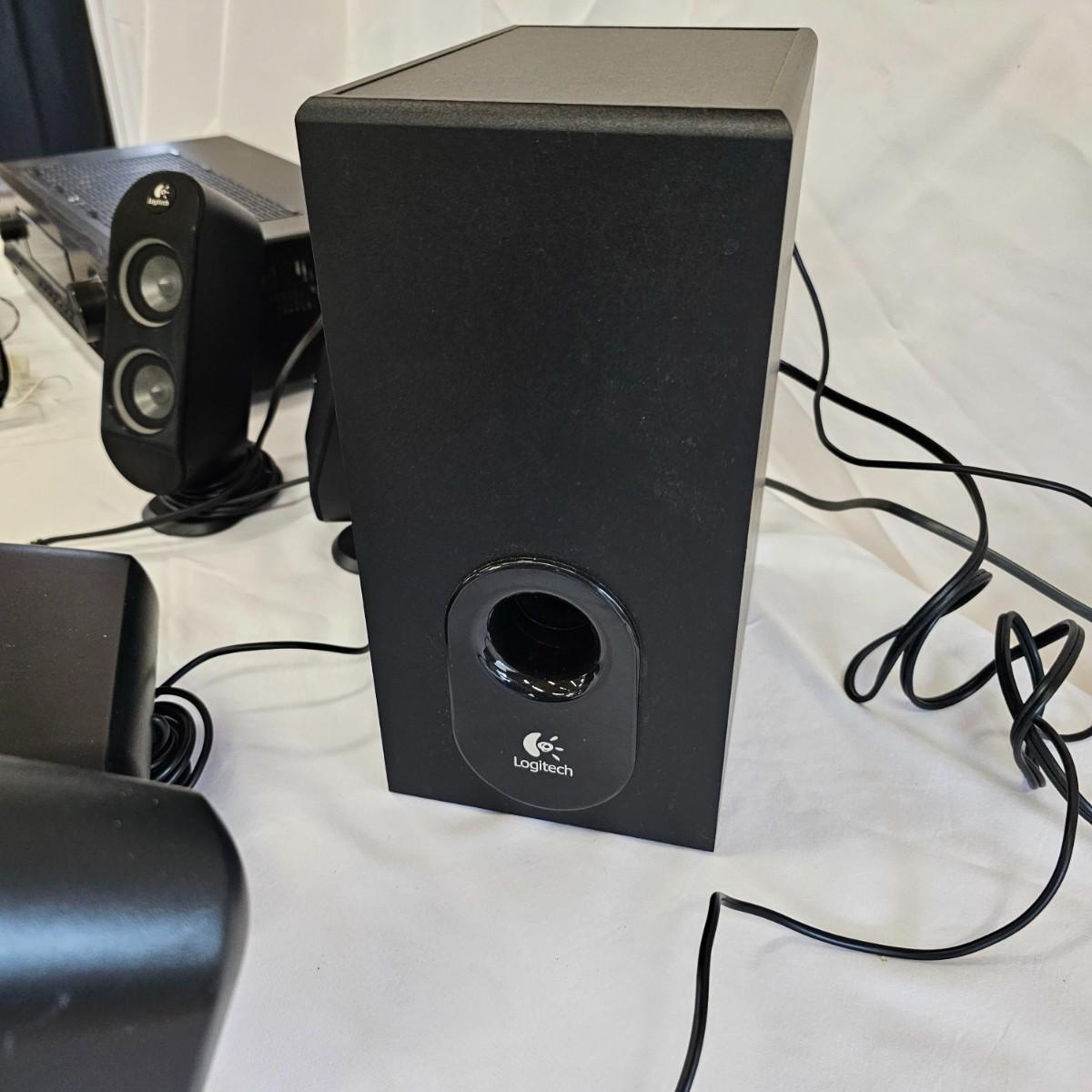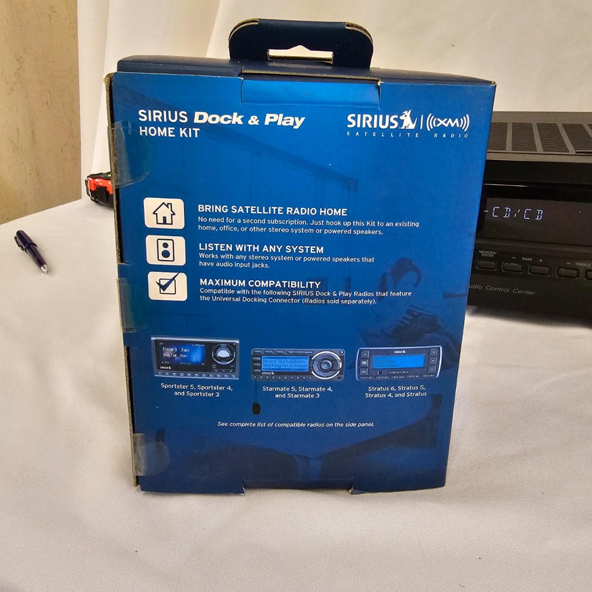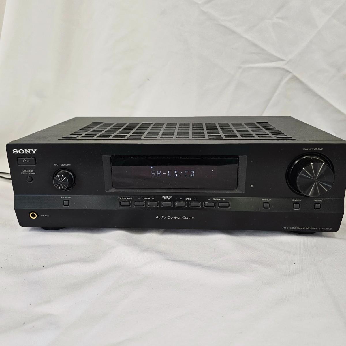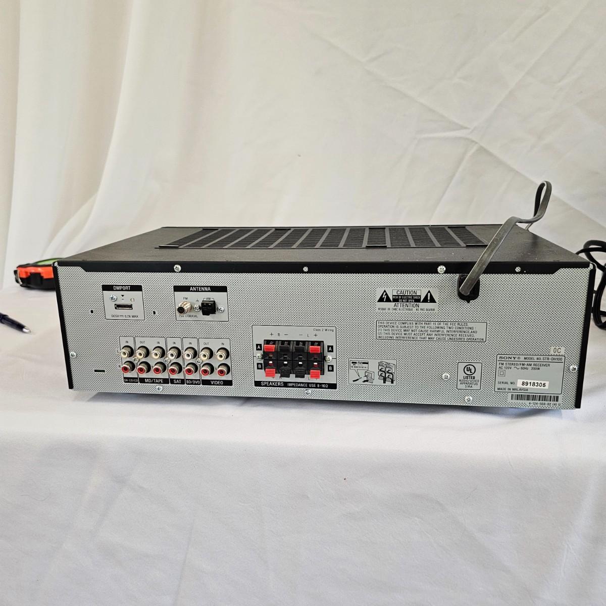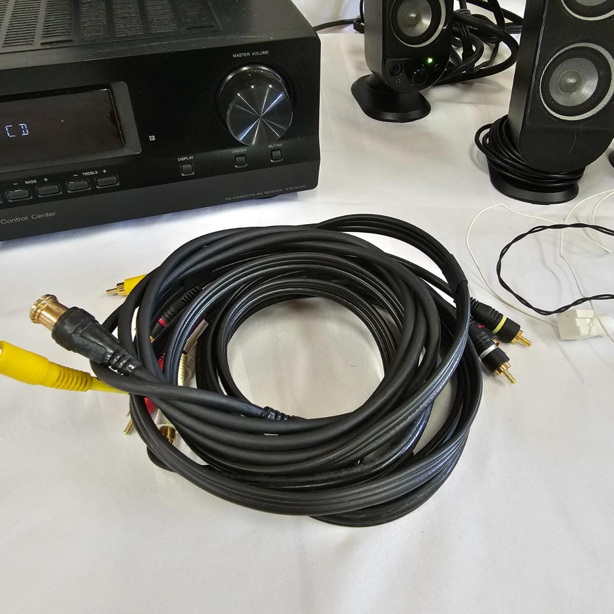 One Sony STR-DH100 stereo receiver and one set Logitech X-530 surround speakers. Logitech unit is most likely for use with a computer. Has five satellite speakers that plug into the subwoofer base. Also included is a Sirius XM dock & play home kit. There are also some additional RCA cables and two small antennas. Receiver and speakers powered on when plugged in. Receiver measures 17" x 10" x 5"H, and subwoofer is 9" x 6" x 12"H. See photos for details. Local pickup only.