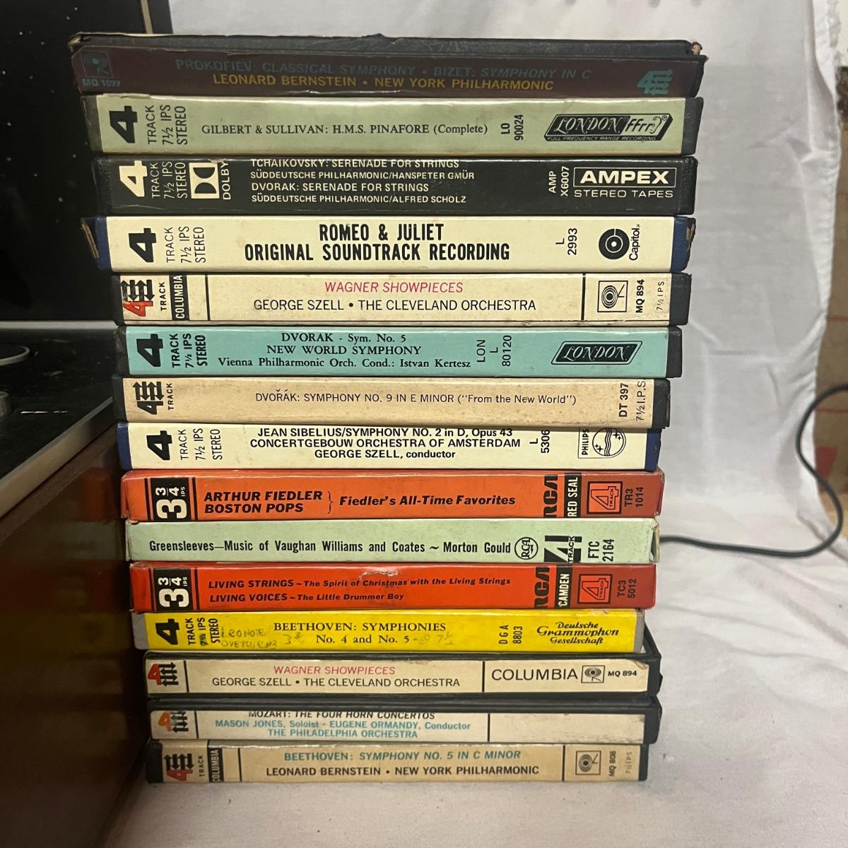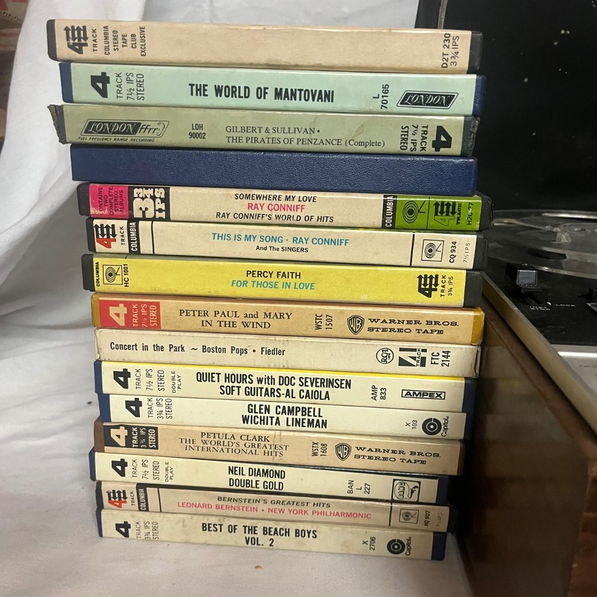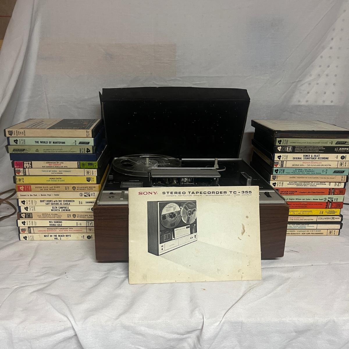 Lot includes a Sony Stereo tapecorder reel to reel with over 25 tapes in a variety of genres. Machine measures 15” x 14” x 7”H. Shipping available. Shipping available. Shipping can be costly. We suggest contacting our preferred local shipping provider, Postage Express, with dimensions and getting an estimate before bidding: (828) 255-9250 or email shipping@postageexpressnc.com