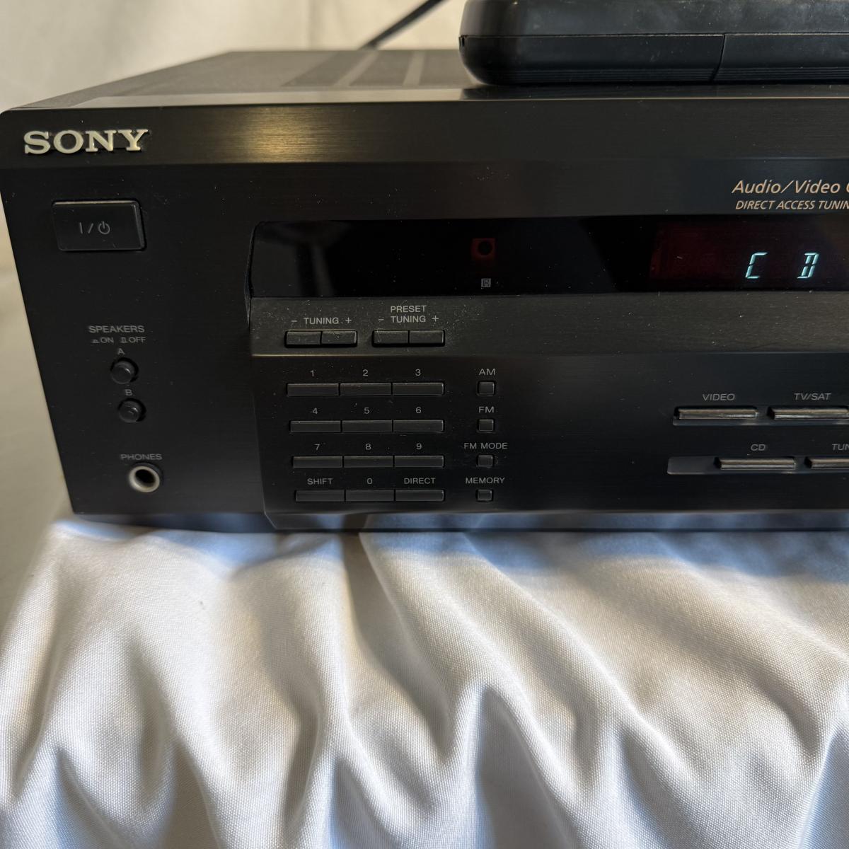 This lot contains a Sony surround receiver. This item does power on and measures 16.75” x 11.25” x 5.75”. It comes with a remote and an input/output cord to connect speakers. See pictures for details.