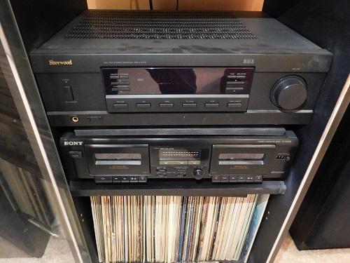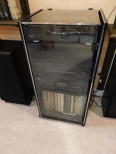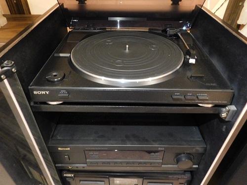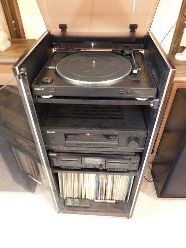 Sony Turntable, Sherwood Receiver, Sony Cassette Player with Cabinet vinyl albums are not included