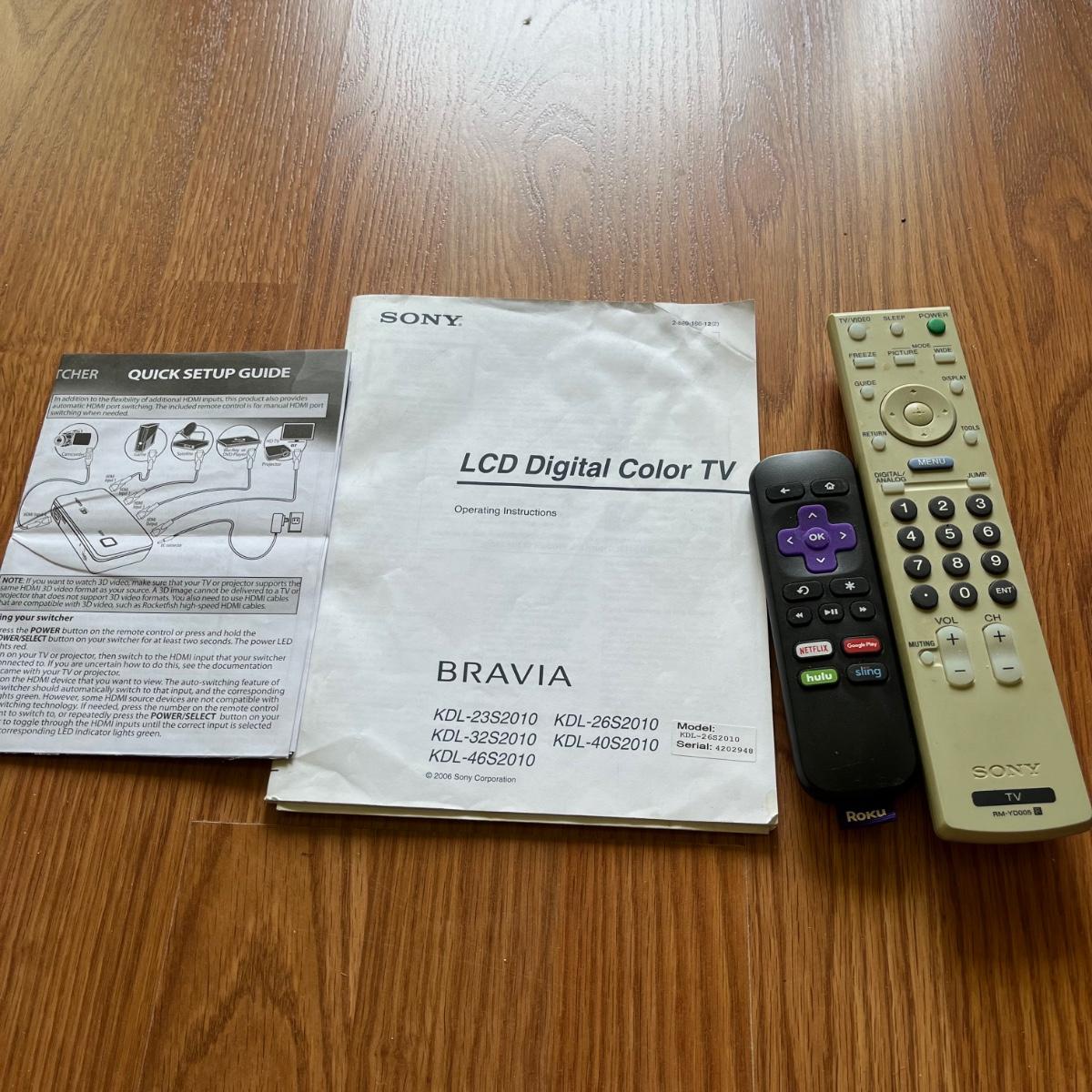 Lot includes a Sony LCD 26” TV model # KDL-26S2010 with remote, Roku with Remote, Rocketfish surge protector and HDMI cable. All items powered on when tested. Cabinet not included but available in the next lot.