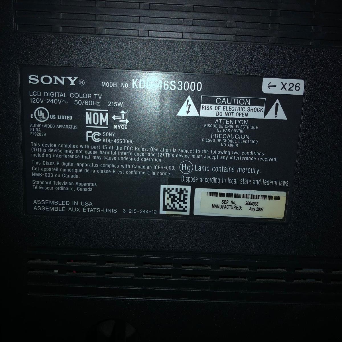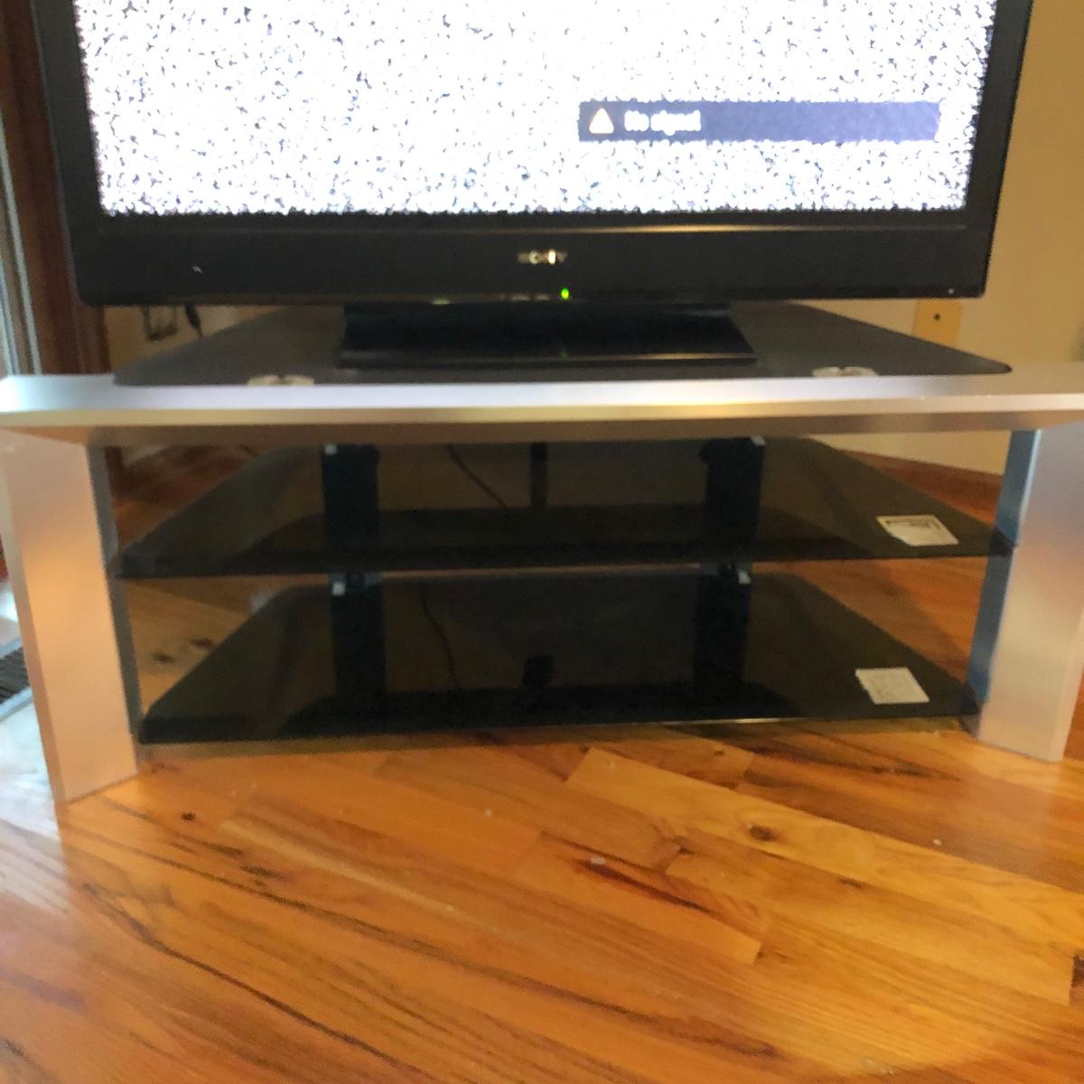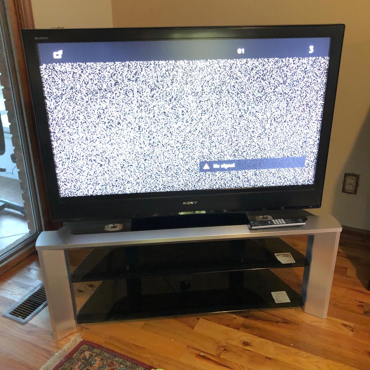 Lot includes a Sony 46” Tv Model # KDL-46S 3000 with remote and a Sony TV stand model # SU-RS11M with two glass shelves underneath and a metal colored plastic frame.