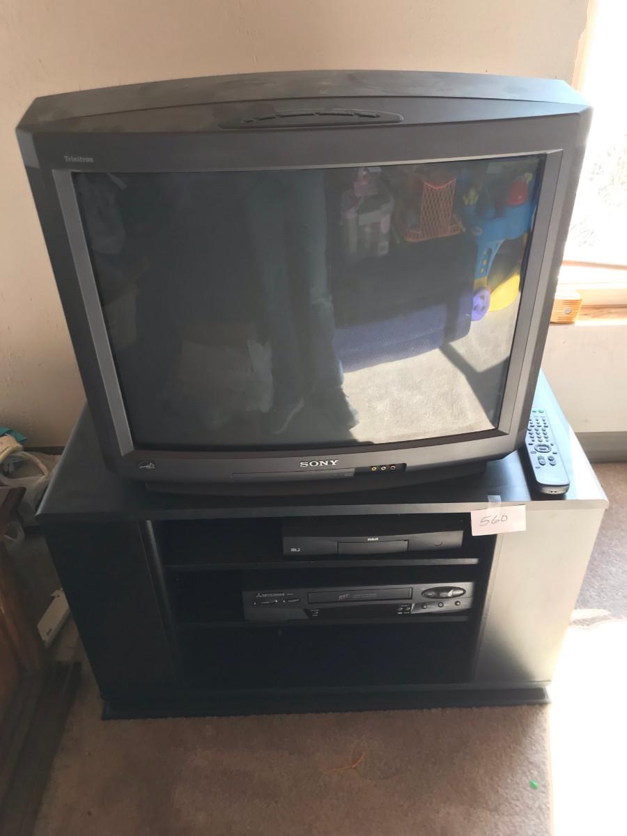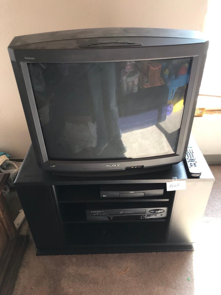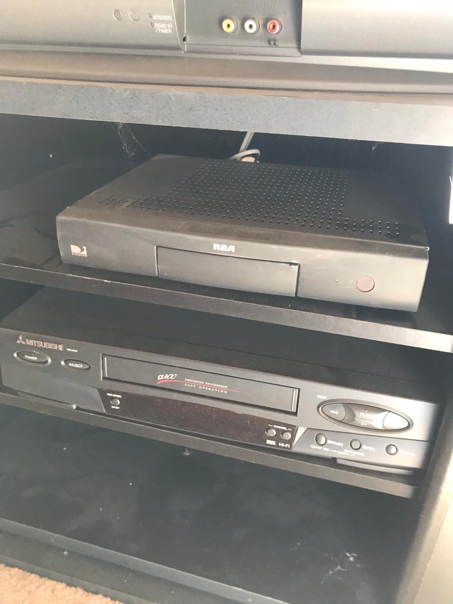 Sony TV, old style. Mitsubishi VHS player & Dish box + TV stand, swivels!