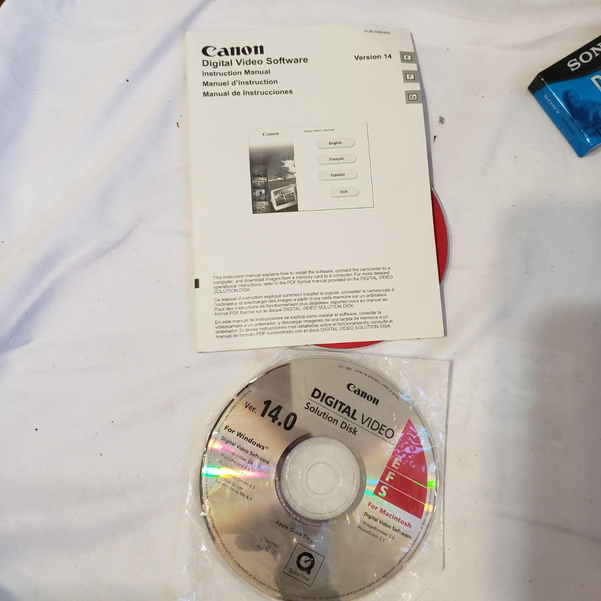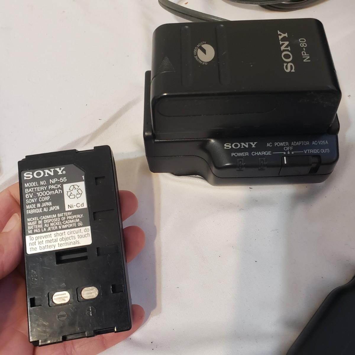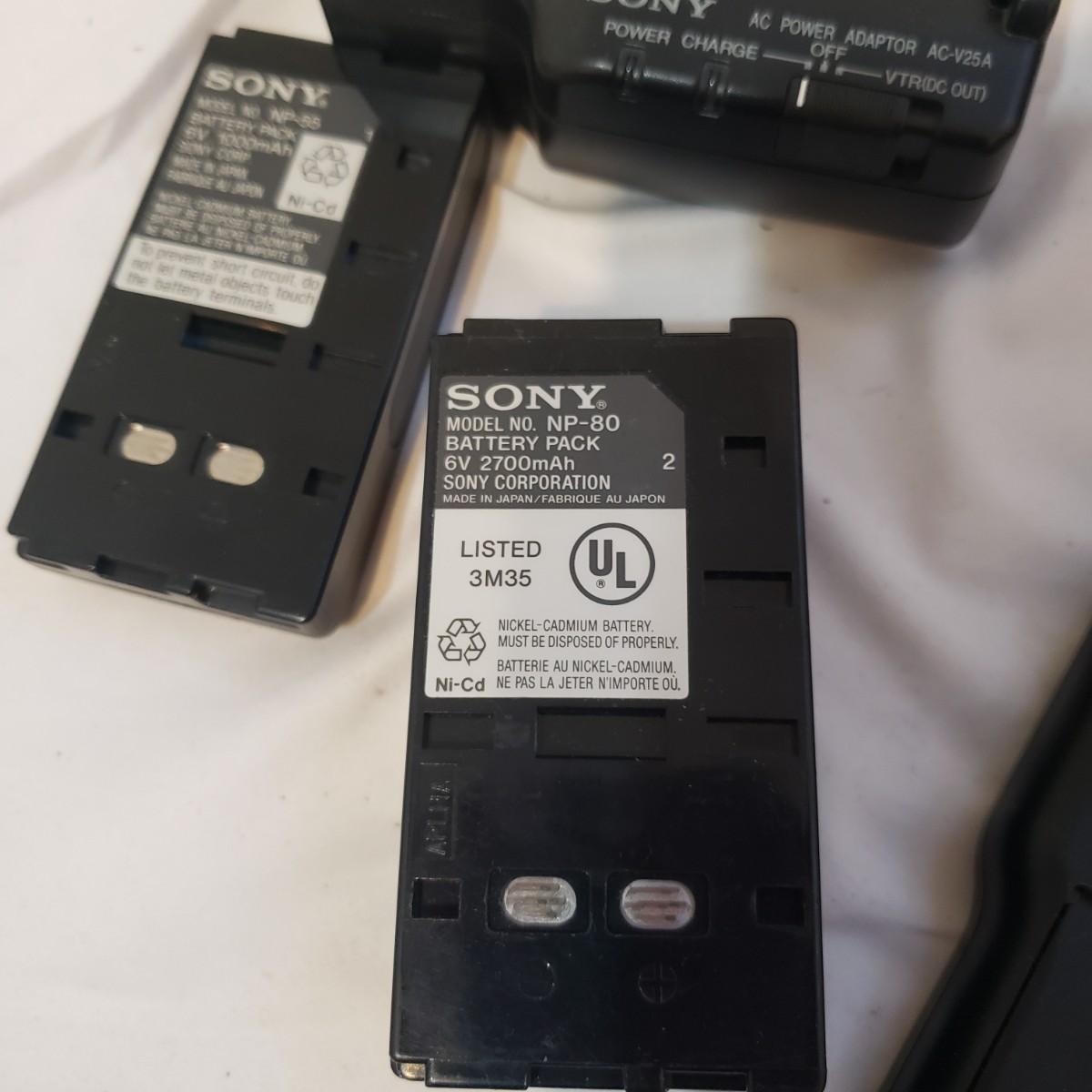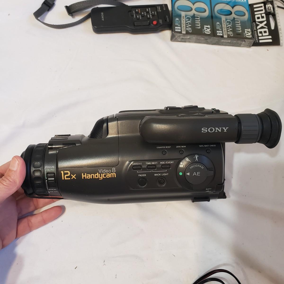 This lot contains a Sony Video 8 Handycam video camera recorder with many accessories-strap, batteries and charger, TV adapters and a Samsonite carry case. See pictures for details. Also included is a Canon ZR digital video camcorder. This camcorder comes with a manual, cables and an extra battery. Both pieces were not tested with a charged battery.