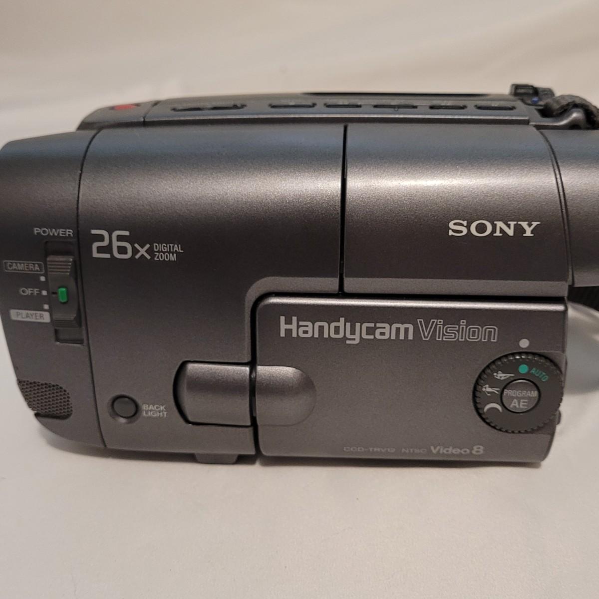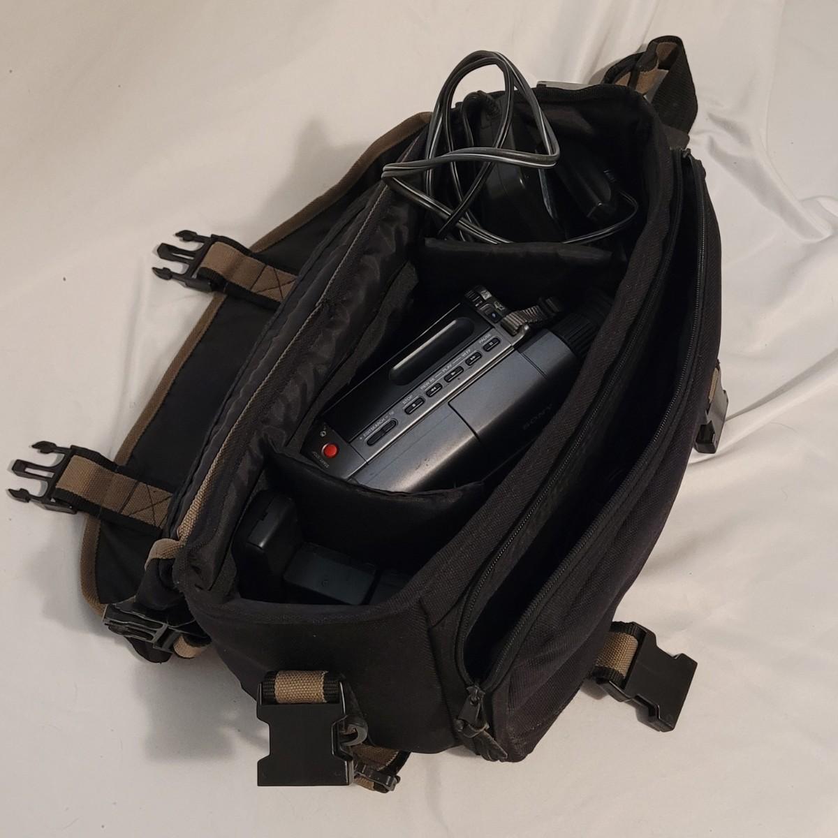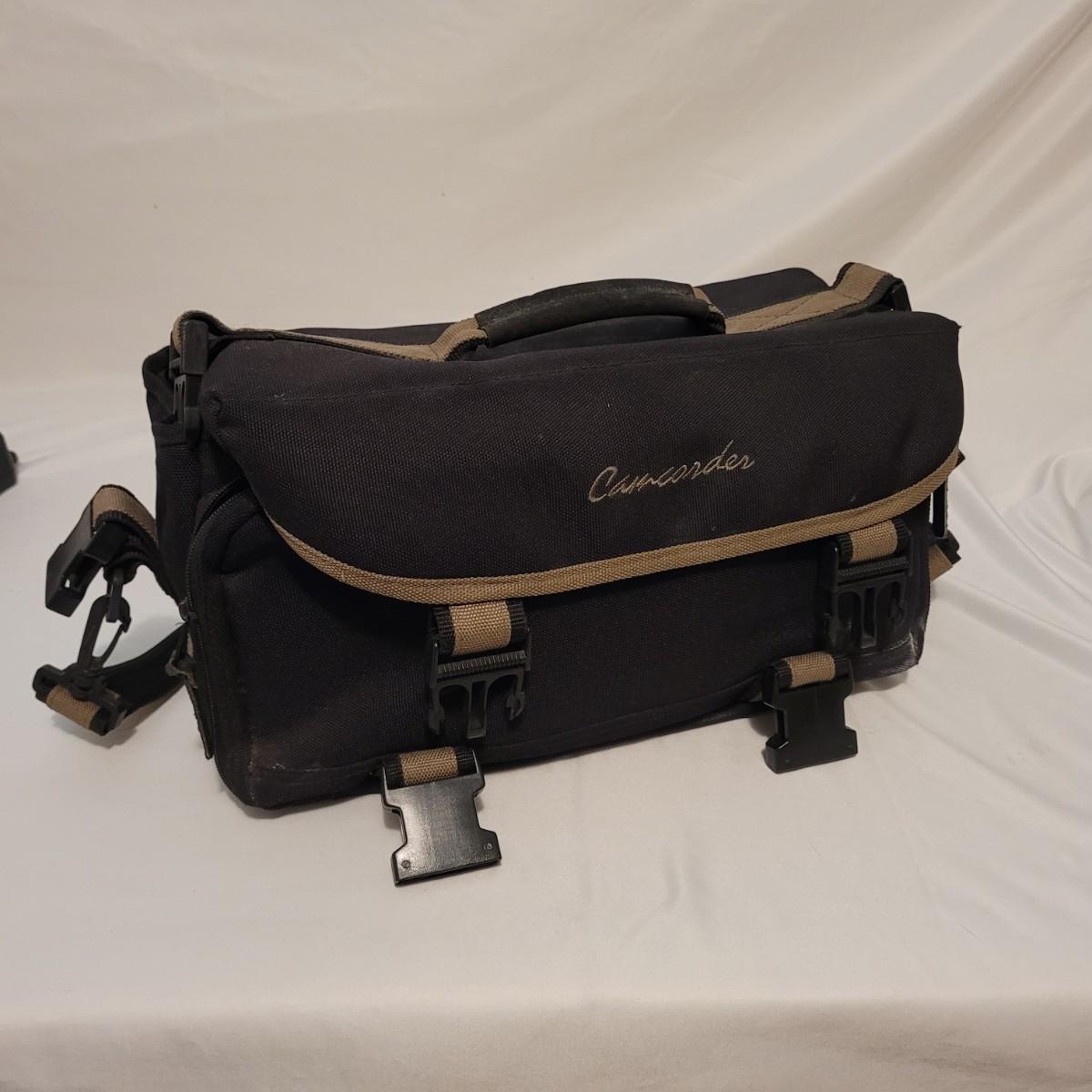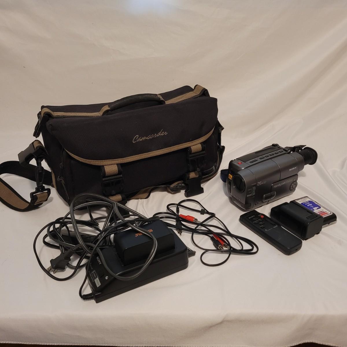 Sony brand camcorder with bag and accessories. "Handycam Vision" model number CCD-TRV12. Includes quality carrying bag, remote, cords, charger, and extra batteries. Powers on when plugged in. Can be powered with an adapter to bypass battery. Bag measures approximately 18" x 8" x 9"H.