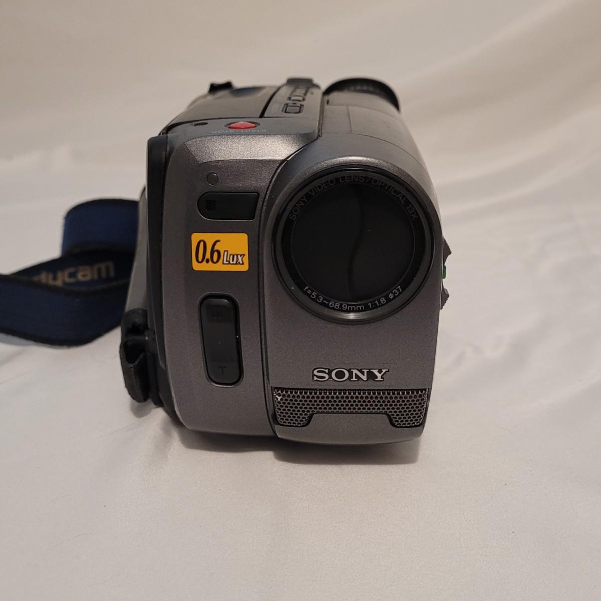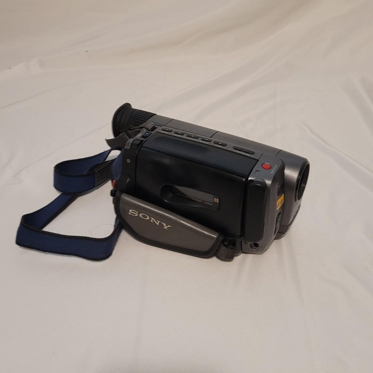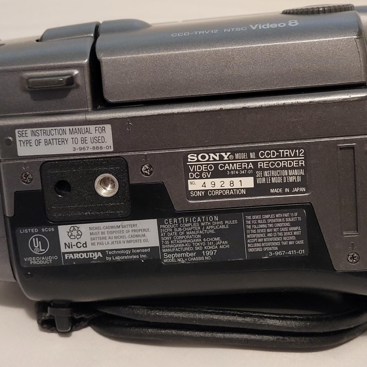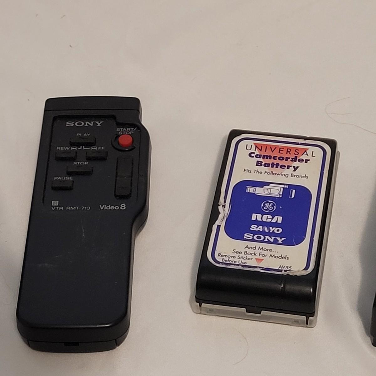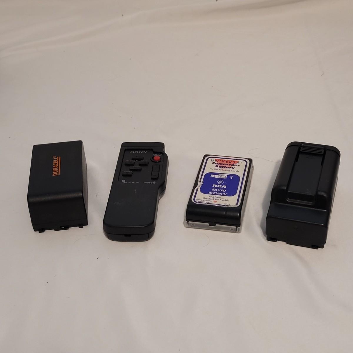 Sony brand camcorder with bag and accessories. "Handycam Vision" model number CCD-TRV12. Includes quality carrying bag, remote, cords, charger, and extra batteries. Powers on when plugged in. Can be powered with an adapter to bypass battery. Bag measures approximately 18" x 8" x 9"H.