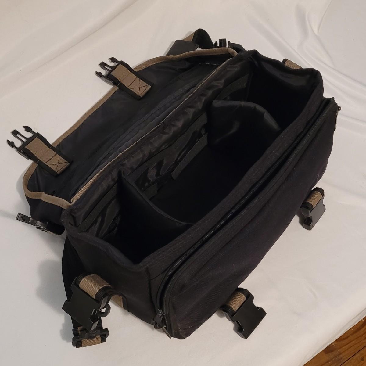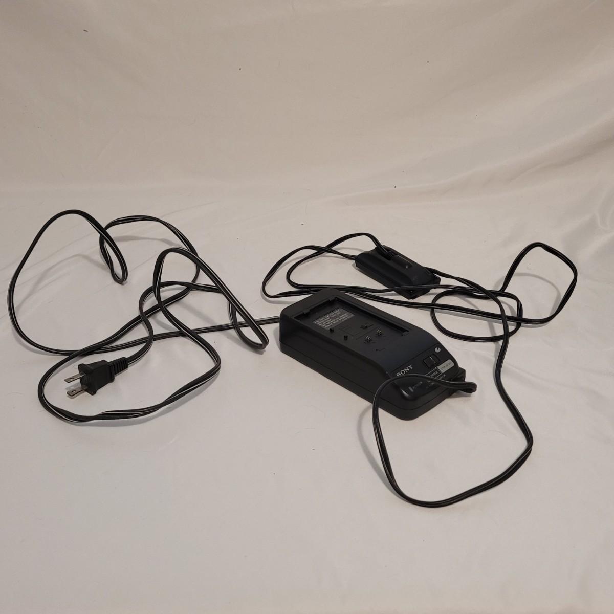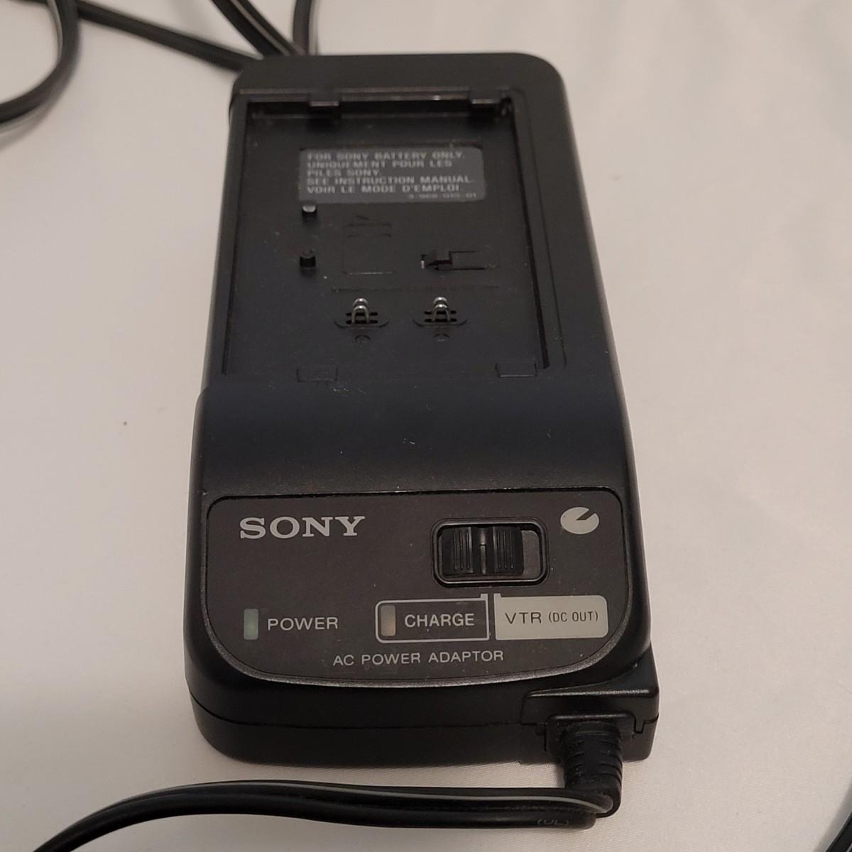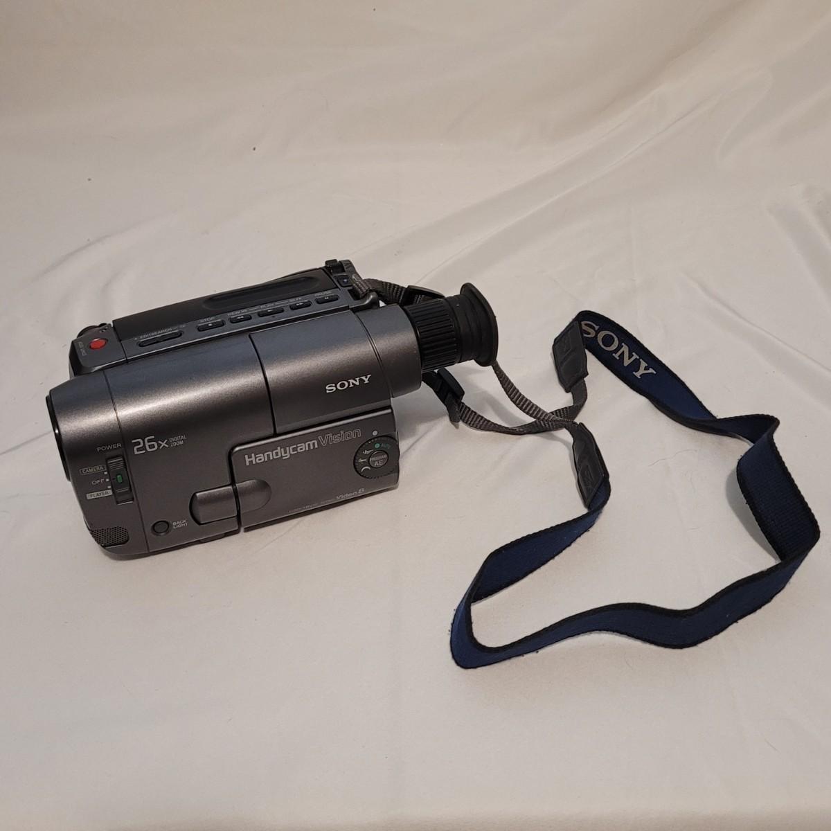 Sony brand camcorder with bag and accessories. "Handycam Vision" model number CCD-TRV12. Includes quality carrying bag, remote, cords, charger, and extra batteries. Powers on when plugged in. Can be powered with an adapter to bypass battery. Bag measures approximately 18" x 8" x 9"H.