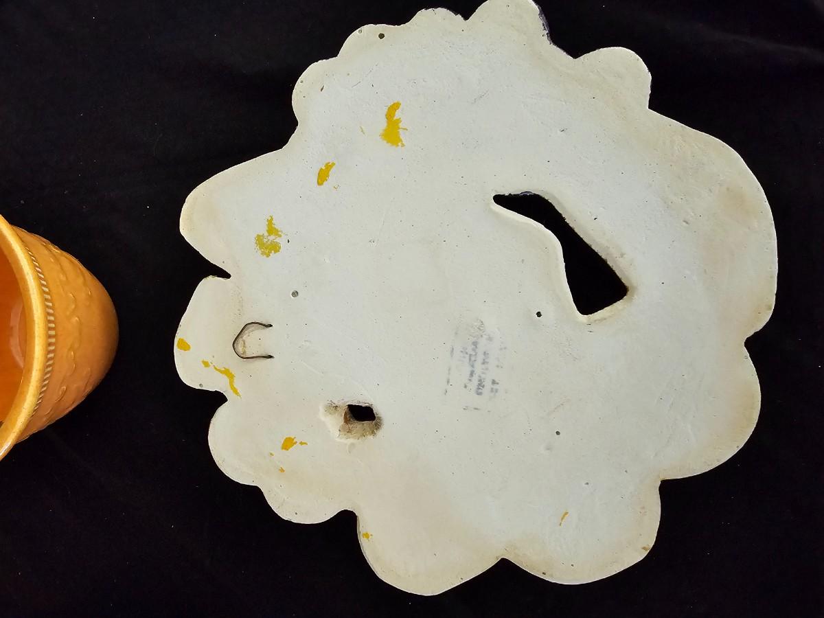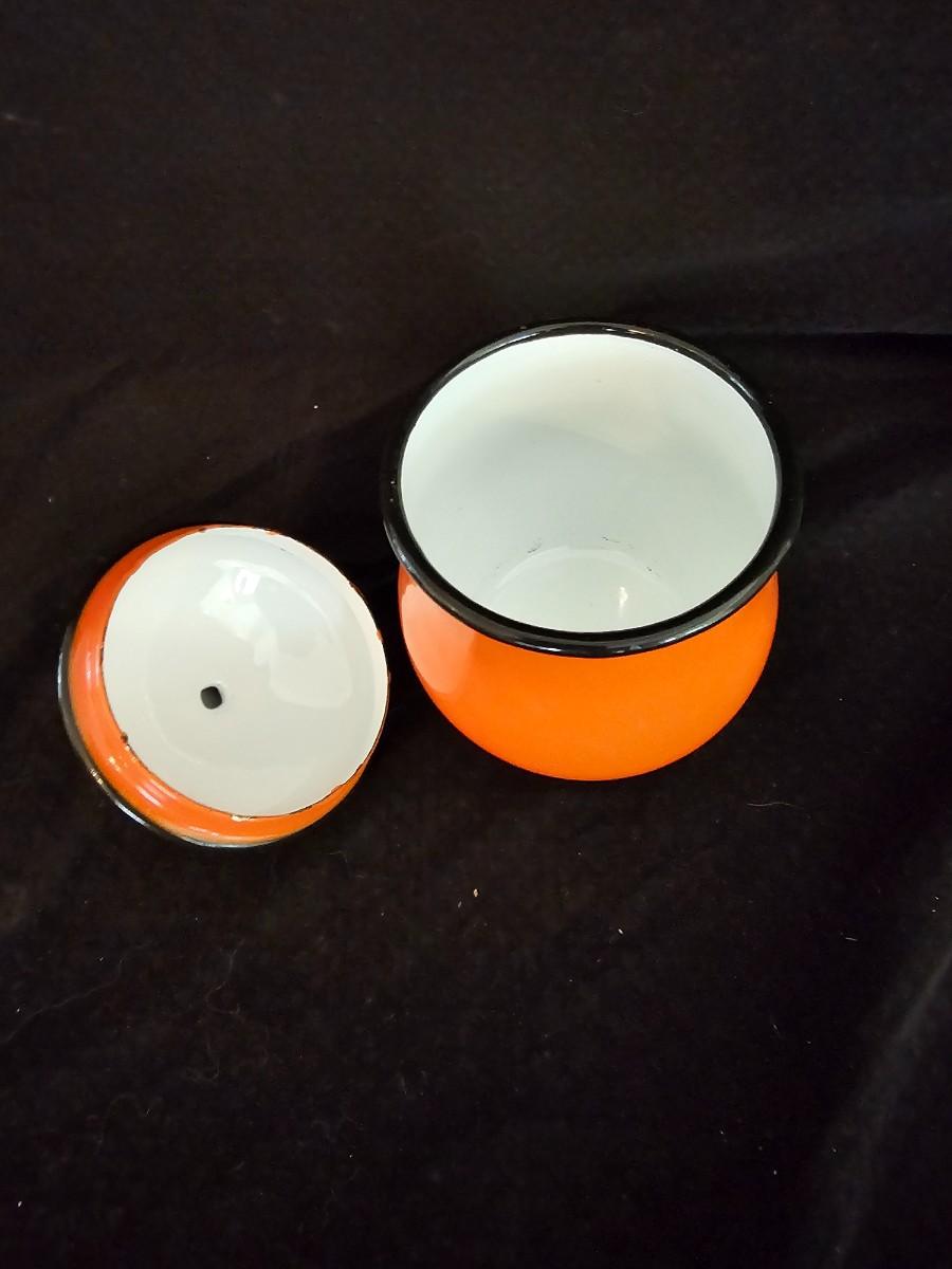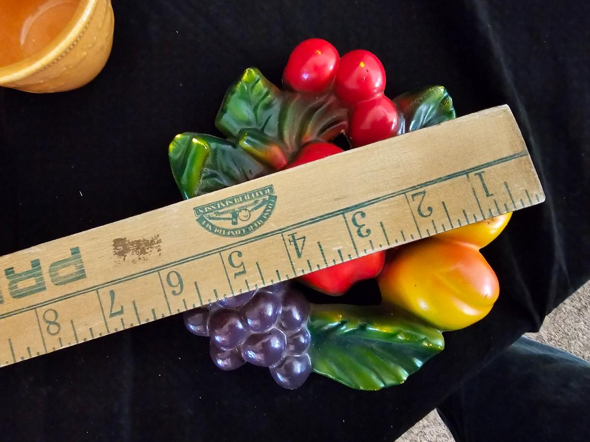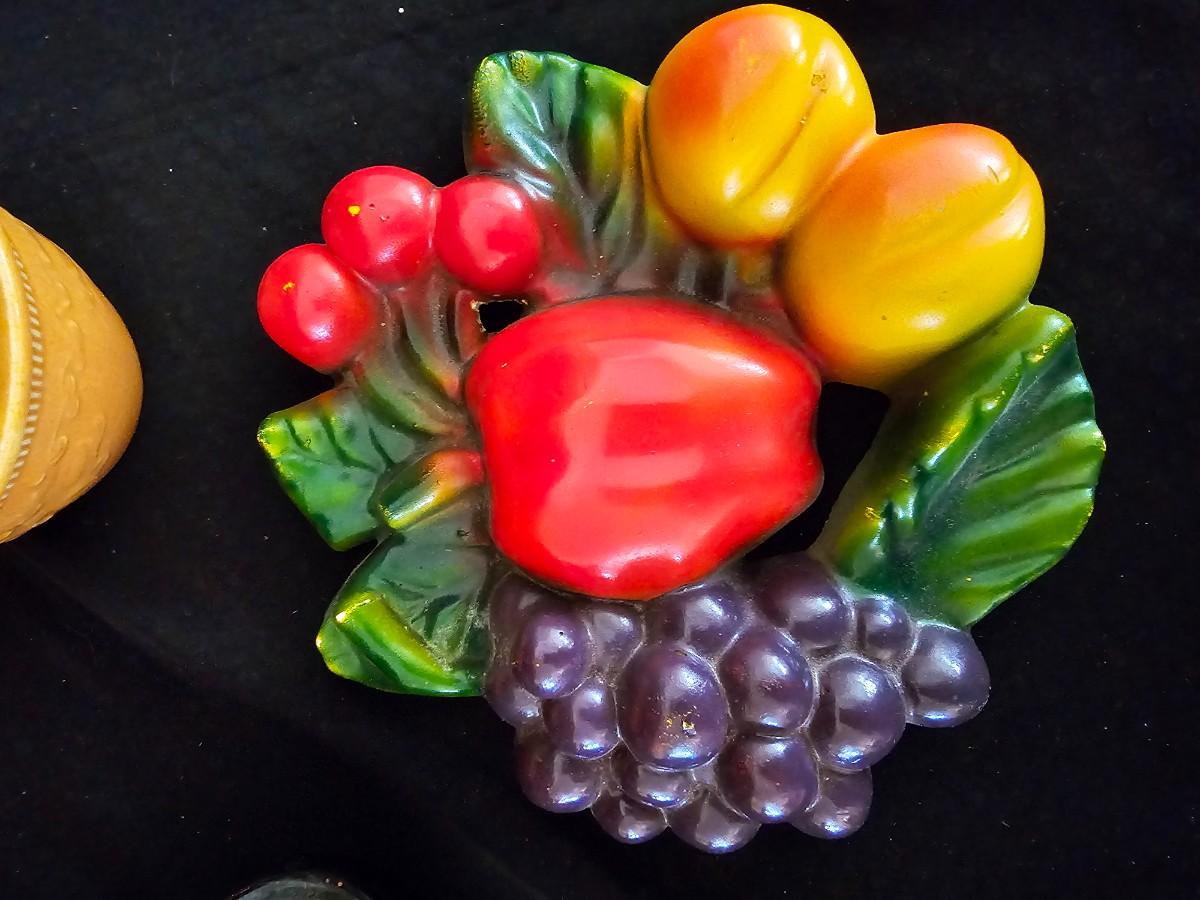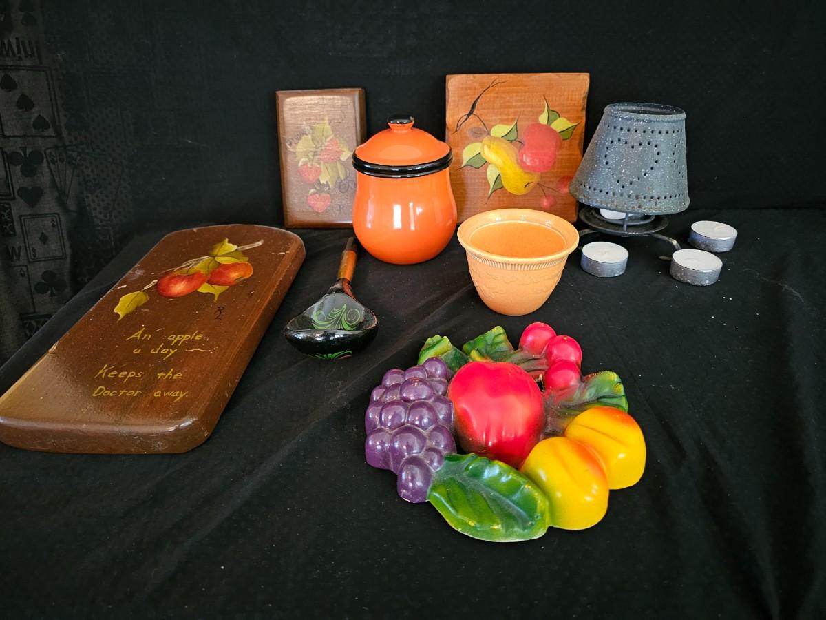 Small orange enamel sugar dish with hand painted wooden wall art, chalkware fruit and more