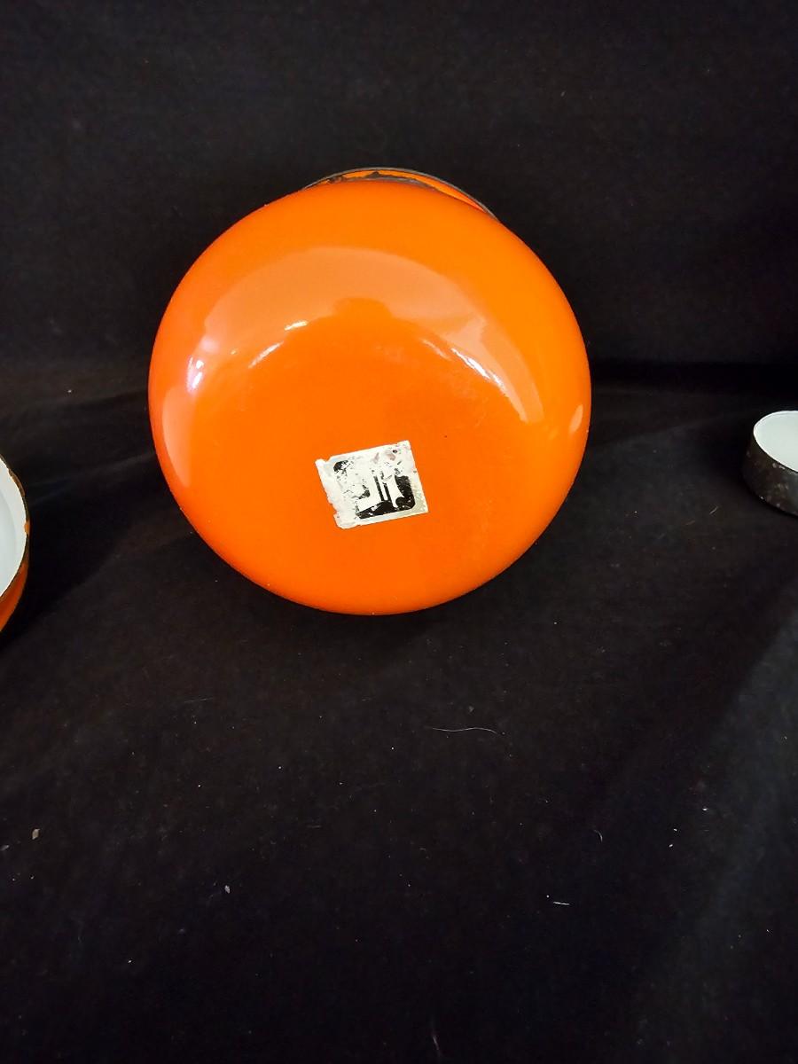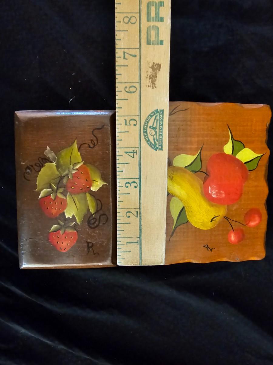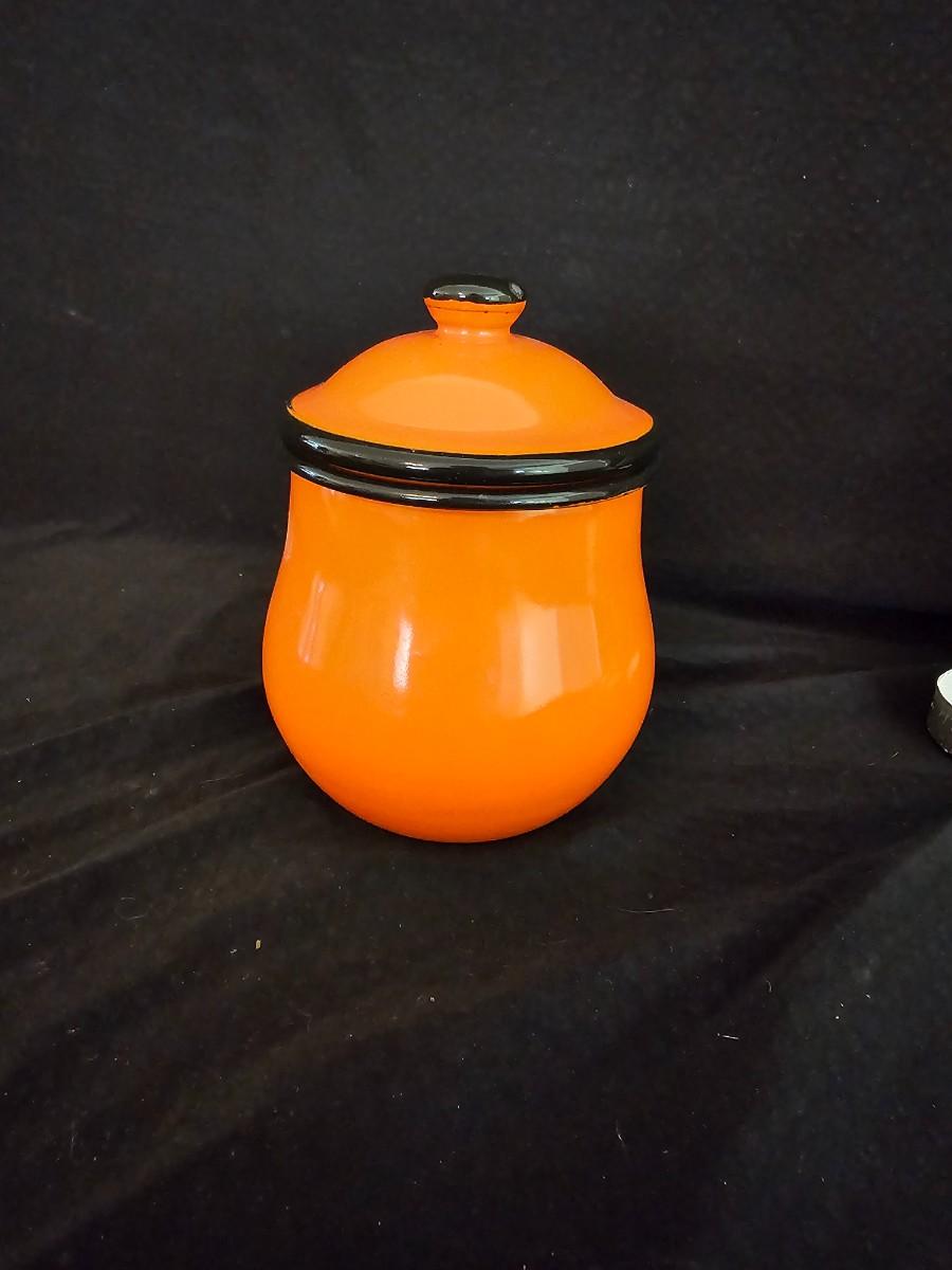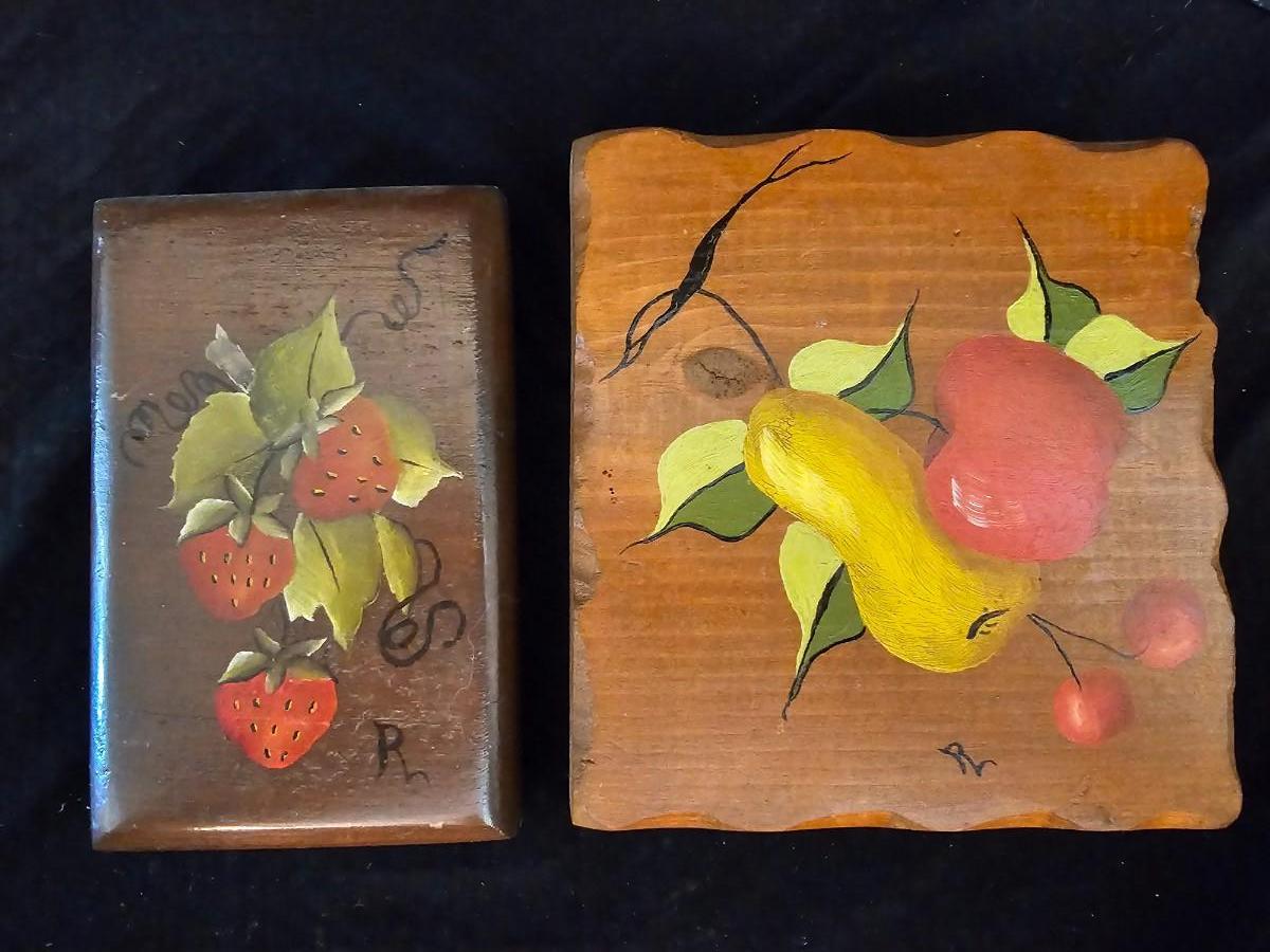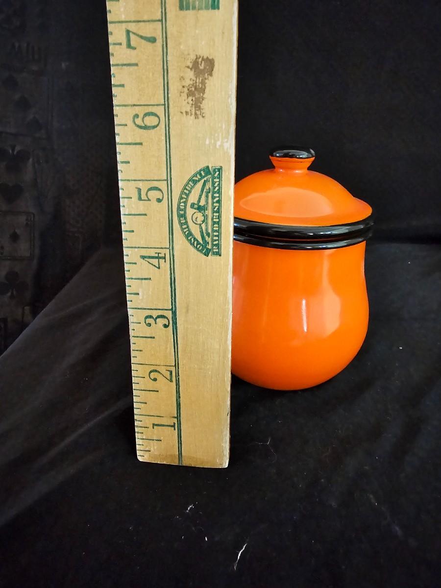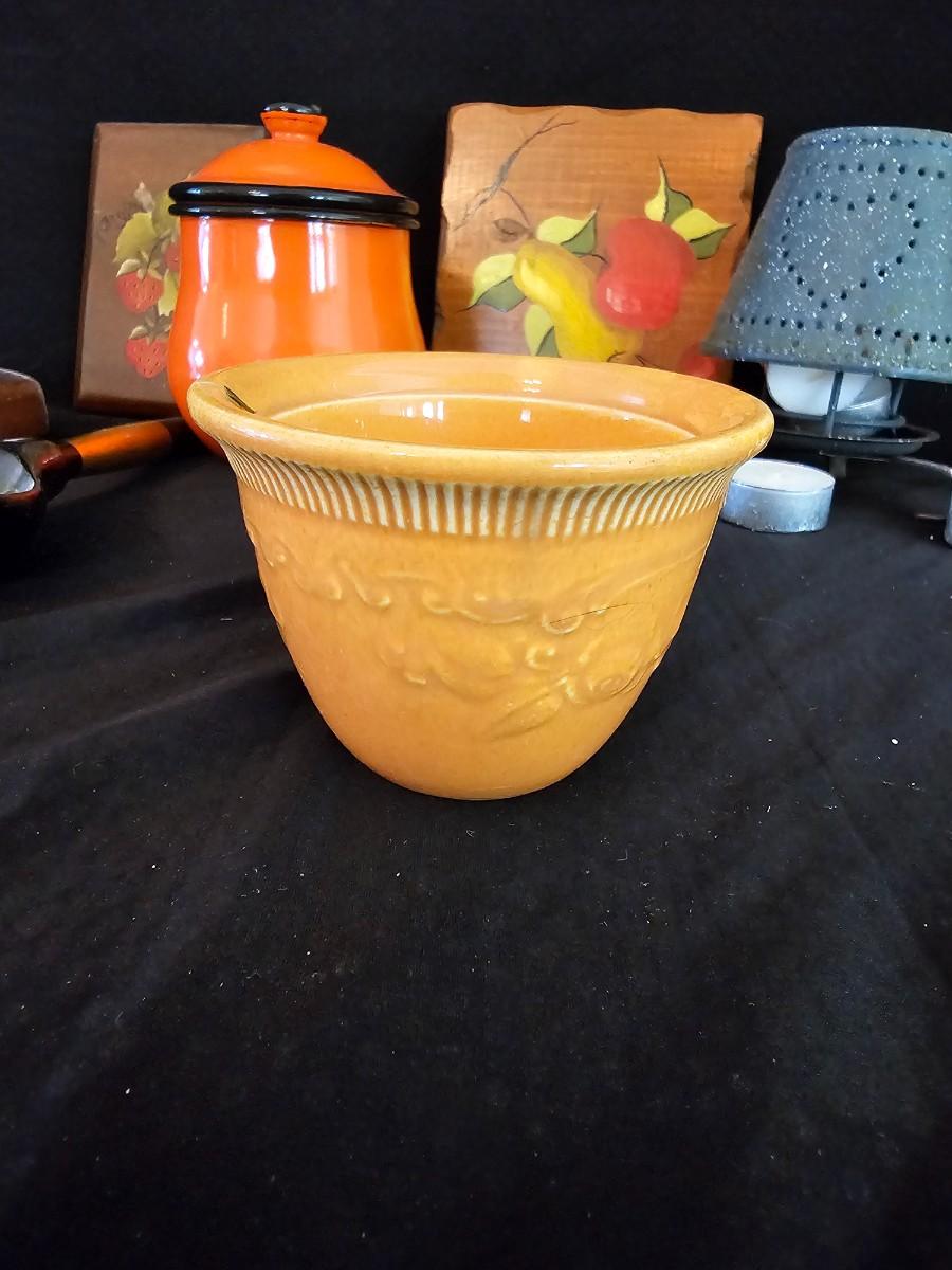 Small orange enamel sugar dish with hand painted wooden wall art, chalkware fruit and more