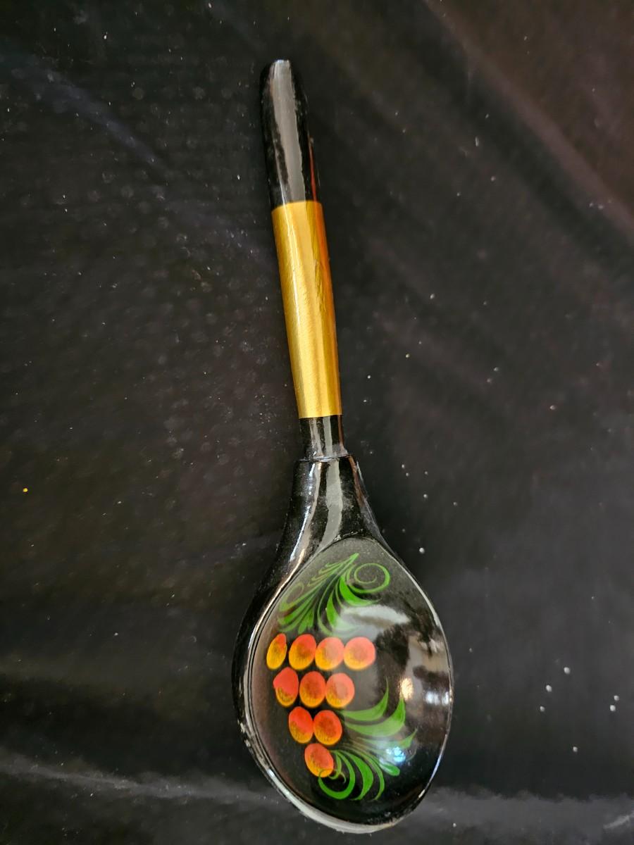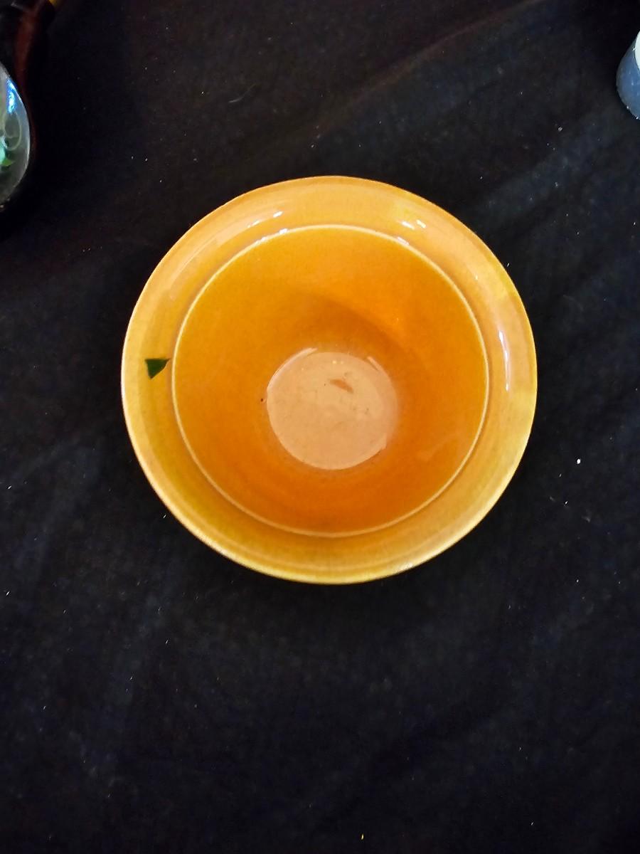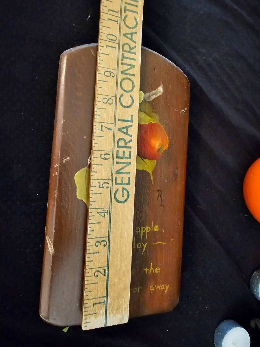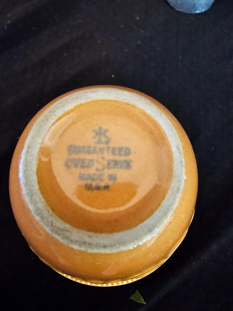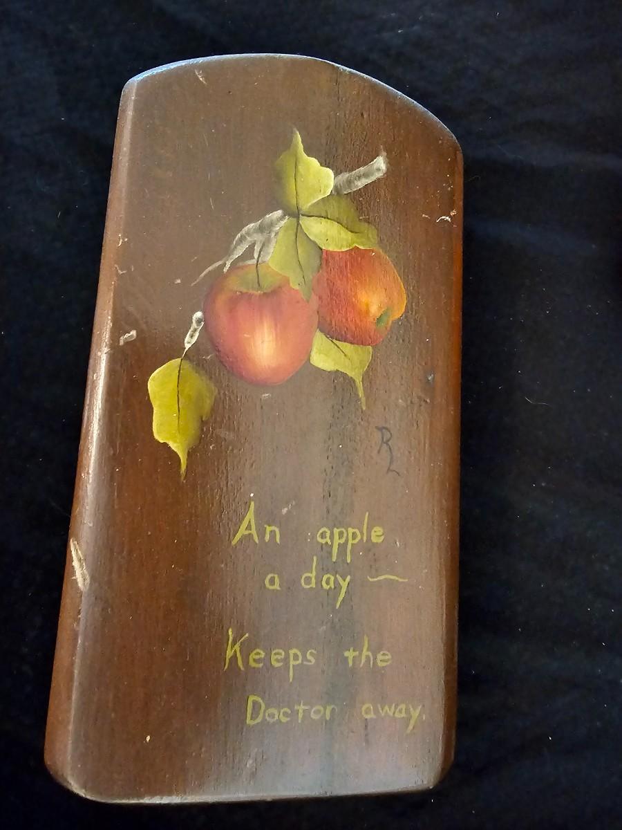 Small orange enamel sugar dish with hand painted wooden wall art, chalkware fruit and more