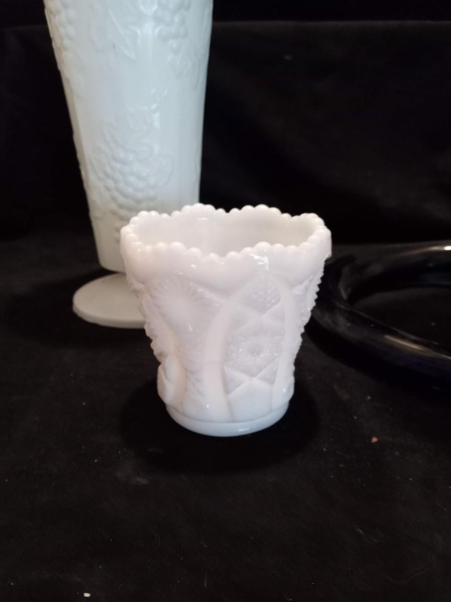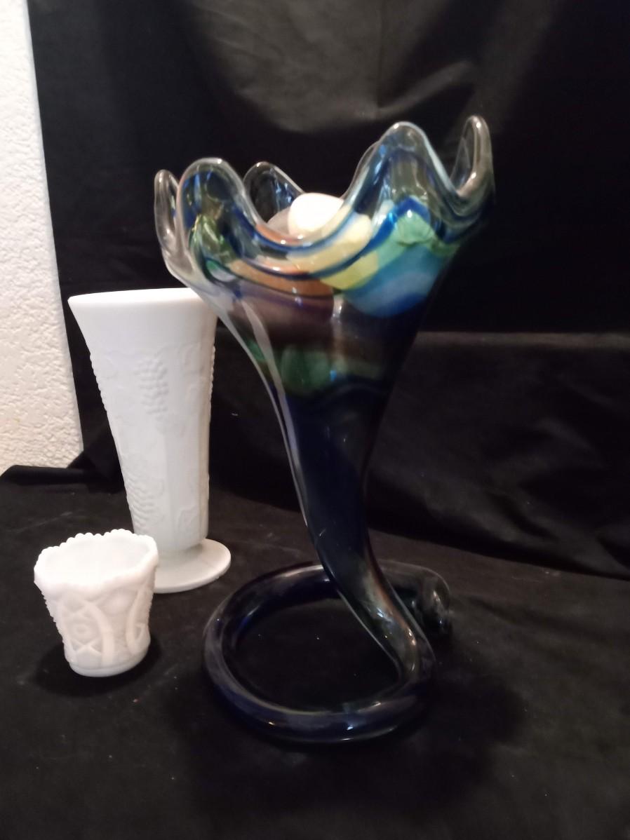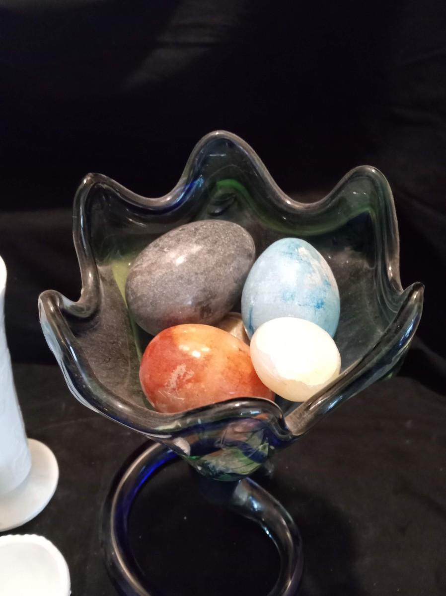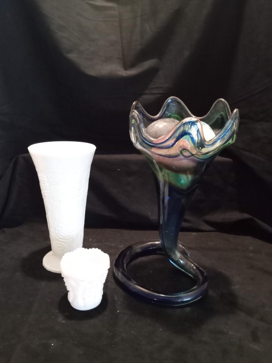 SOONER ART GLASS VASE WITH MARBLE EGGS, MILK GLASS VASE AND TOOTHPICK HOLDER
