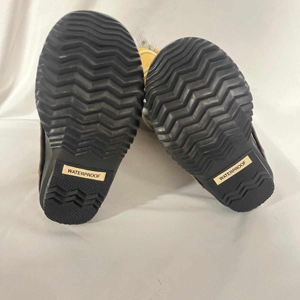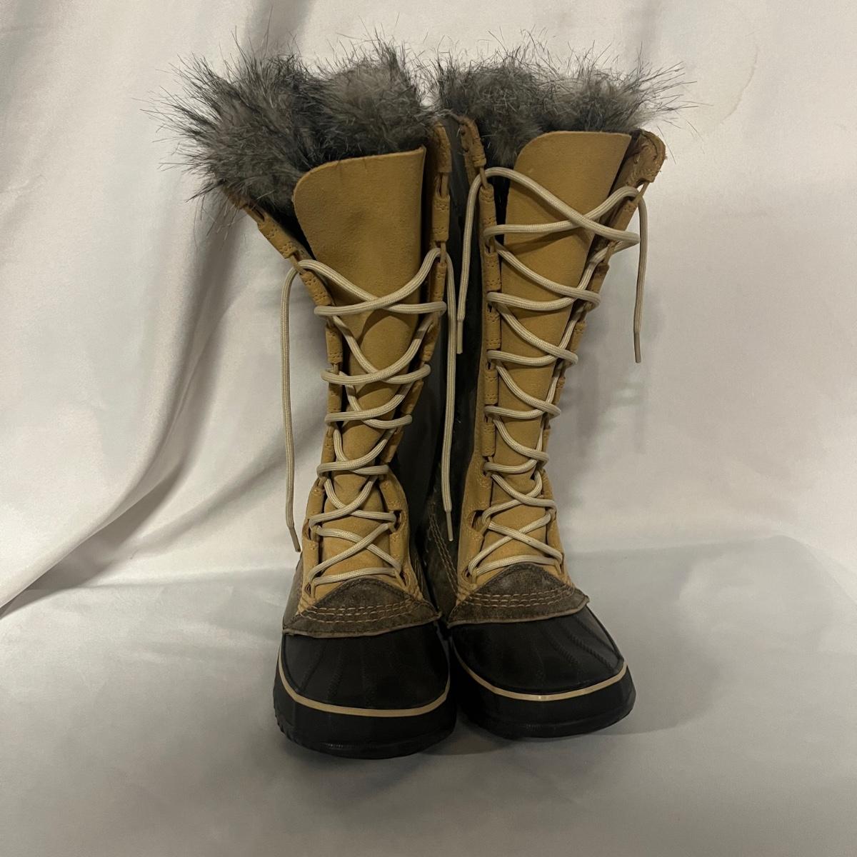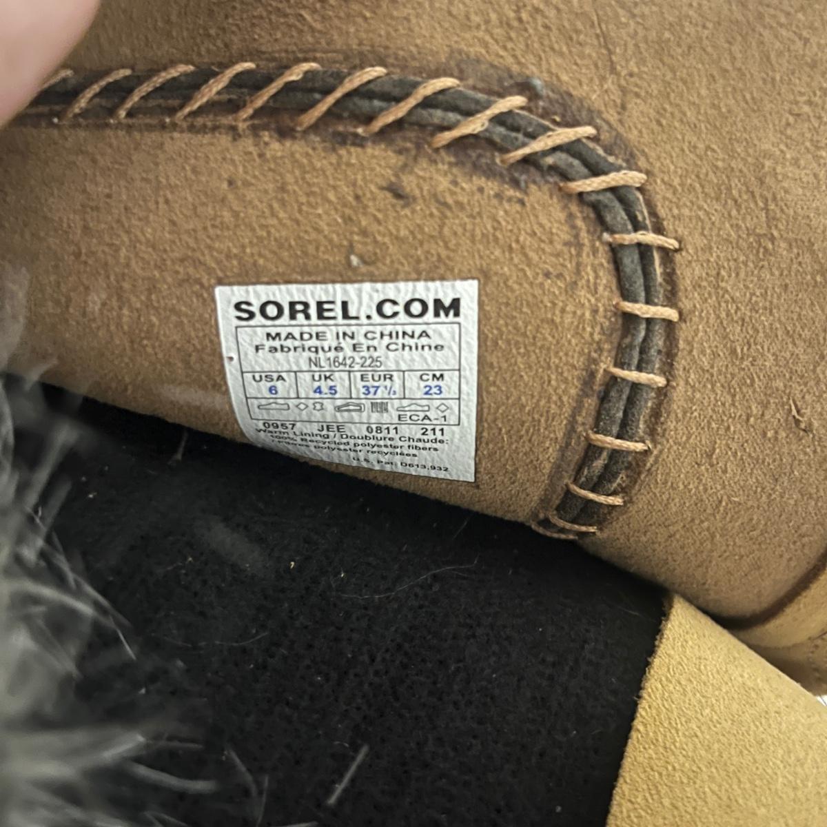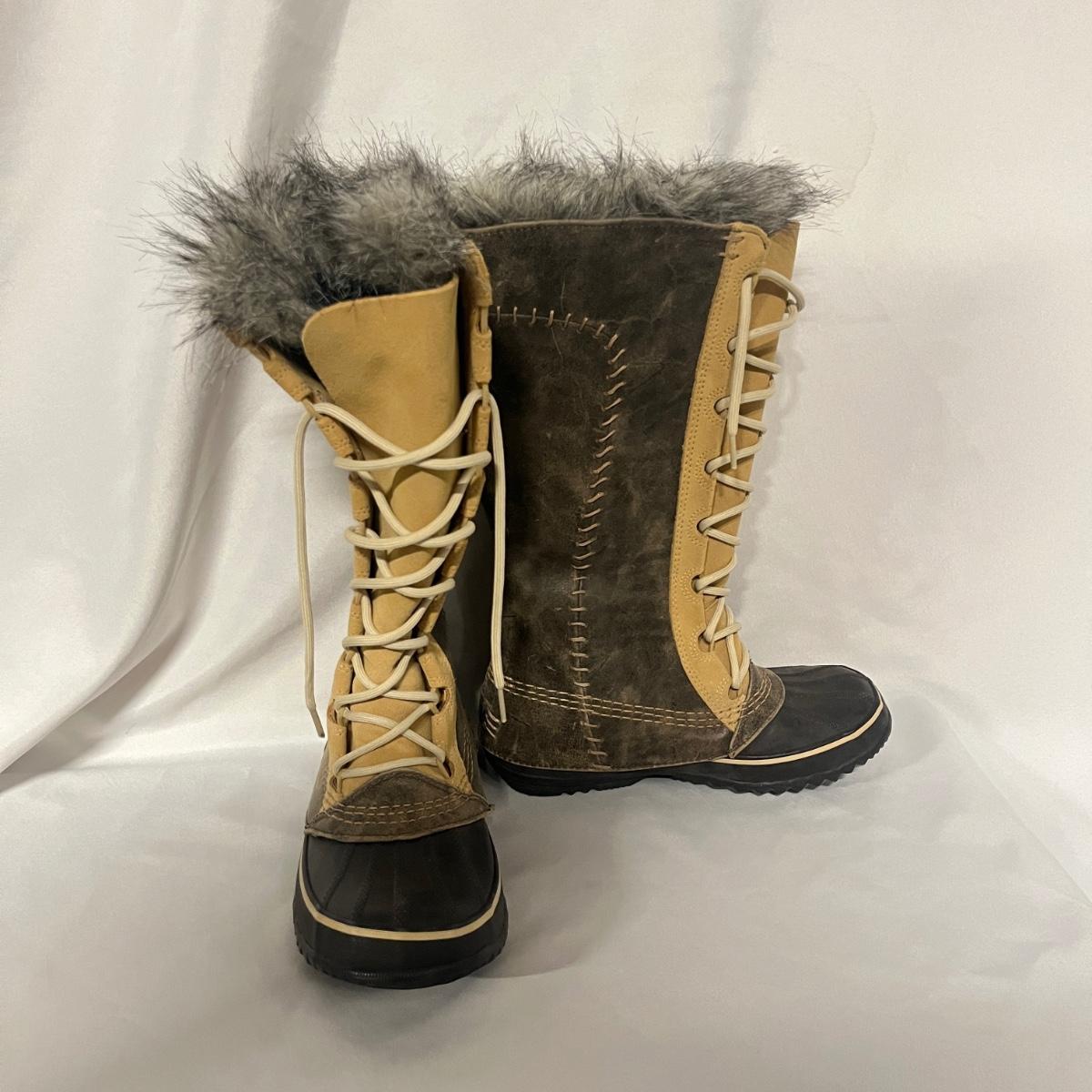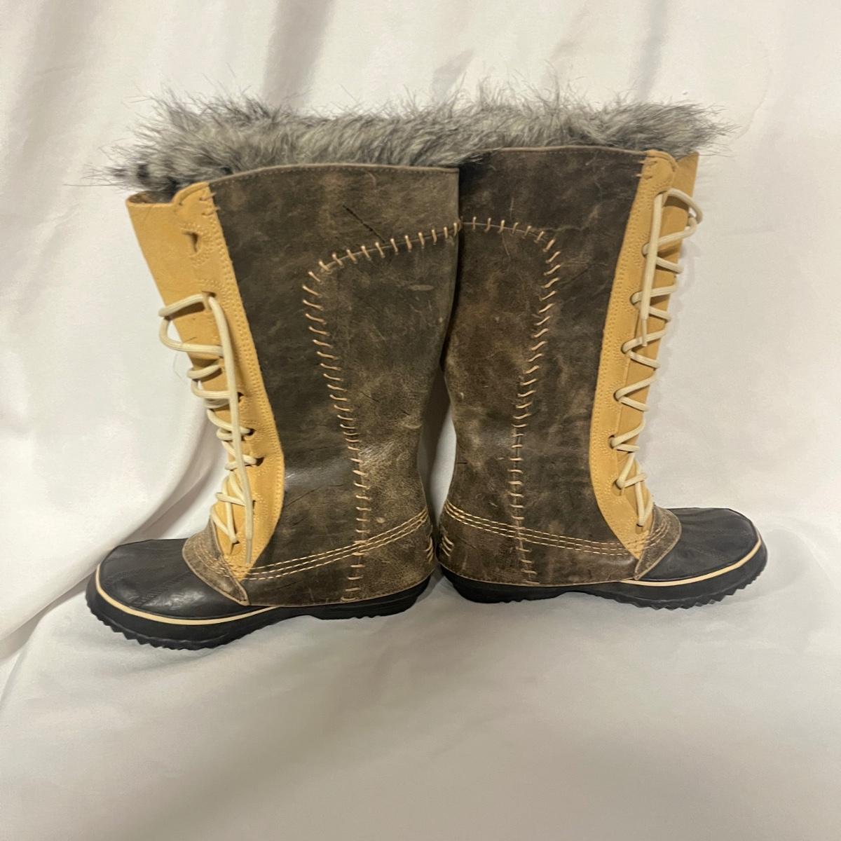 This pair of waterproof Sorel “˜Cate the Great’ mid calf lace up boots appear to be partially leather (upper section) and are a size six. They have a faux fur cuff. These boots are in excellent condition and have little to possibly no wear.