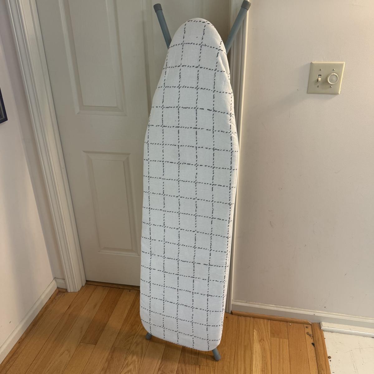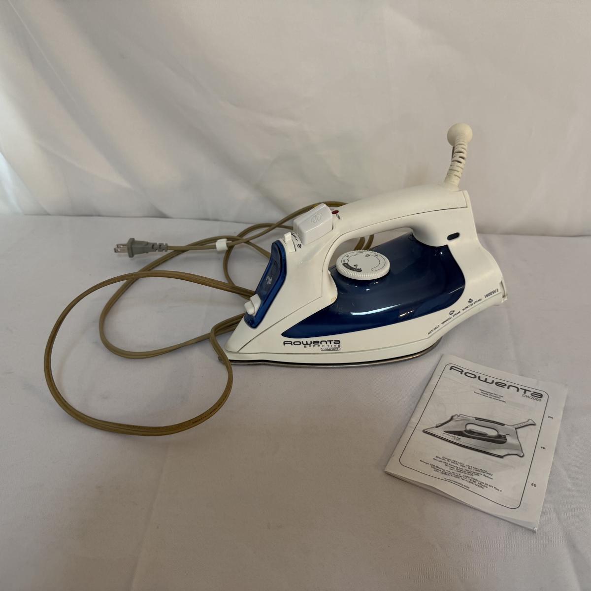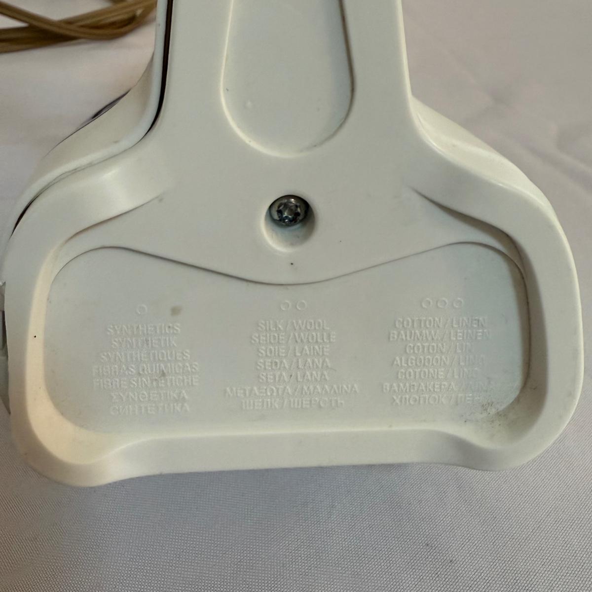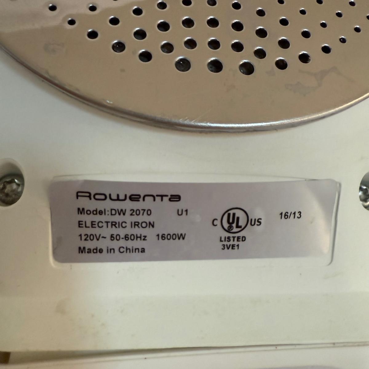 Hamper for sorting lights and darks comes with a collapsible wood base and fabric receptacle. It measures 25” x 14” x 32.5”H and has some light wear on the wood and spots on the fabric. The inside divider has a stitch that has come out, see photos. The Rowenta DW1070 Effective Comfort iron powered on when plugged in and an ironing board is included to use it with. The iron does have some damage and the base looks like it needs to get popped back into place. 60+ wood hangers are included as well.