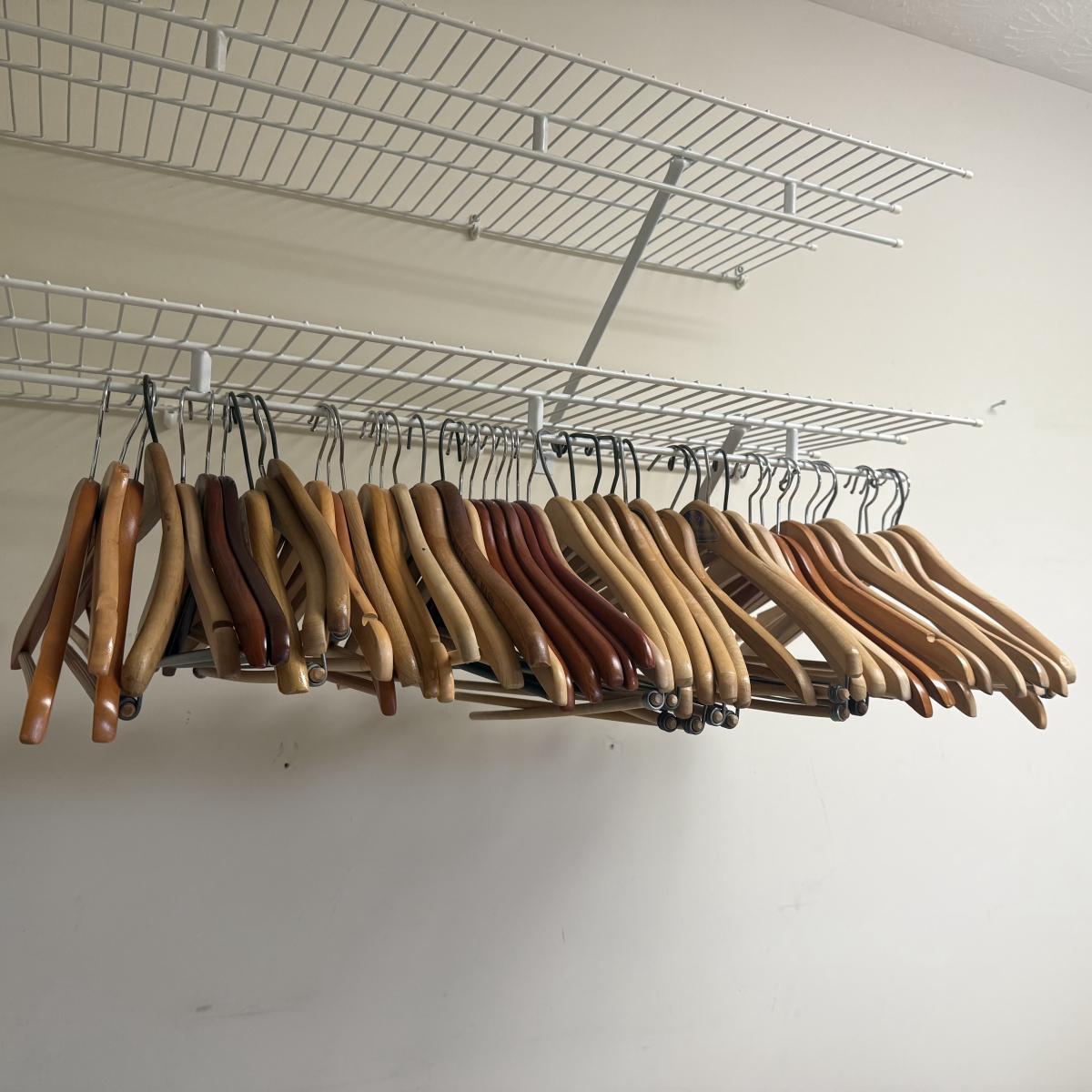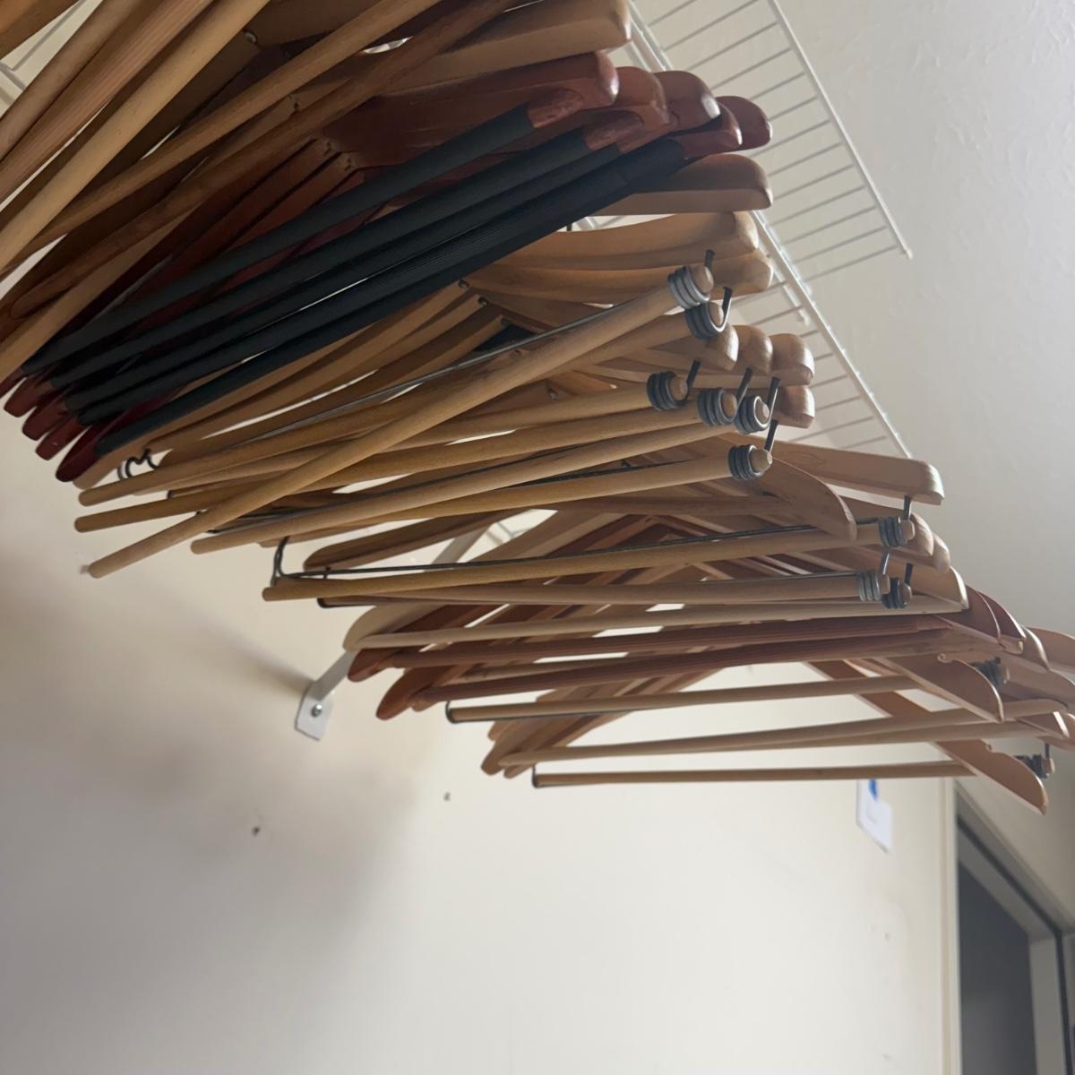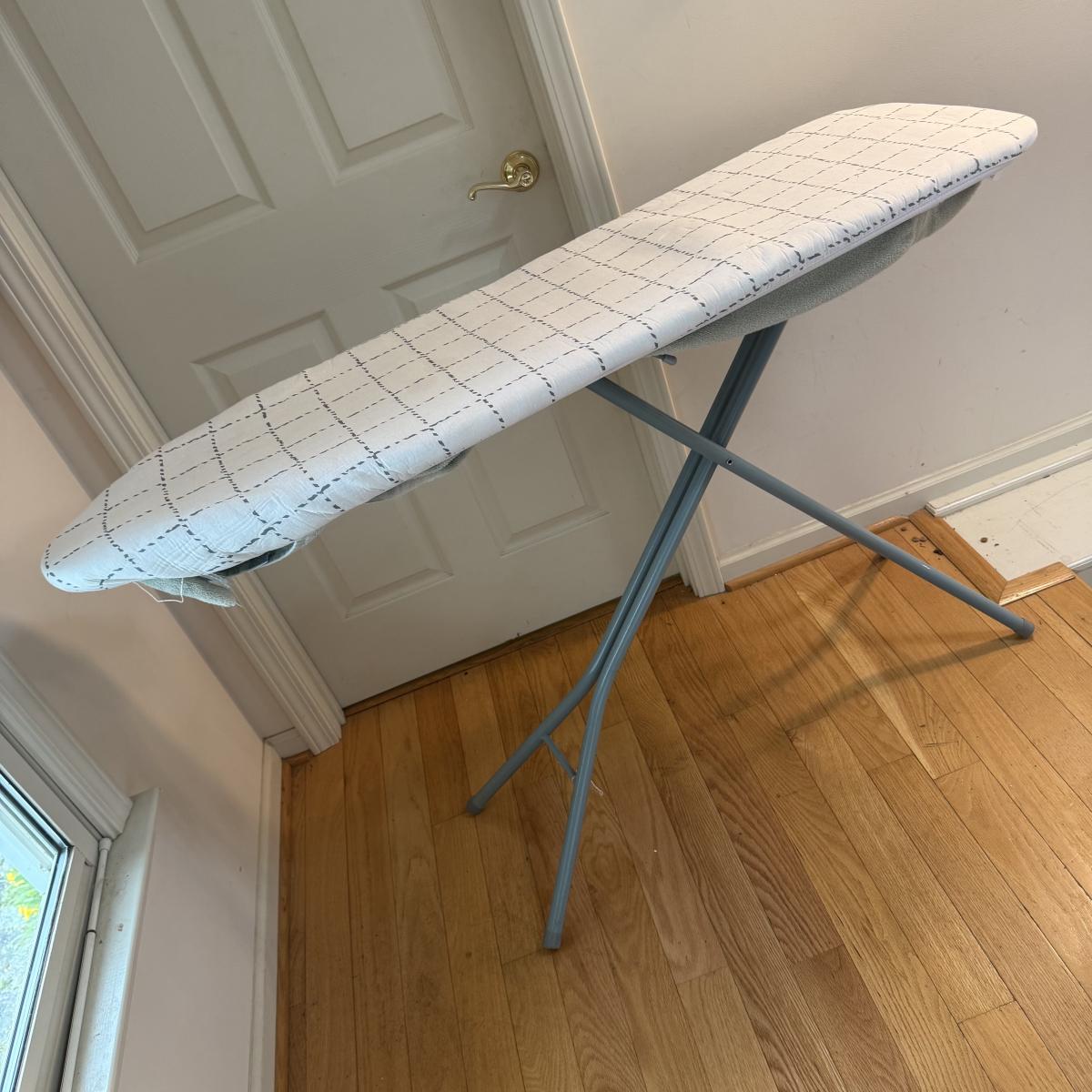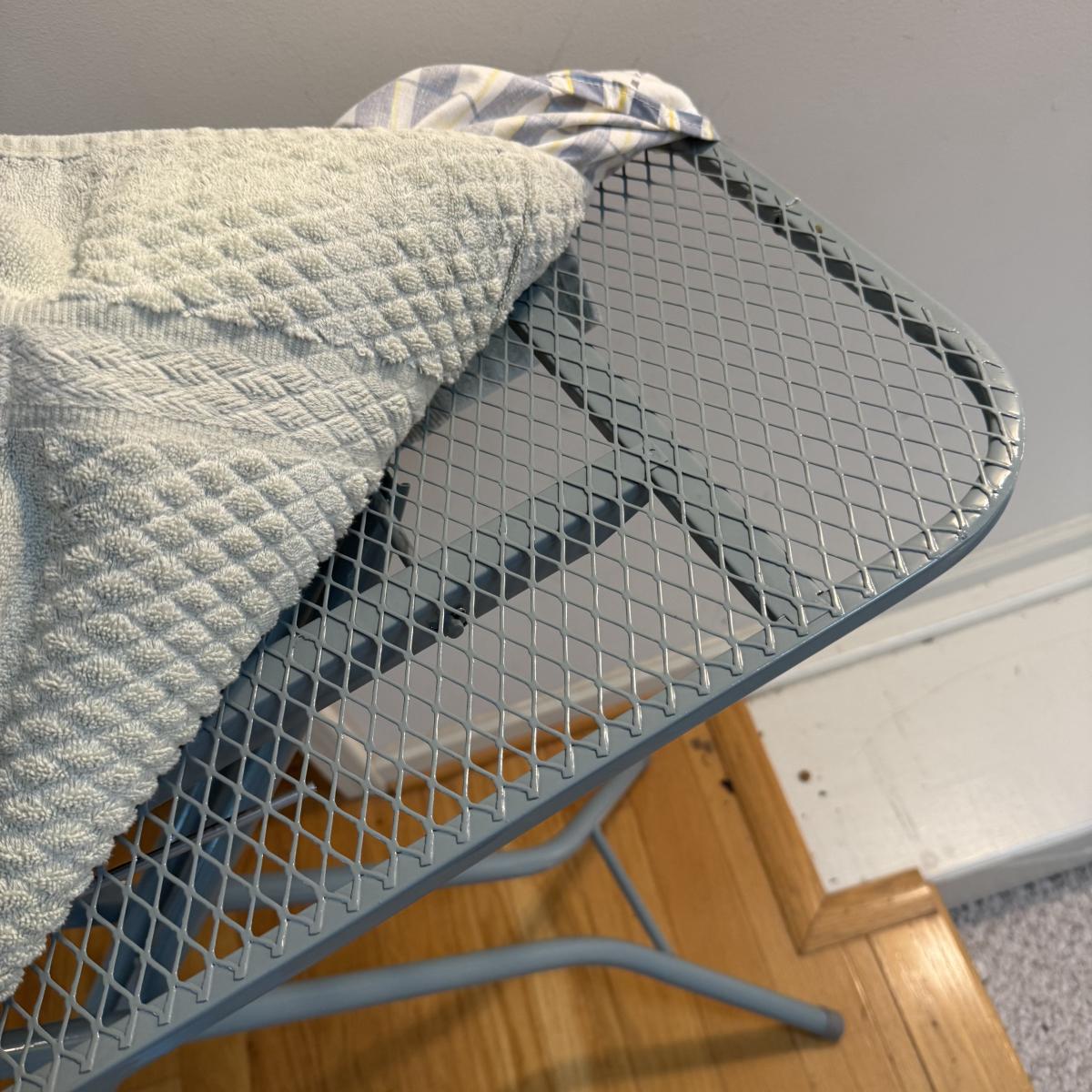 Hamper for sorting lights and darks comes with a collapsible wood base and fabric receptacle. It measures 25” x 14” x 32.5”H and has some light wear on the wood and spots on the fabric. The inside divider has a stitch that has come out, see photos. The Rowenta DW1070 Effective Comfort iron powered on when plugged in and an ironing board is included to use it with. The iron does have some damage and the base looks like it needs to get popped back into place. 60+ wood hangers are included as well.