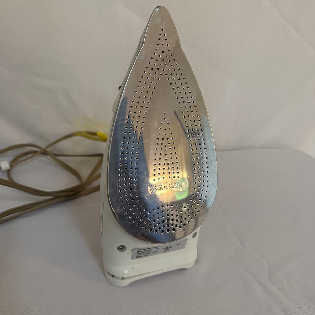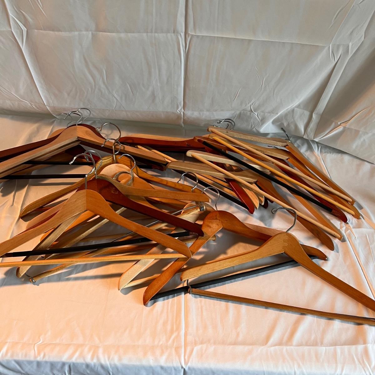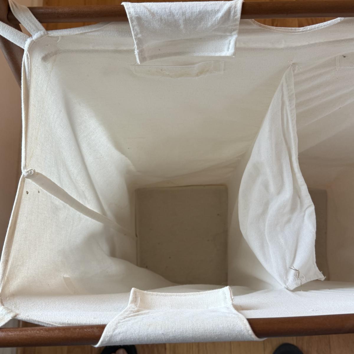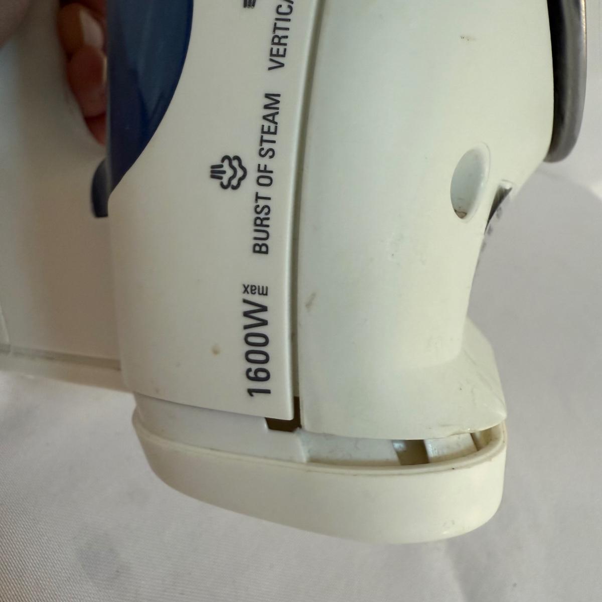 Hamper for sorting lights and darks comes with a collapsible wood base and fabric receptacle. It measures 25” x 14” x 32.5”H and has some light wear on the wood and spots on the fabric. The inside divider has a stitch that has come out, see photos. The Rowenta DW1070 Effective Comfort iron powered on when plugged in and an ironing board is included to use it with. The iron does have some damage and the base looks like it needs to get popped back into place. 60+ wood hangers are included as well.