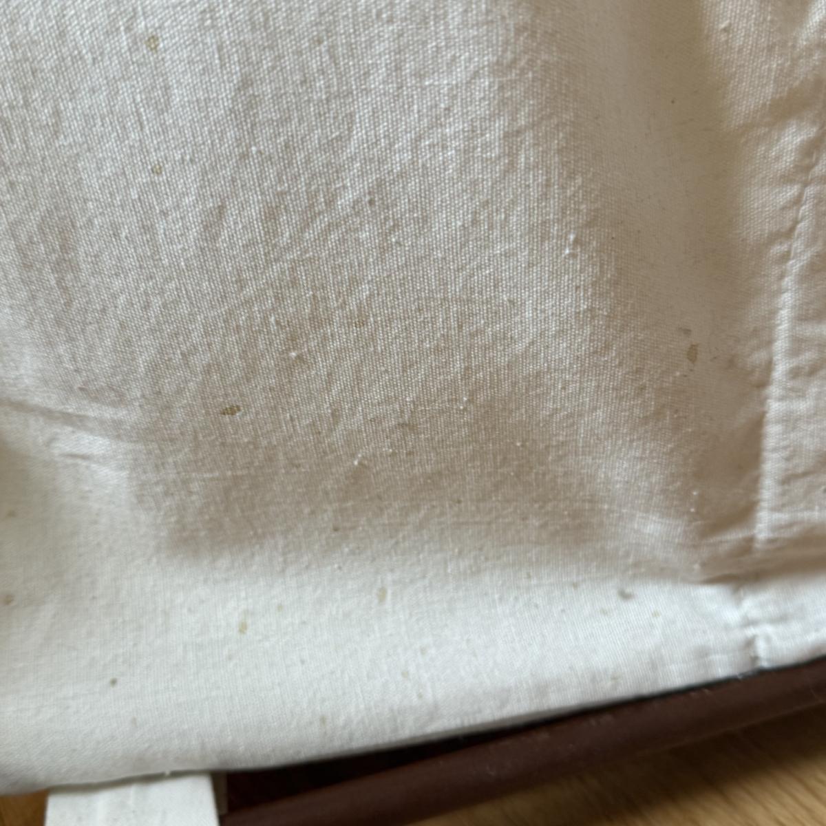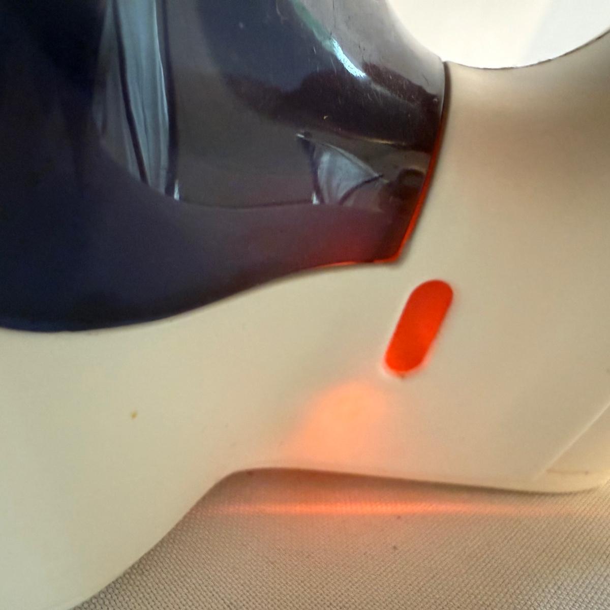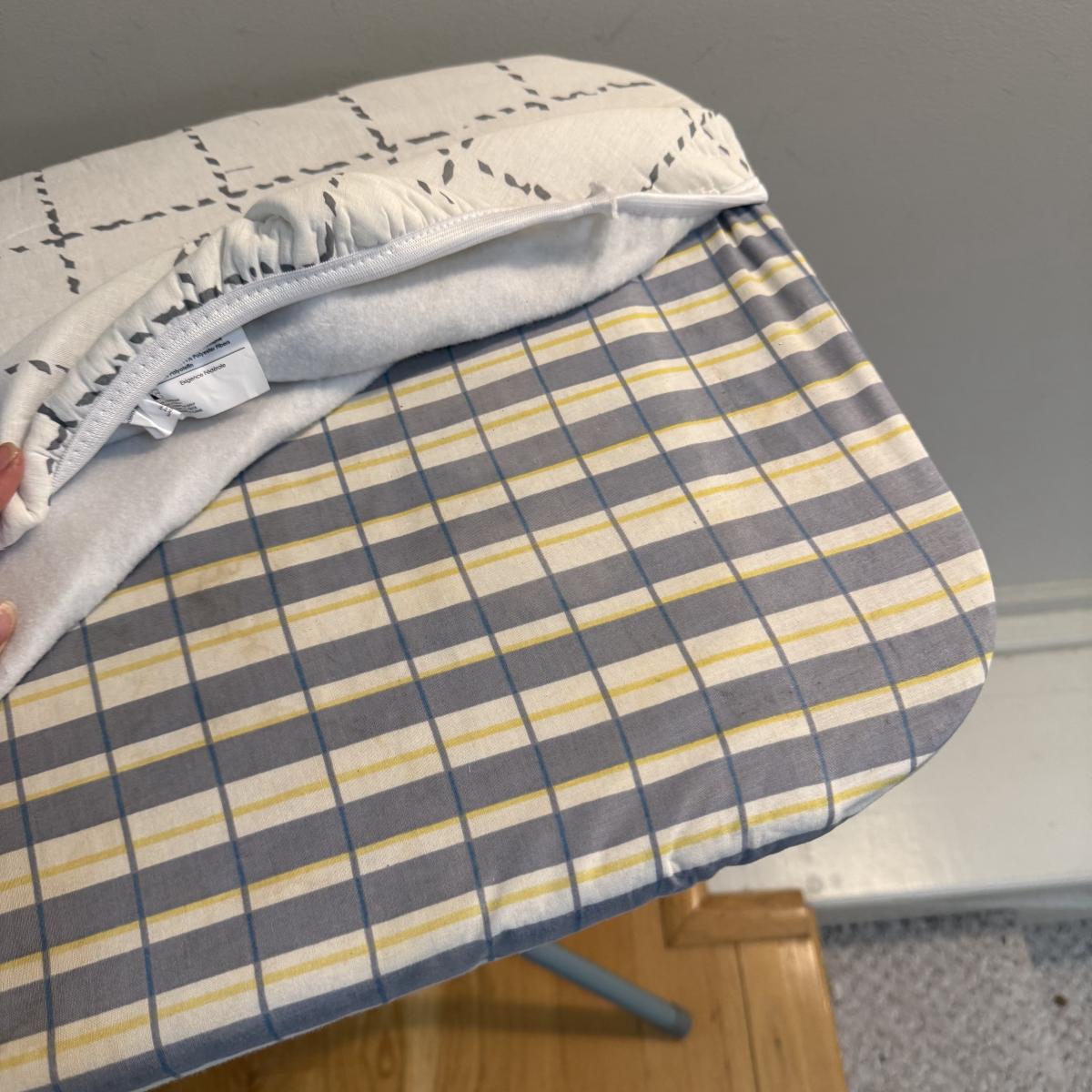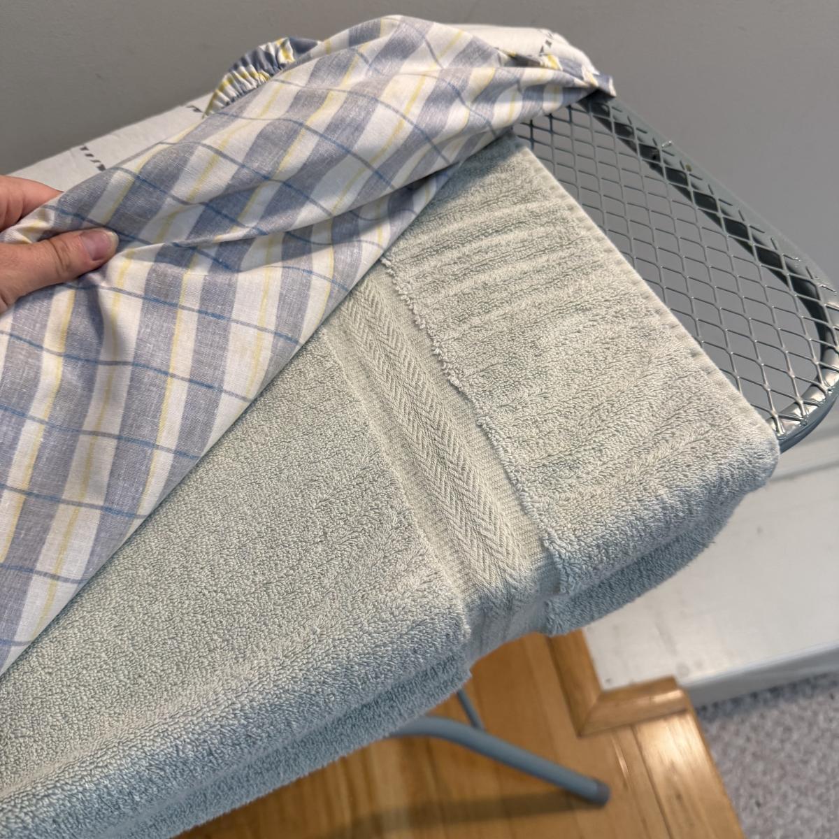 Hamper for sorting lights and darks comes with a collapsible wood base and fabric receptacle. It measures 25” x 14” x 32.5”H and has some light wear on the wood and spots on the fabric. The inside divider has a stitch that has come out, see photos. The Rowenta DW1070 Effective Comfort iron powered on when plugged in and an ironing board is included to use it with. The iron does have some damage and the base looks like it needs to get popped back into place. 60+ wood hangers are included as well.