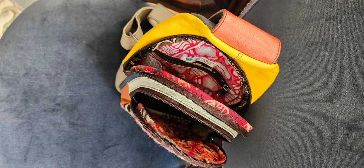 Colorful little bag with 2 zippered compartments.