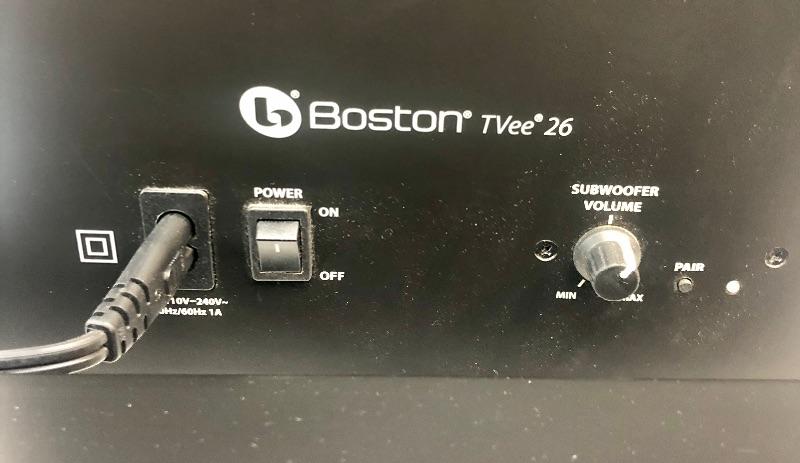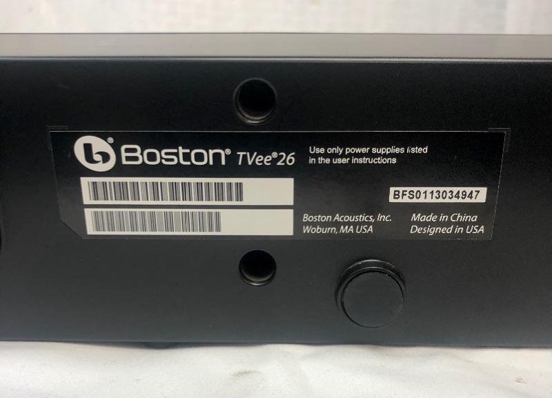 Boston Acoustics TVee 26 sound bar and subwoofer for connection to flat screen TV. Connects via Bluetooth. Missing remote, but replacements are available.
