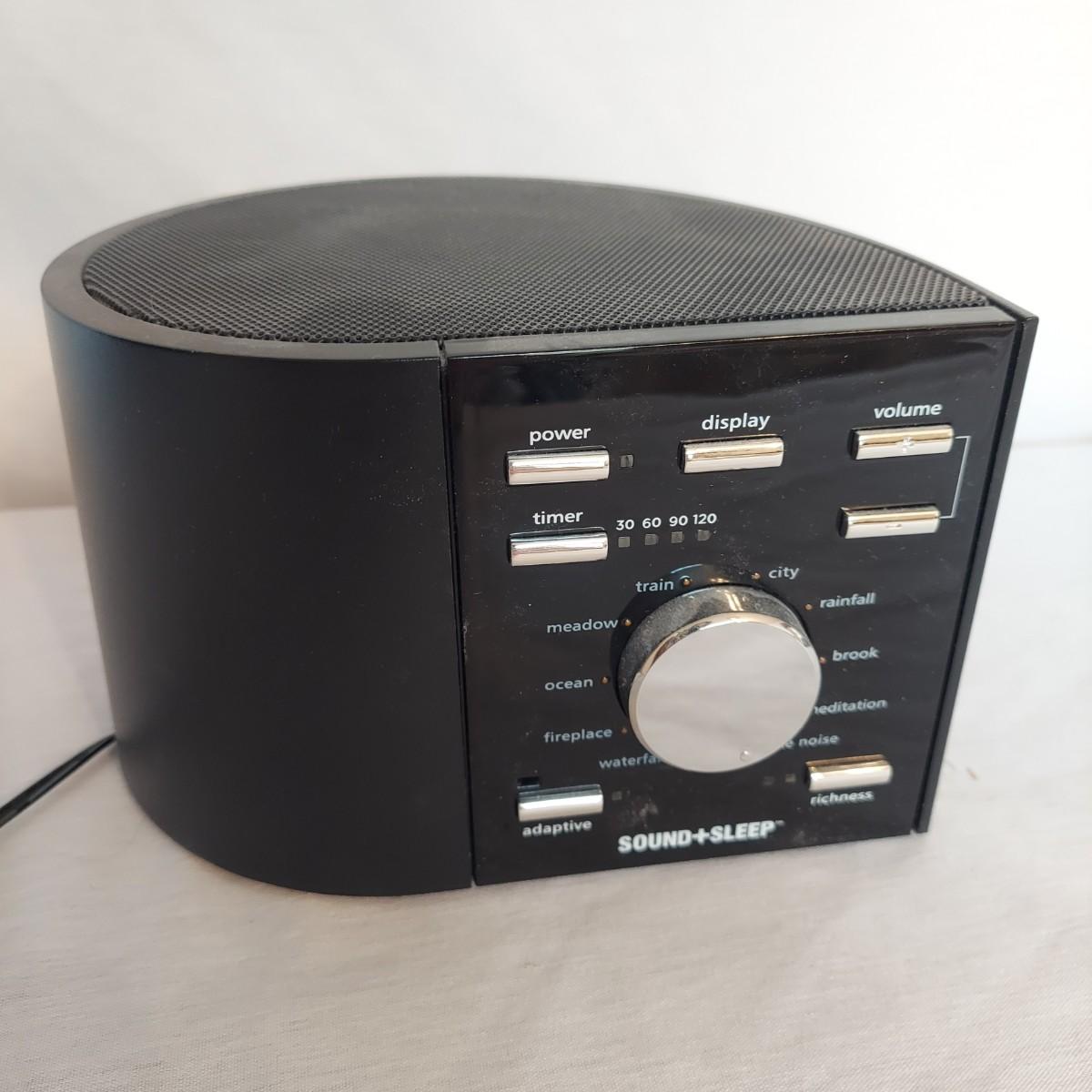 Sound + Sleep sound machine measures 7.5” x 5.5” x 6.5"H. Powered on when plugged in. Also included is a hardcover copy of “The Element Encyclopedia of 20,000 Dreams” by Theresa Cheung. Shipping available