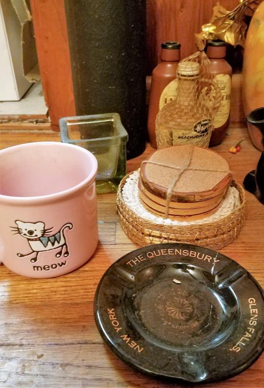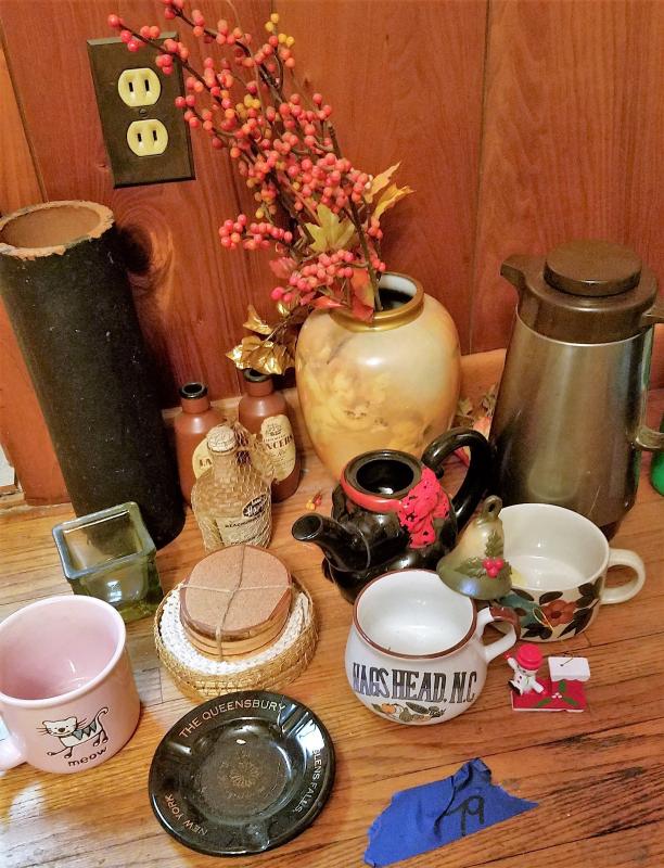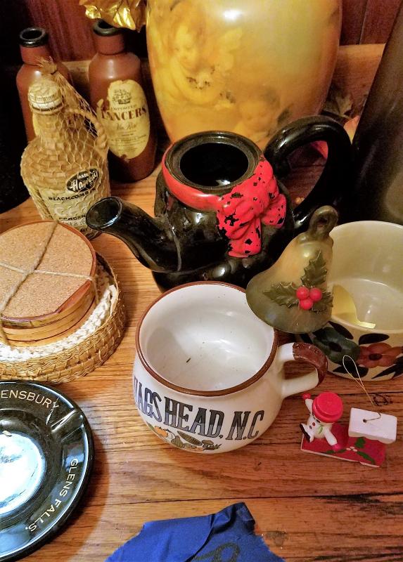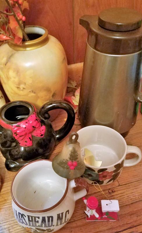 See the pictures, soup cups, from North Carolina, coasters, vase with flowers, and coffee carafe. NOTE ***This soup cup matches another set found later after posting so please find matching #29 lot for all 4.**** CAT HEAD IS FOUND!!! don't despair it's in the basement so you can have your kitty teapot!!