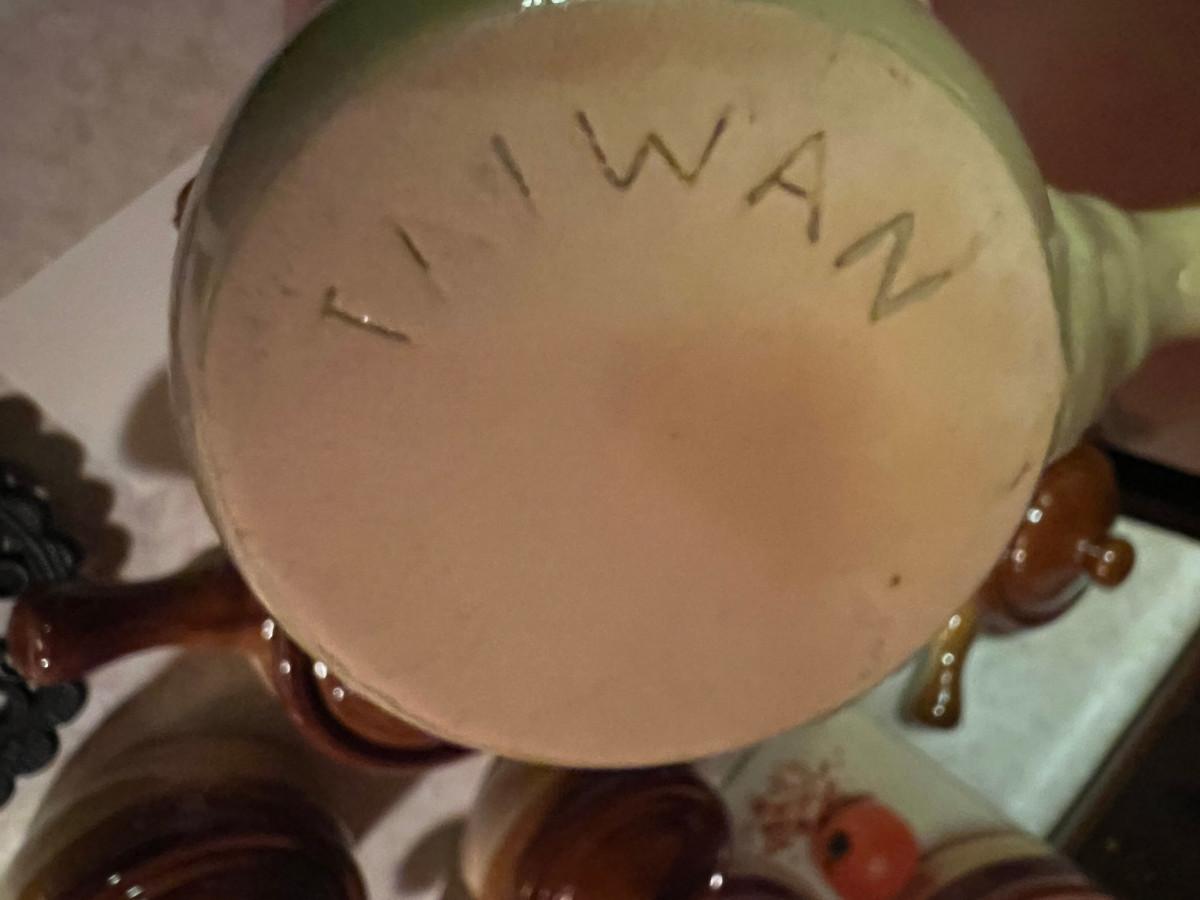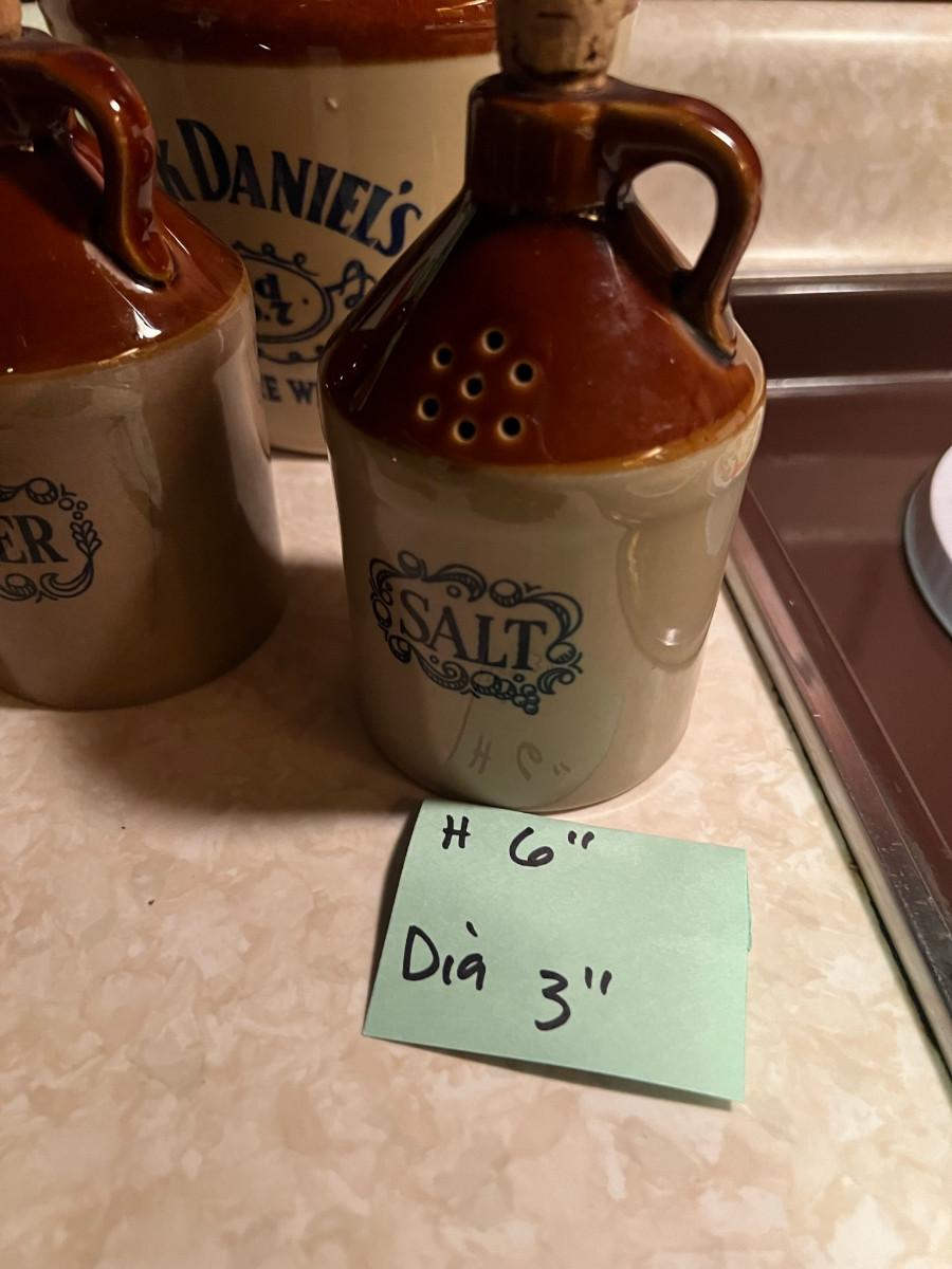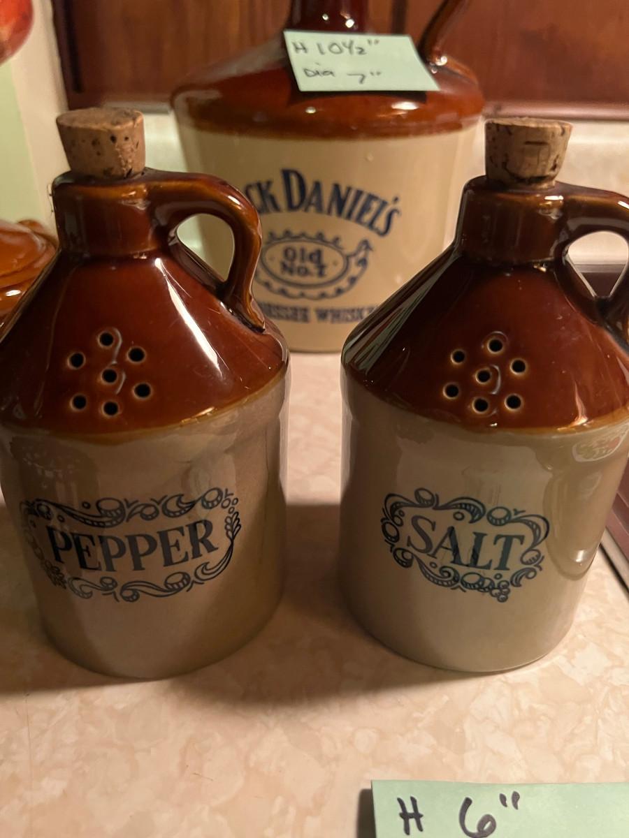 Soup Crocks 4" x 5" x 7.5" made in Taiwan, Jack Daniels Jug large Made in USA 10.5" x 7", and Salt and Pepper shakers jugs 6" x 3" (pepper has hairline crack) and 3 black trivets 9" x 6"