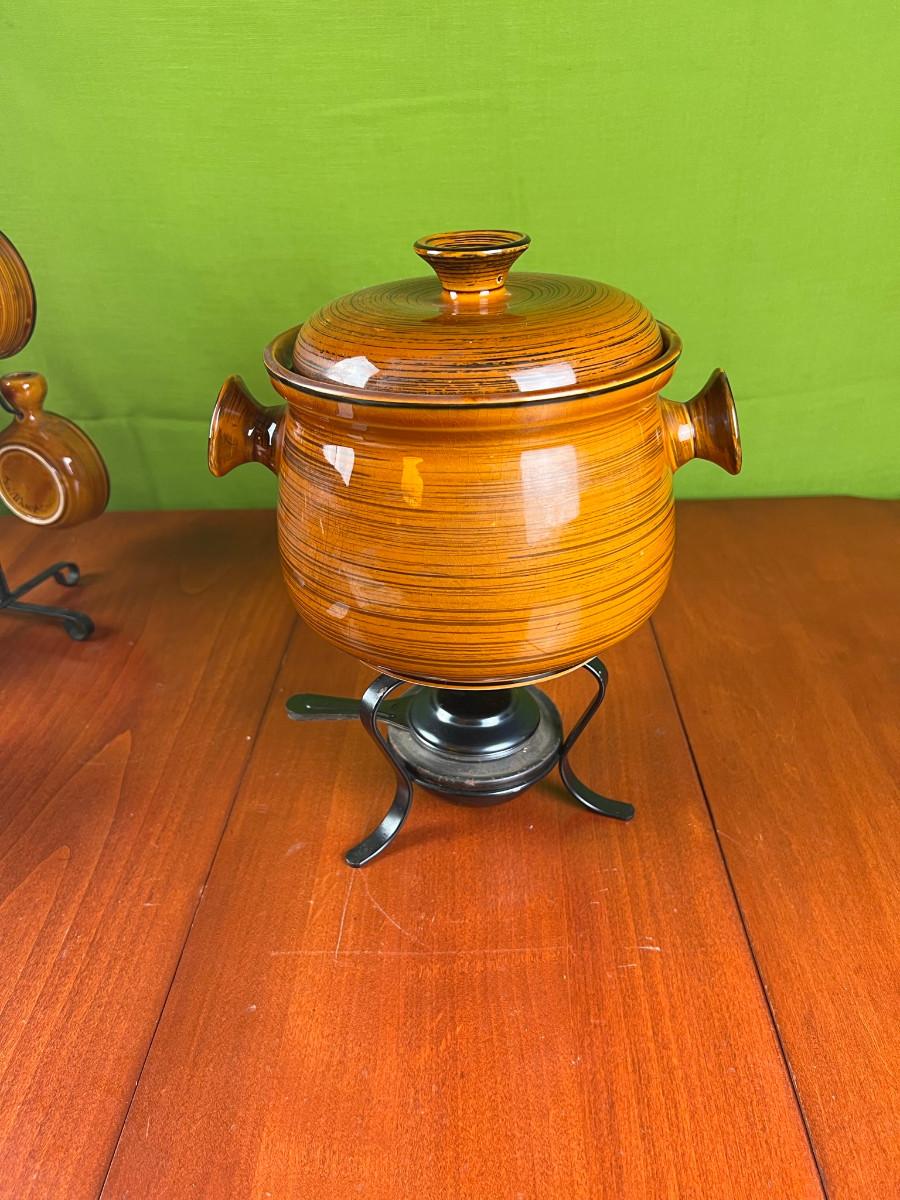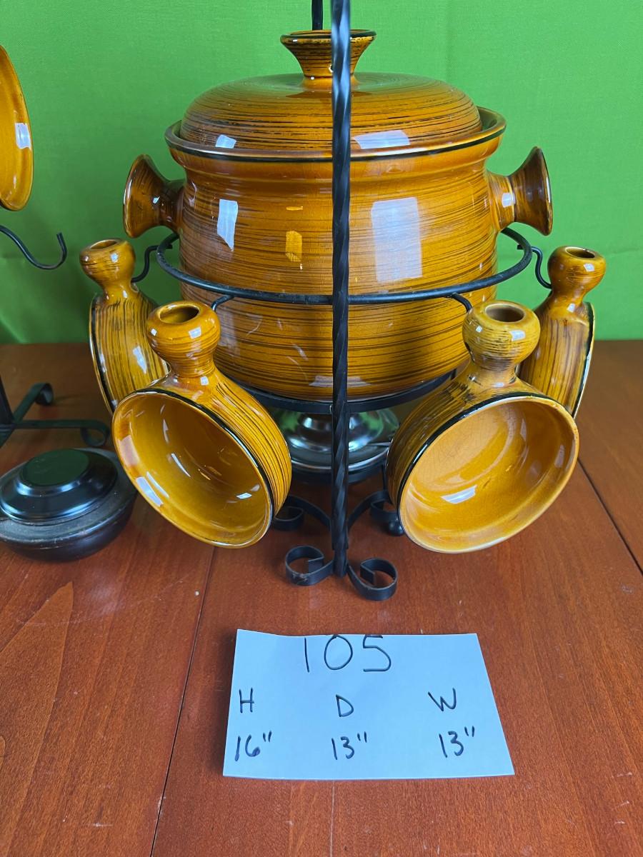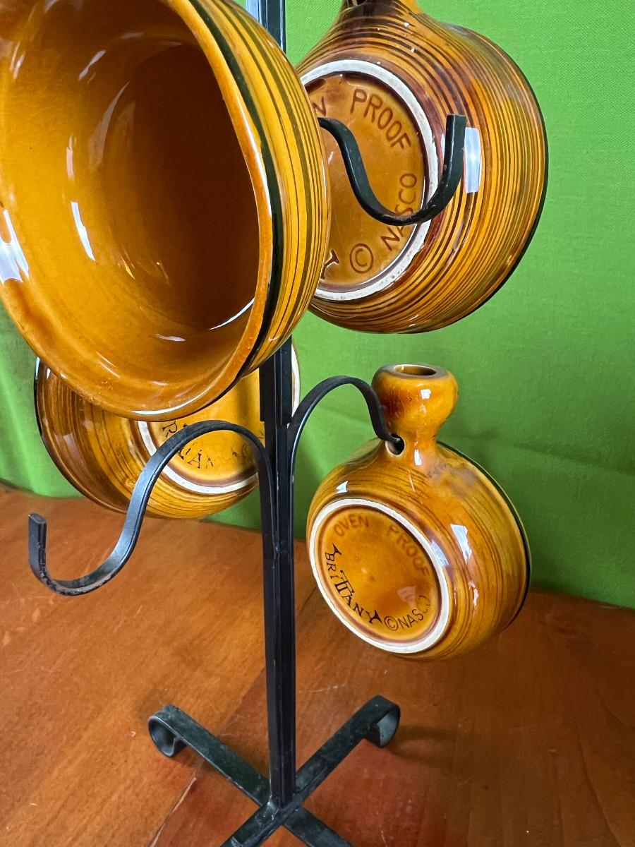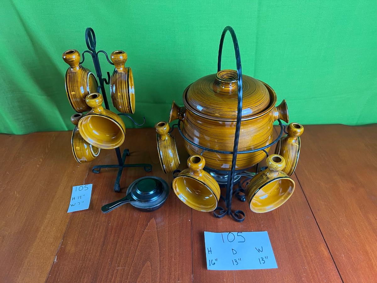 Brittany oven-proof NASCO 1 pot with lid, 10 bowls, 2 racks (1 bowl has a chip) extra rack with bowls 15" x 7"