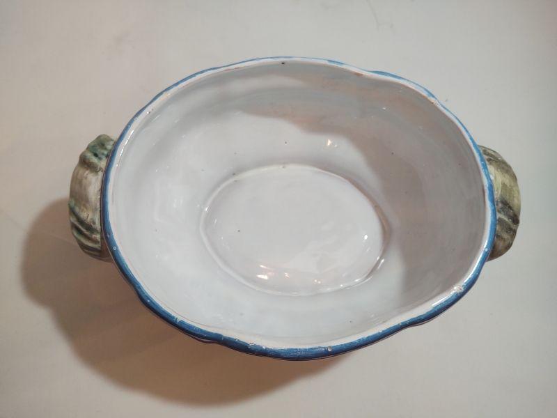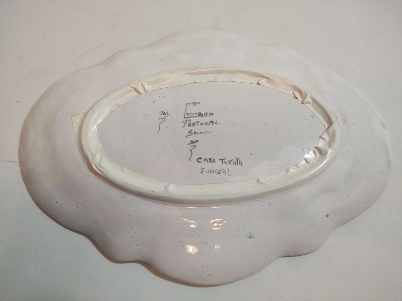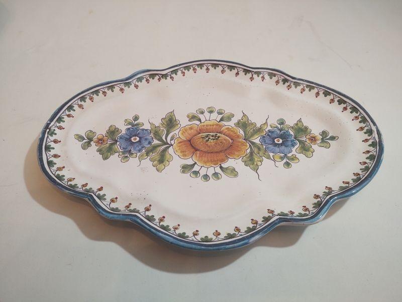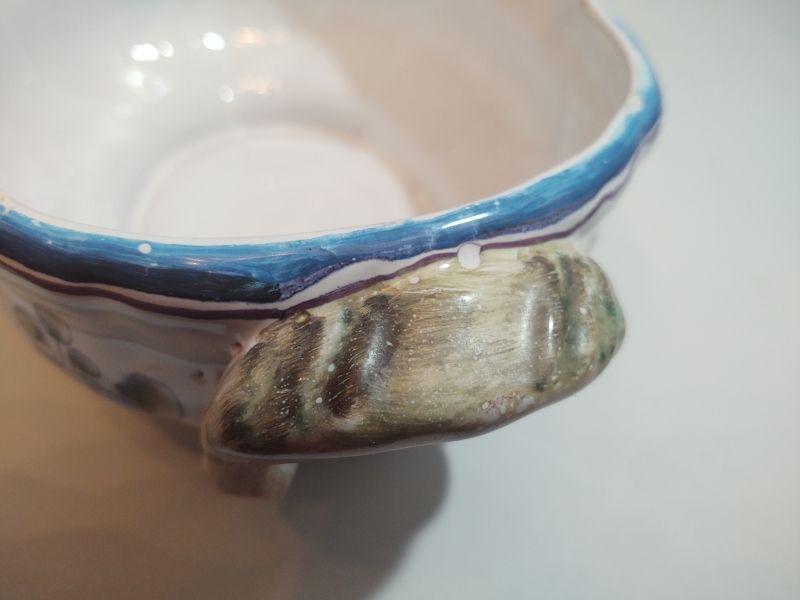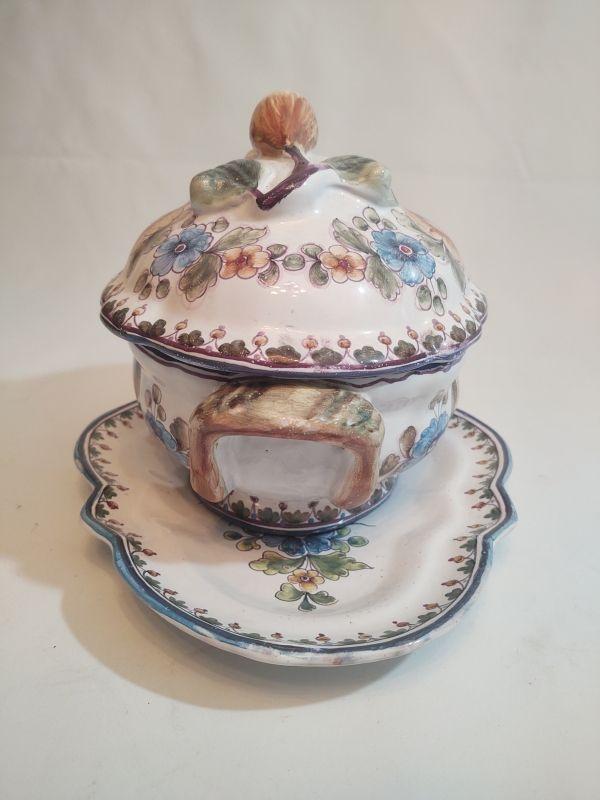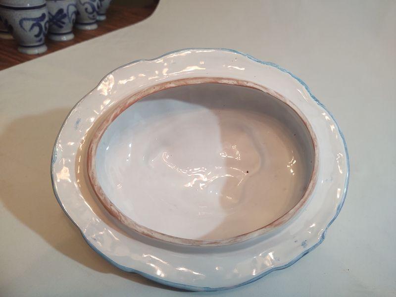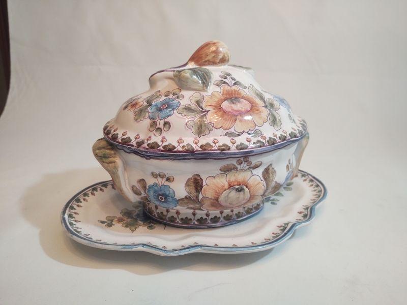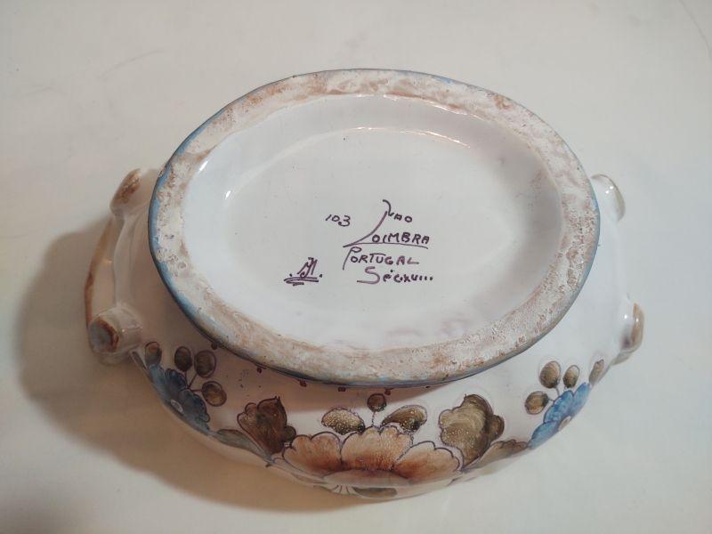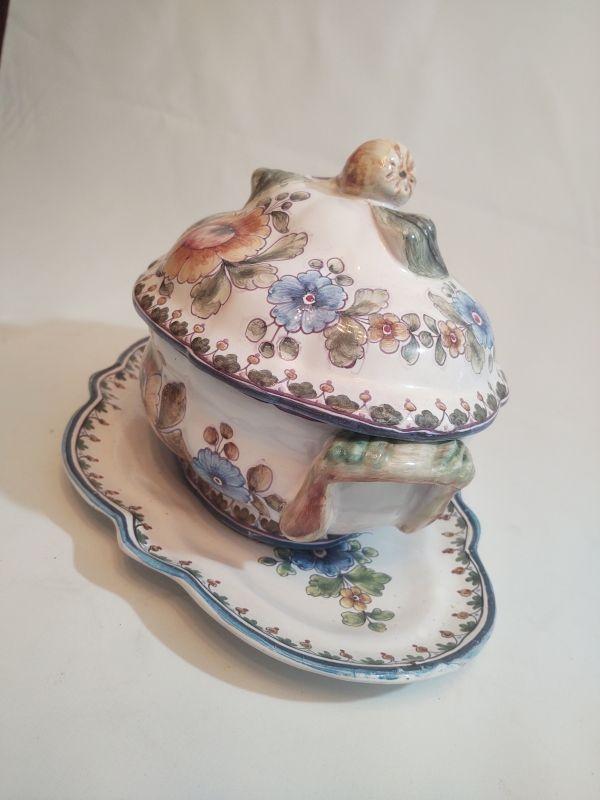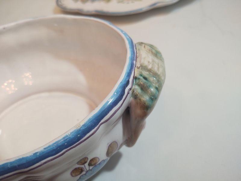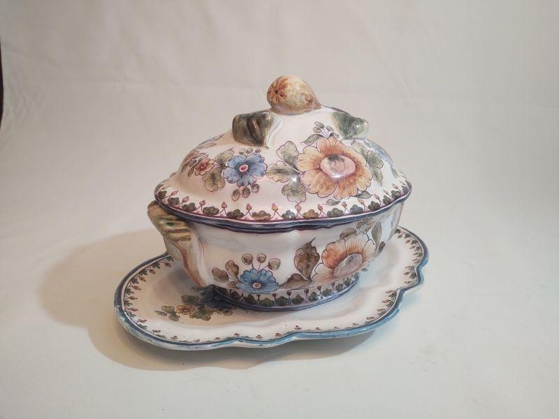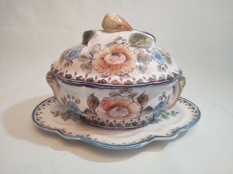 Hand-painted soup tureen and undertray were made in Portugal according to the inscription on the underside of both. There are a couple of chips on the top edge. Please inspect pictures for location and size of blemishes.