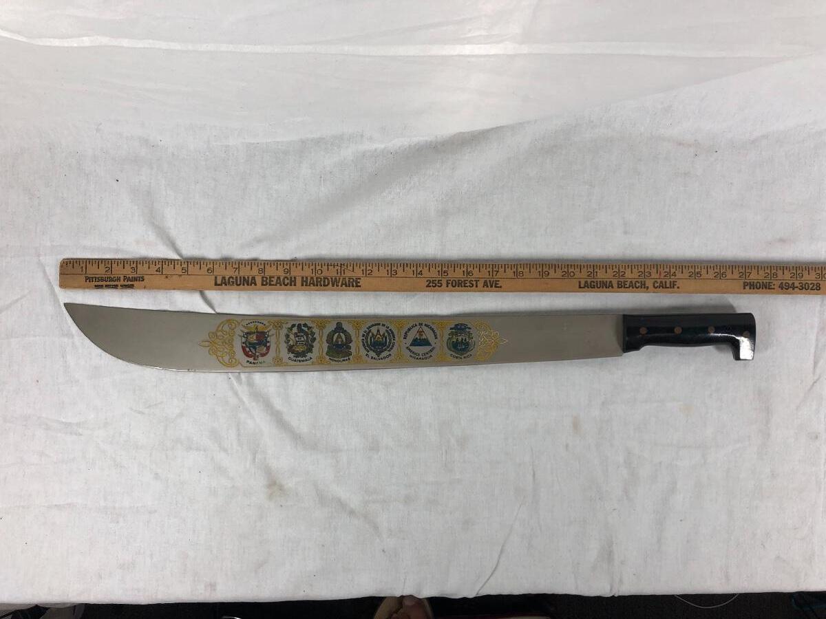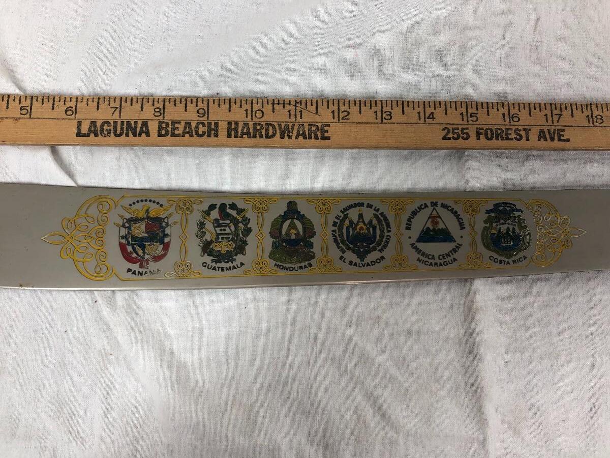 Decorated machete sword. Made in El Salvador. Features Panama, Guatemala, Honduras, El Salvador, Nicaragua, and Costa Rica emblems. Meant for display.