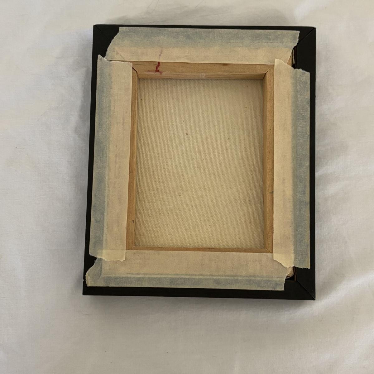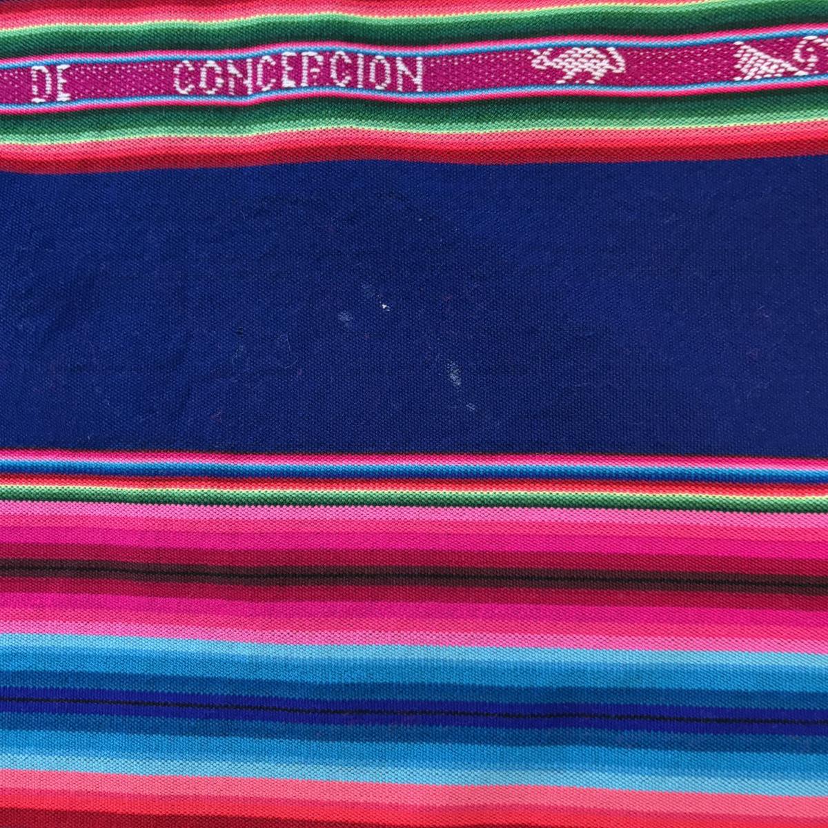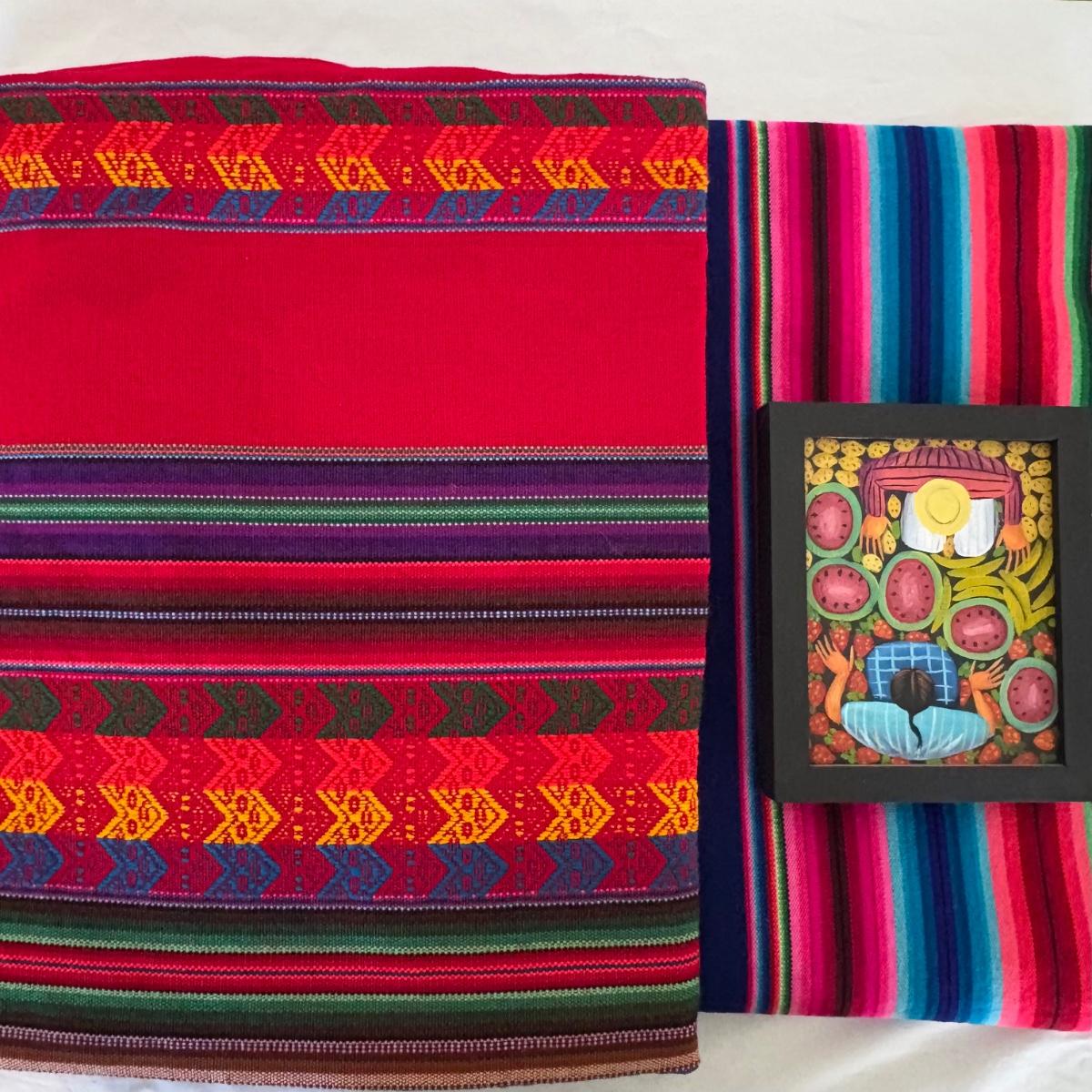 This lot includes 2 textiles and a framed canvas painting that appears to be in the style of South American Folk Art. The bigger textile, which is purple, pink, and green, has measurements of approximately 52" x 55"H. Both textiles show signs of wear. The framed canvas painting had measurements of approximately 5" x 6"H.